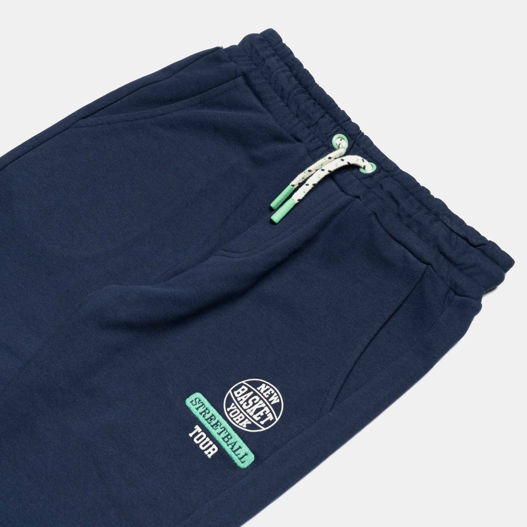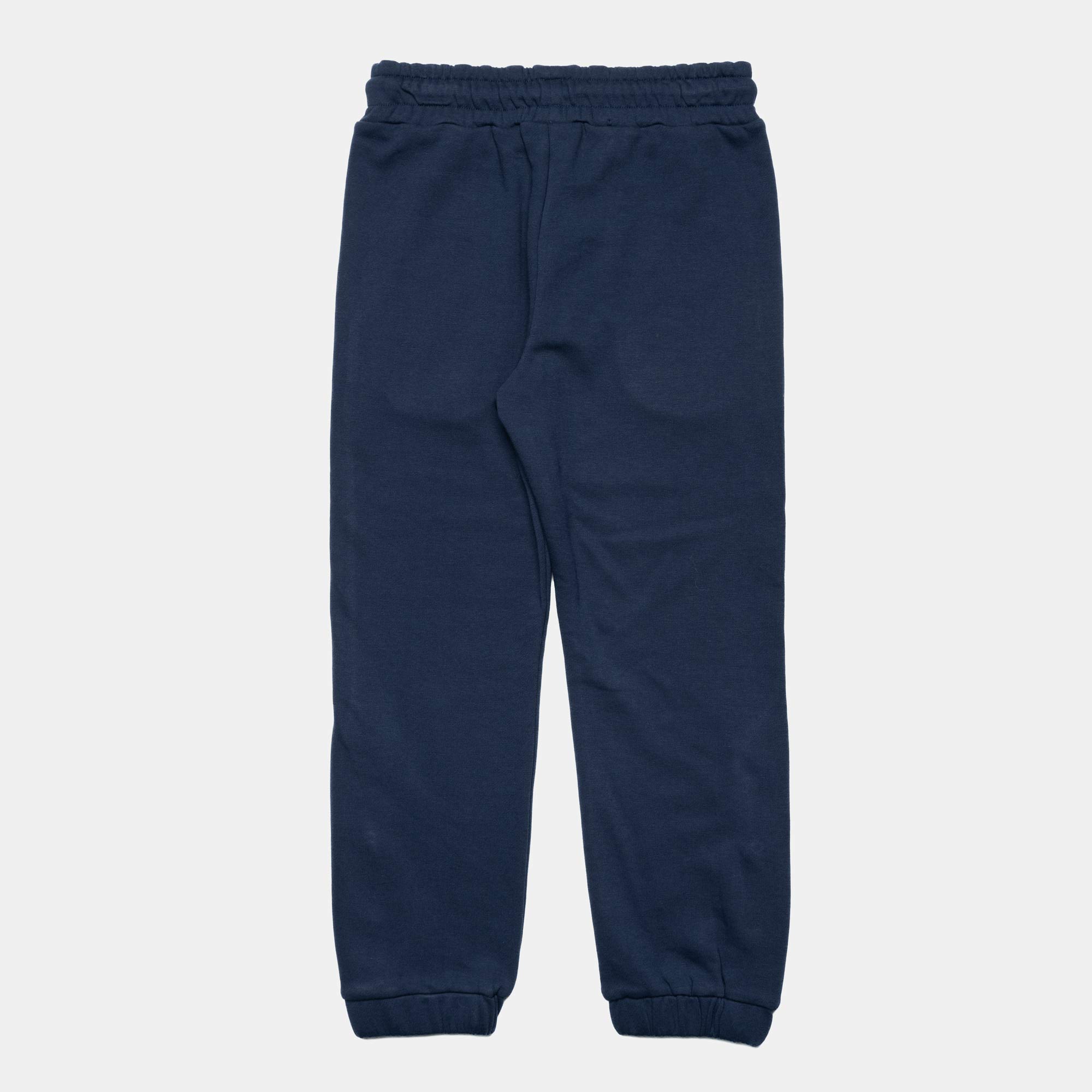 Trousers in fleece with elastic waist and front laces. French pockets and printing with embroidery on the front. Elastic bottom with automatic buttons.