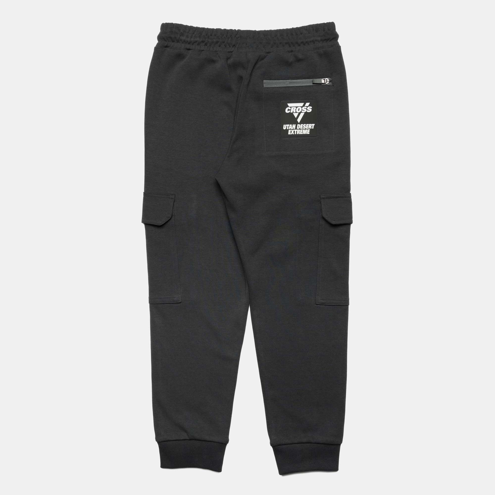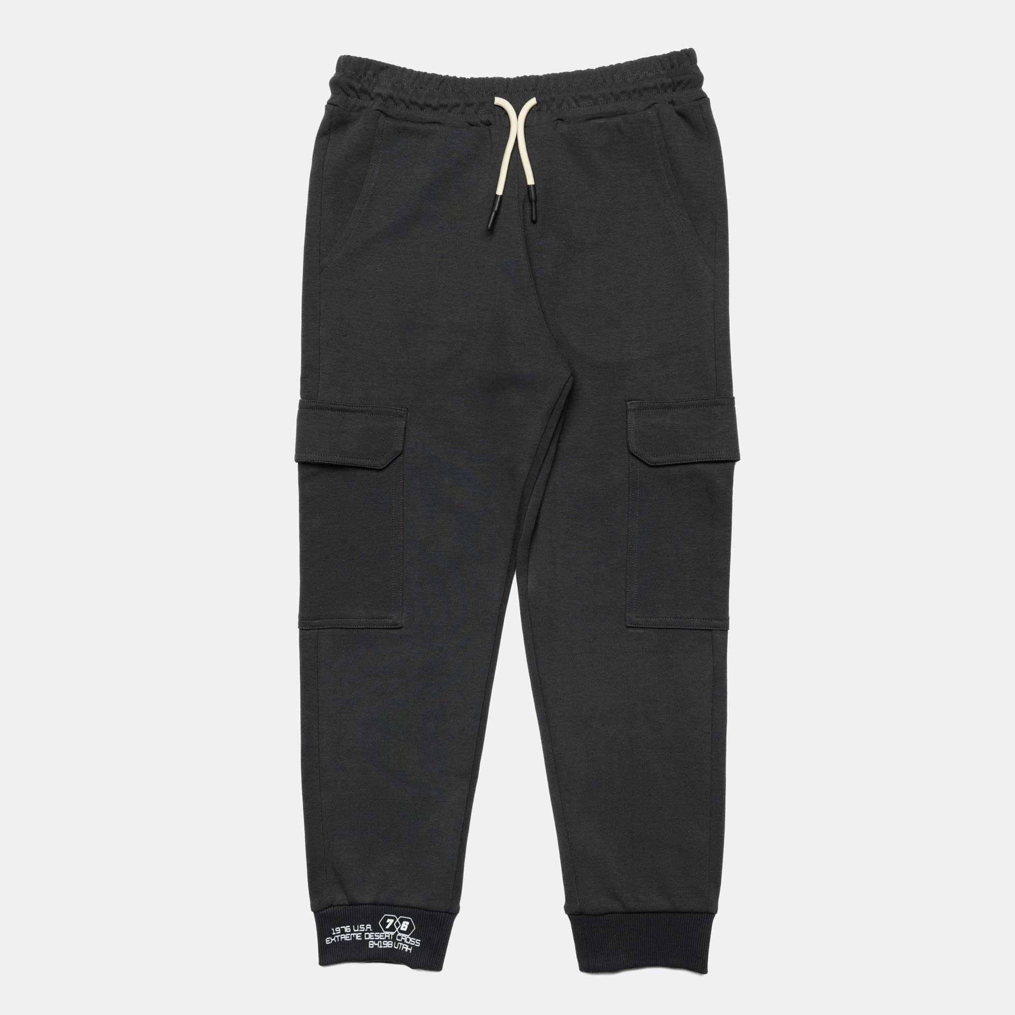 Trousers in interlock with elastic waist and front laces. French pockets on the front and big pockets on the sides. Pocket with zip and rubber patch on the back. Bottom ribbed with wording printed rubber effect.