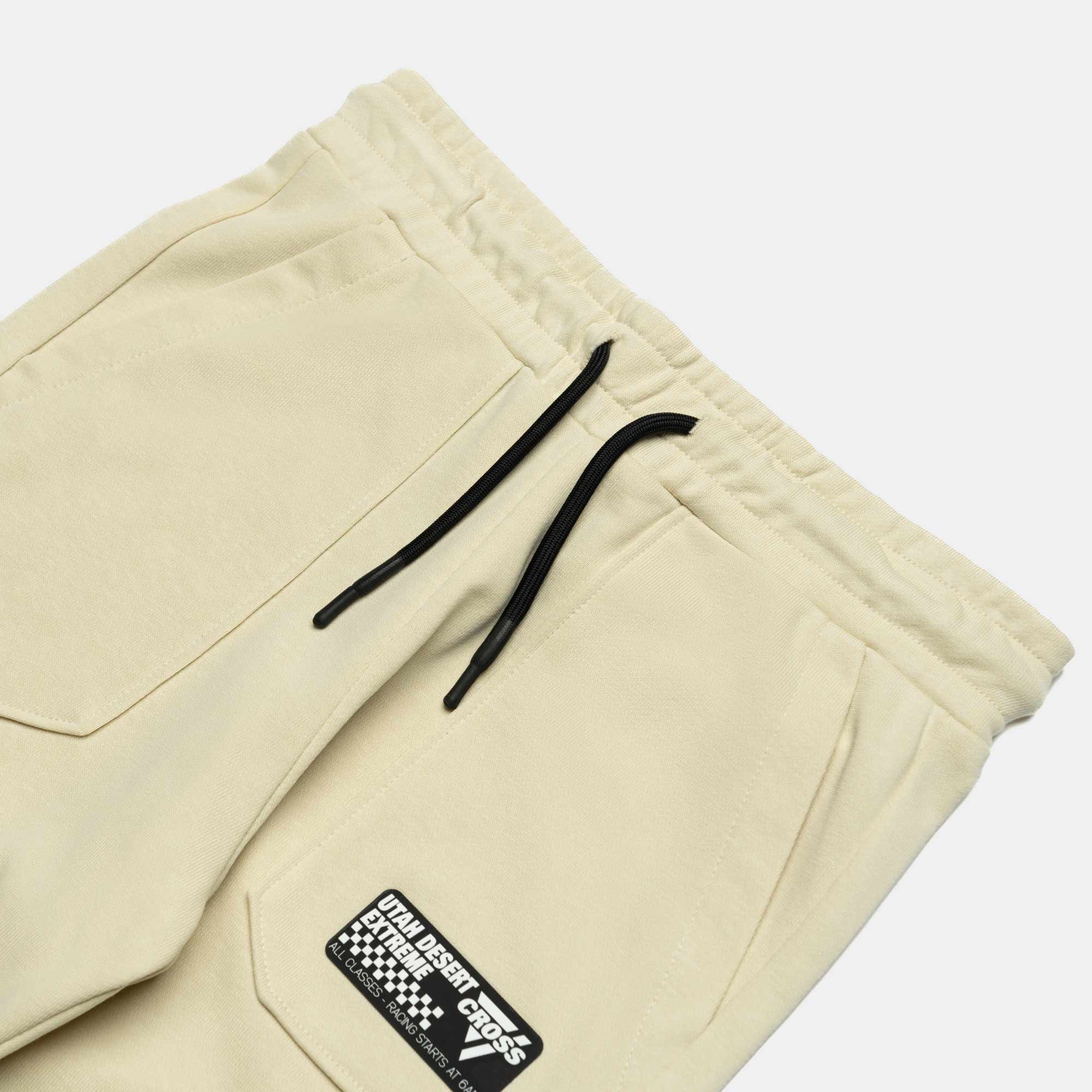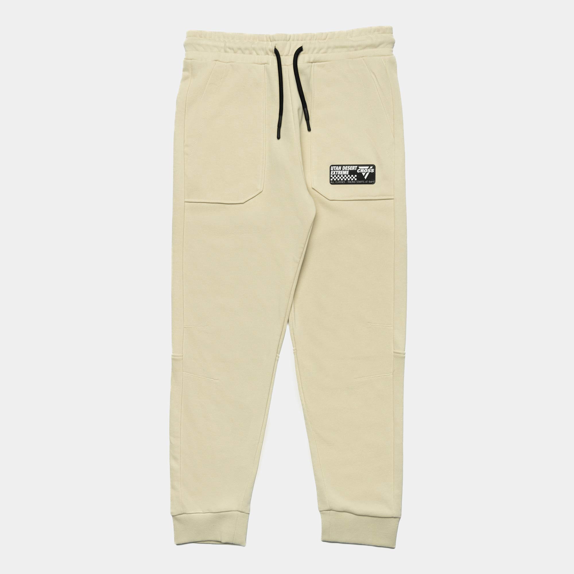 Trousers in fleece with elastic waist and front laces. Pockets on the front with rubber patch. Ribbed bottom.
