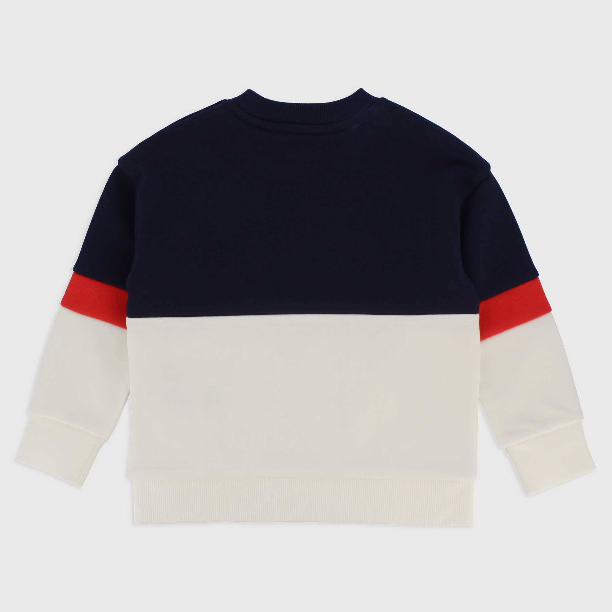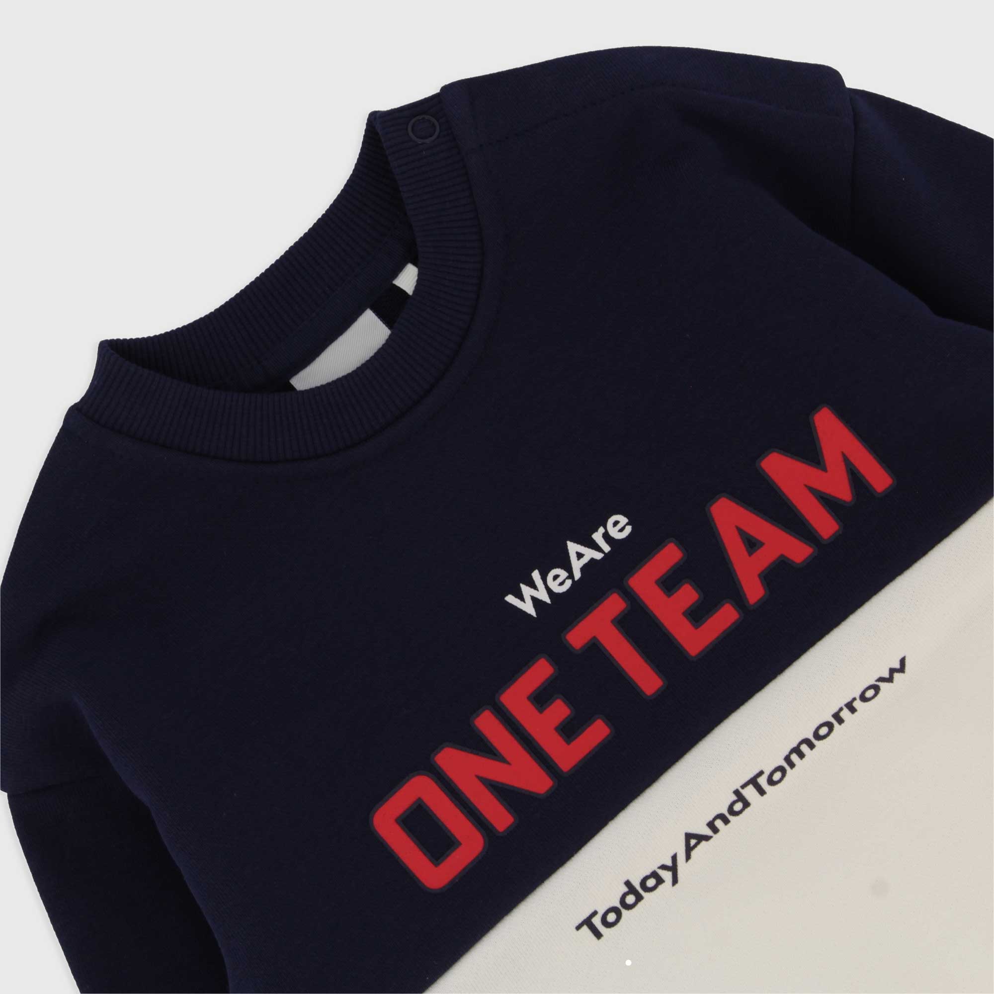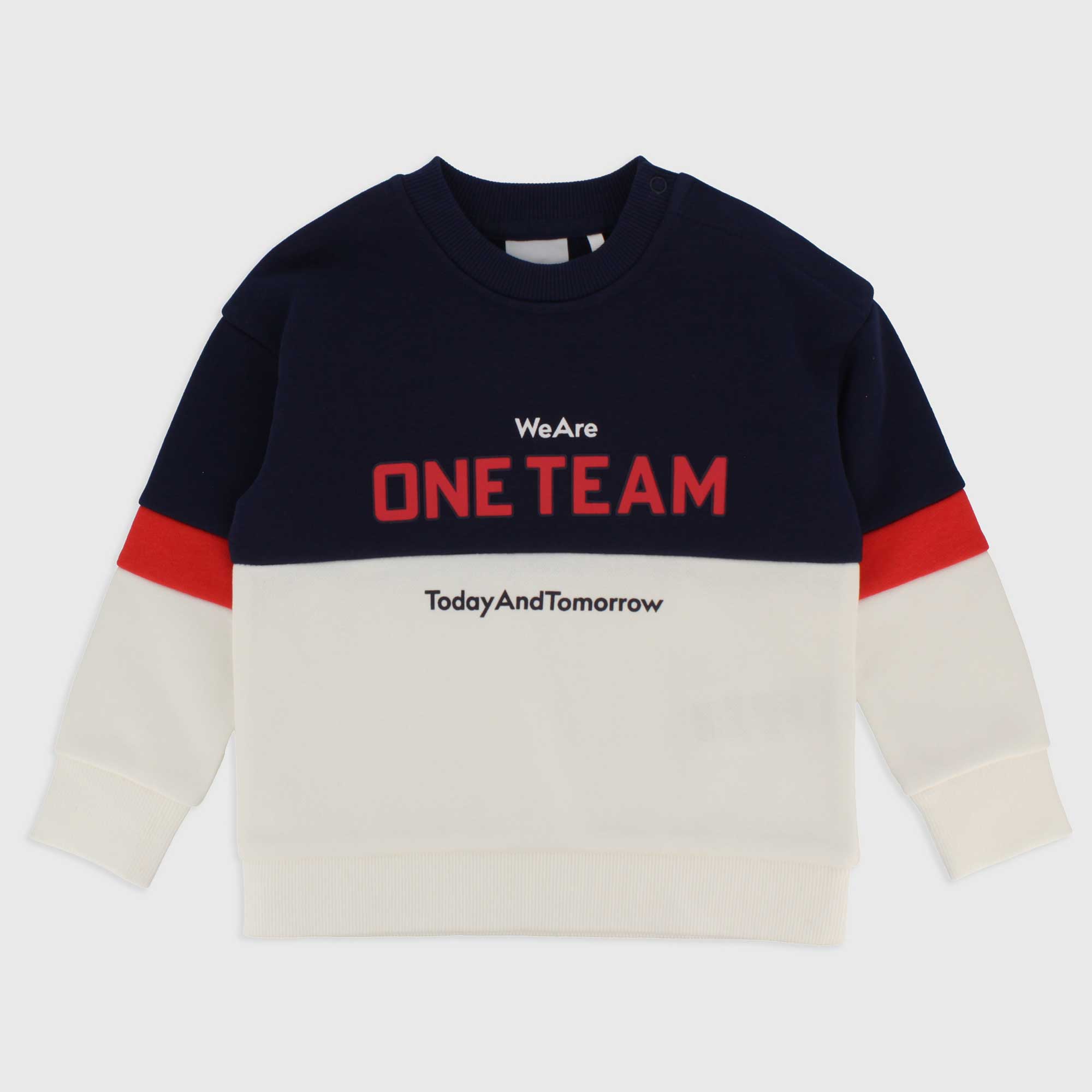 Round-neck sweat-shirt long sleeves. Automatic buttons on the shoulder. Printing rubber effect on the front. Neck, cuffs and ribbed bottom.