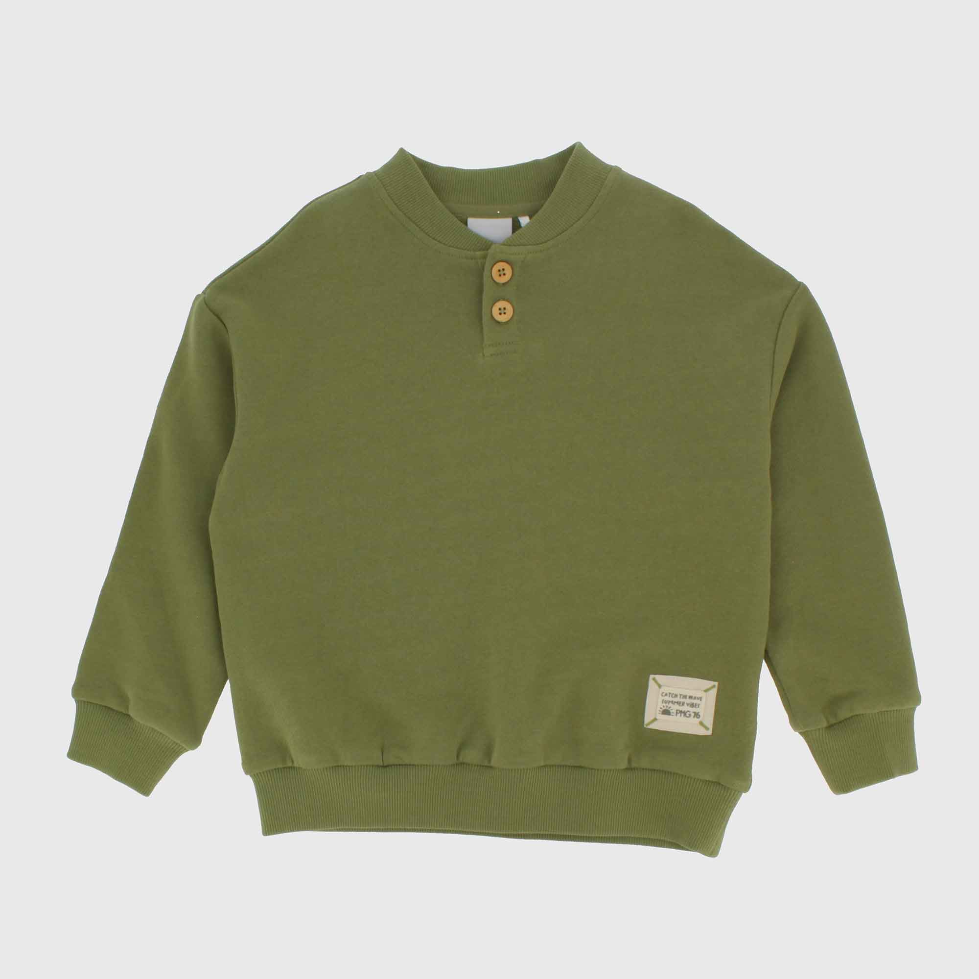 Fleece sweat-shirt/serafino with buttons in wood long sleeves. Small patch with wording on the front. Neck, cuffs and ribbed bottom.