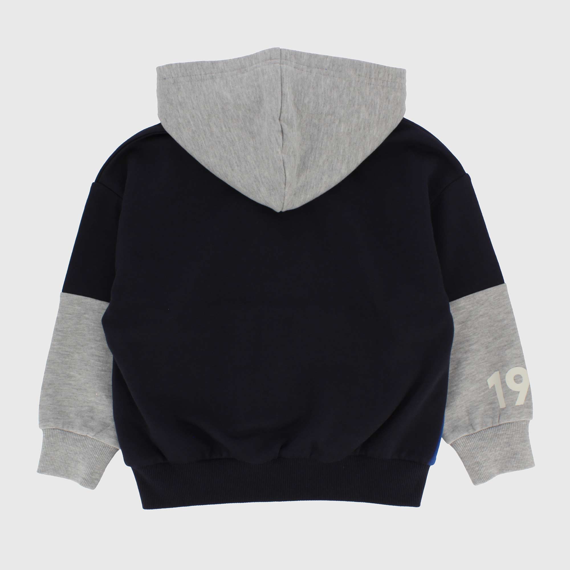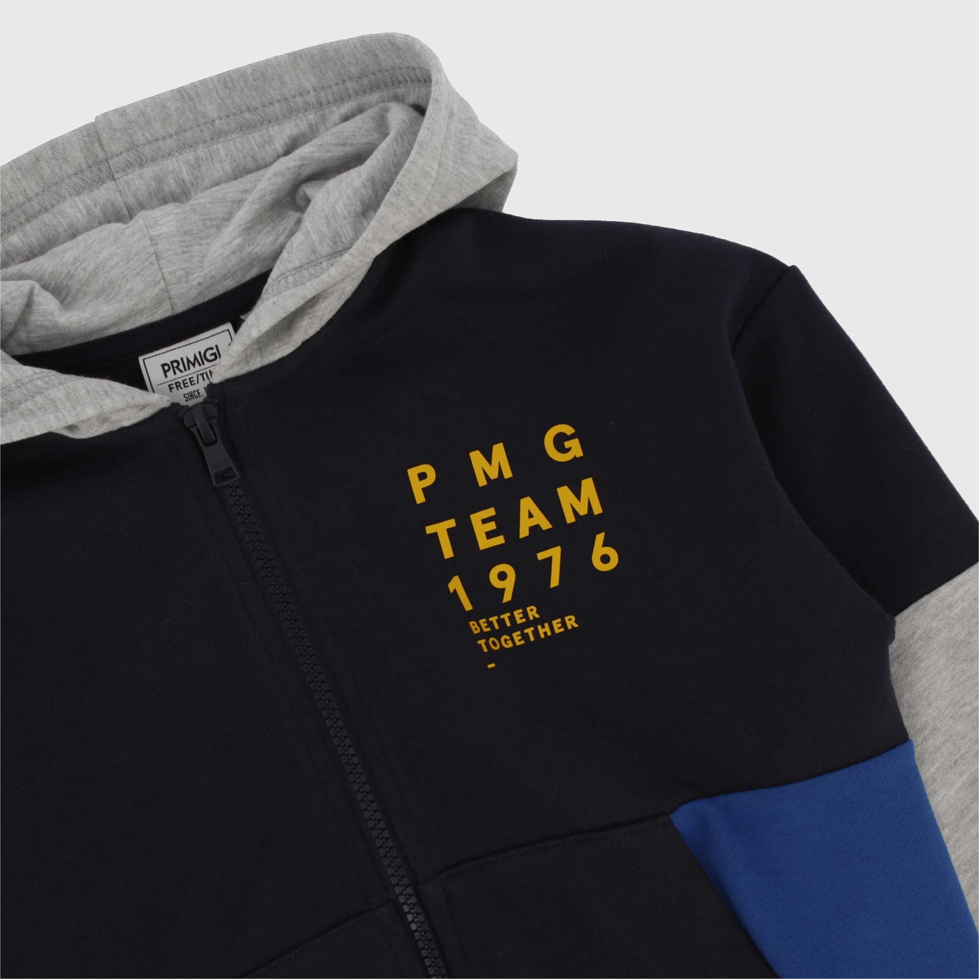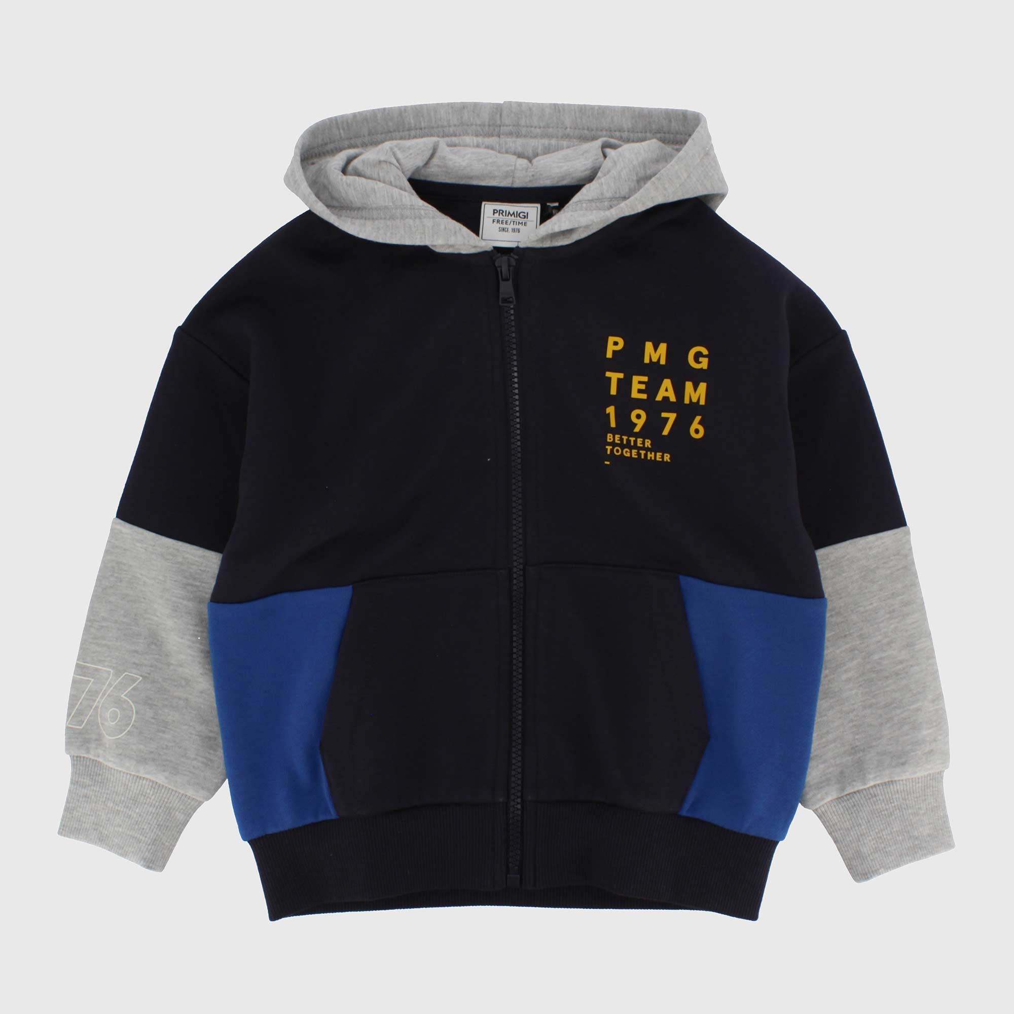 Opened sweat-shirt with cap, long sleeves. Zip on the front. Printing with high definition wording on the front.