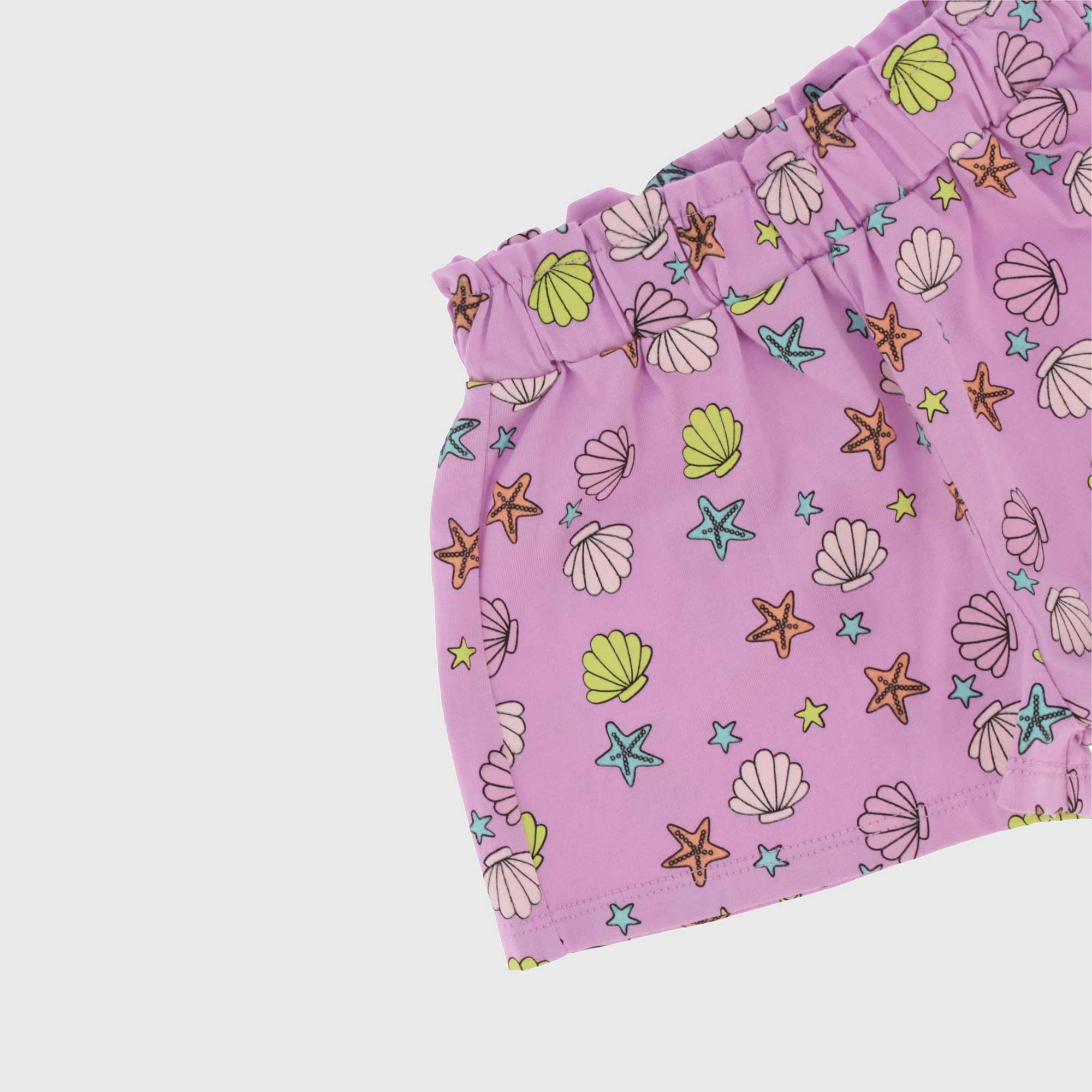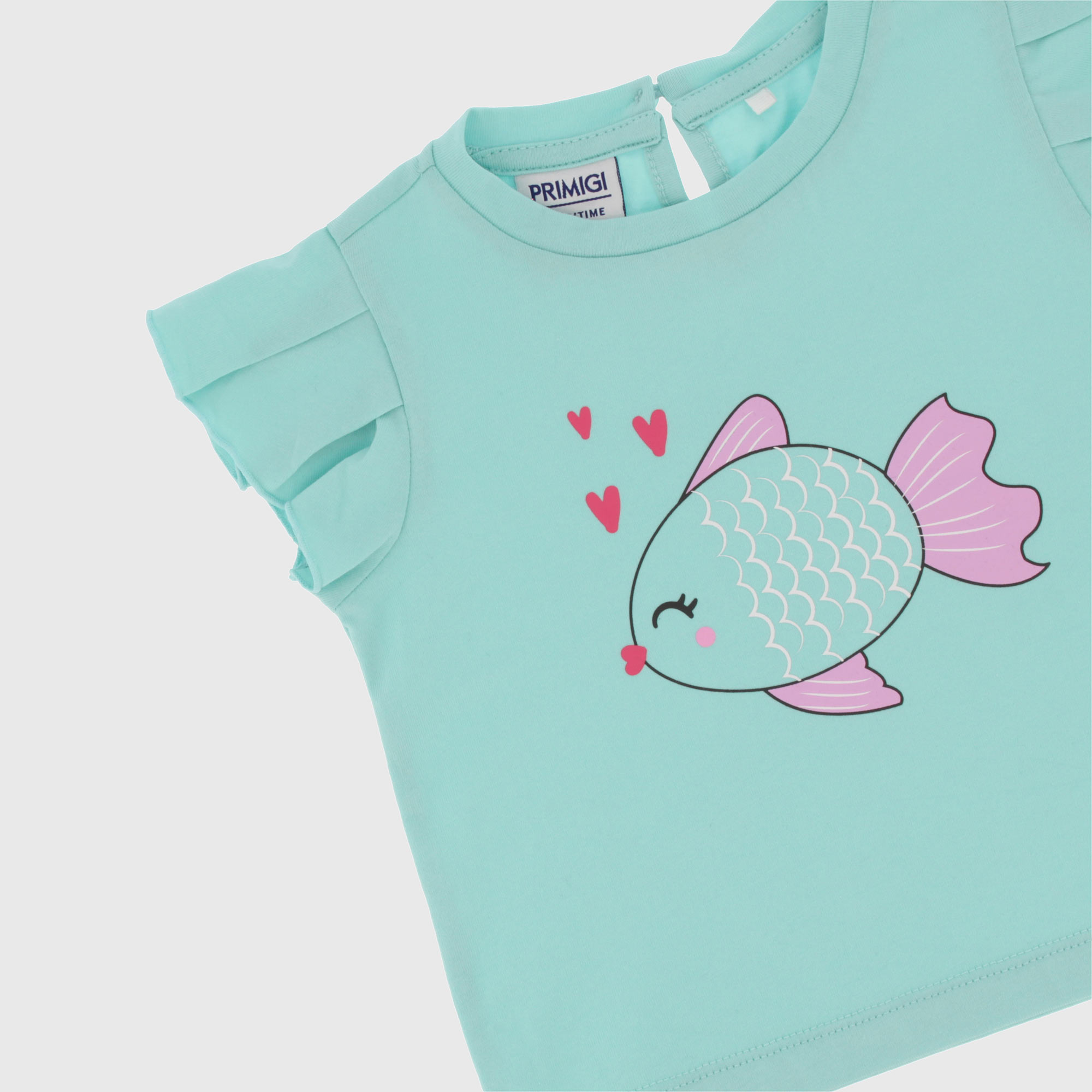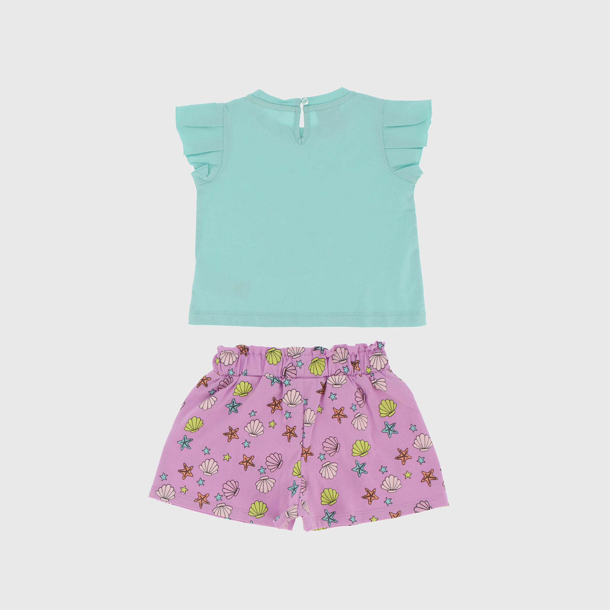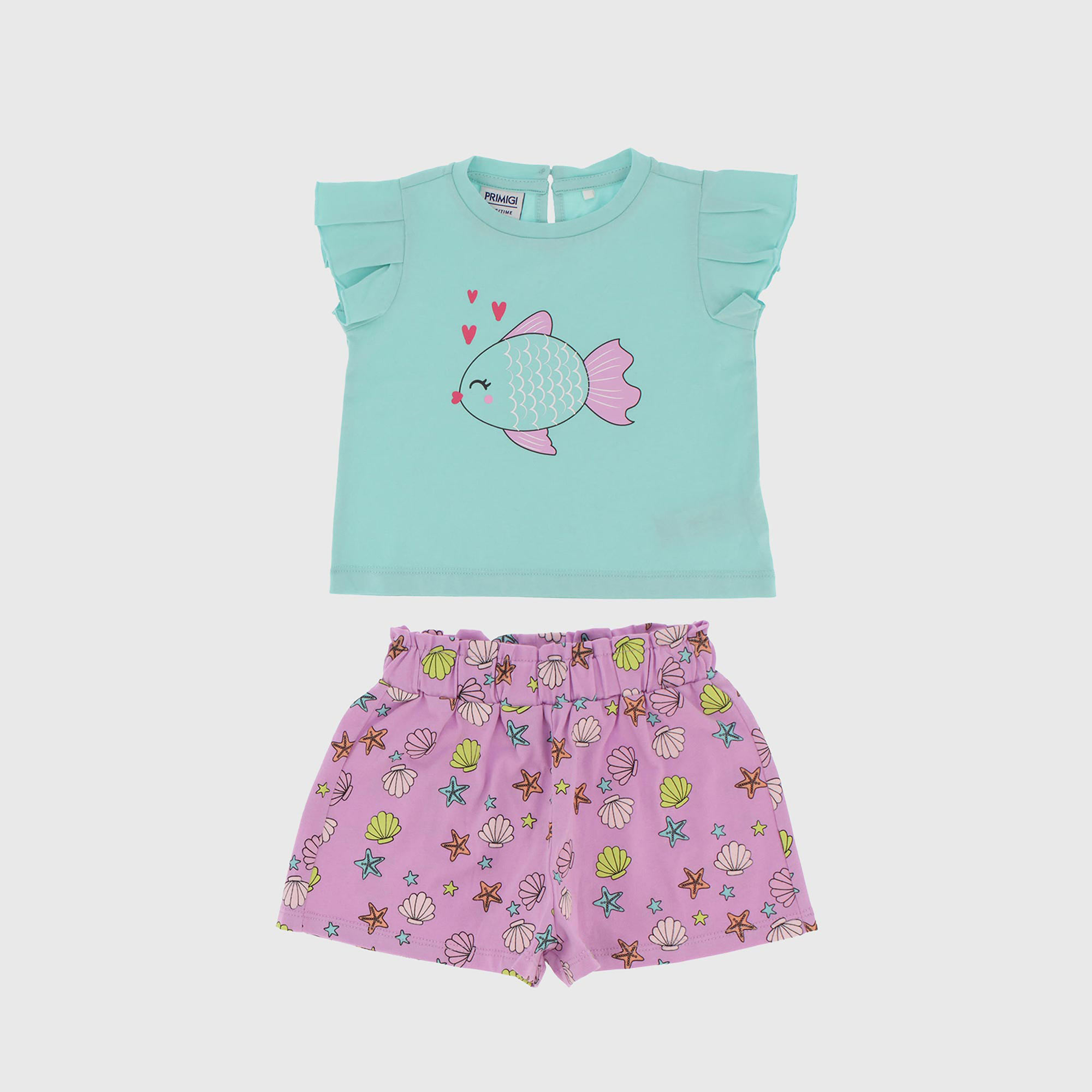 Set composed by two pieces. T-shirt in jersey round-neck, short sleeves with ruffles. Drop-closure with botton on the back. Printing on the front. Shorts in jersey with applied bow, printing all over marine theme.