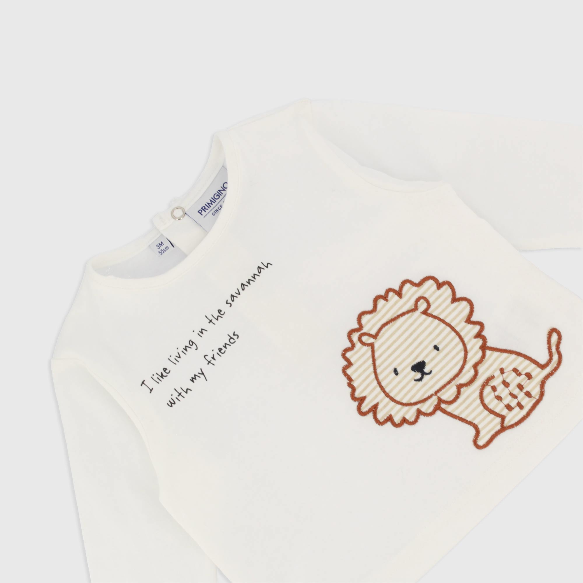 Set composed by two pieces. T-shirt in jersey round-neck, long sleeves. Back-closure with automatic buttons. Printing and patch lion on the front. Trousers in gabardine with elastic waist and front laces. Big side pockets and elastic bottom.