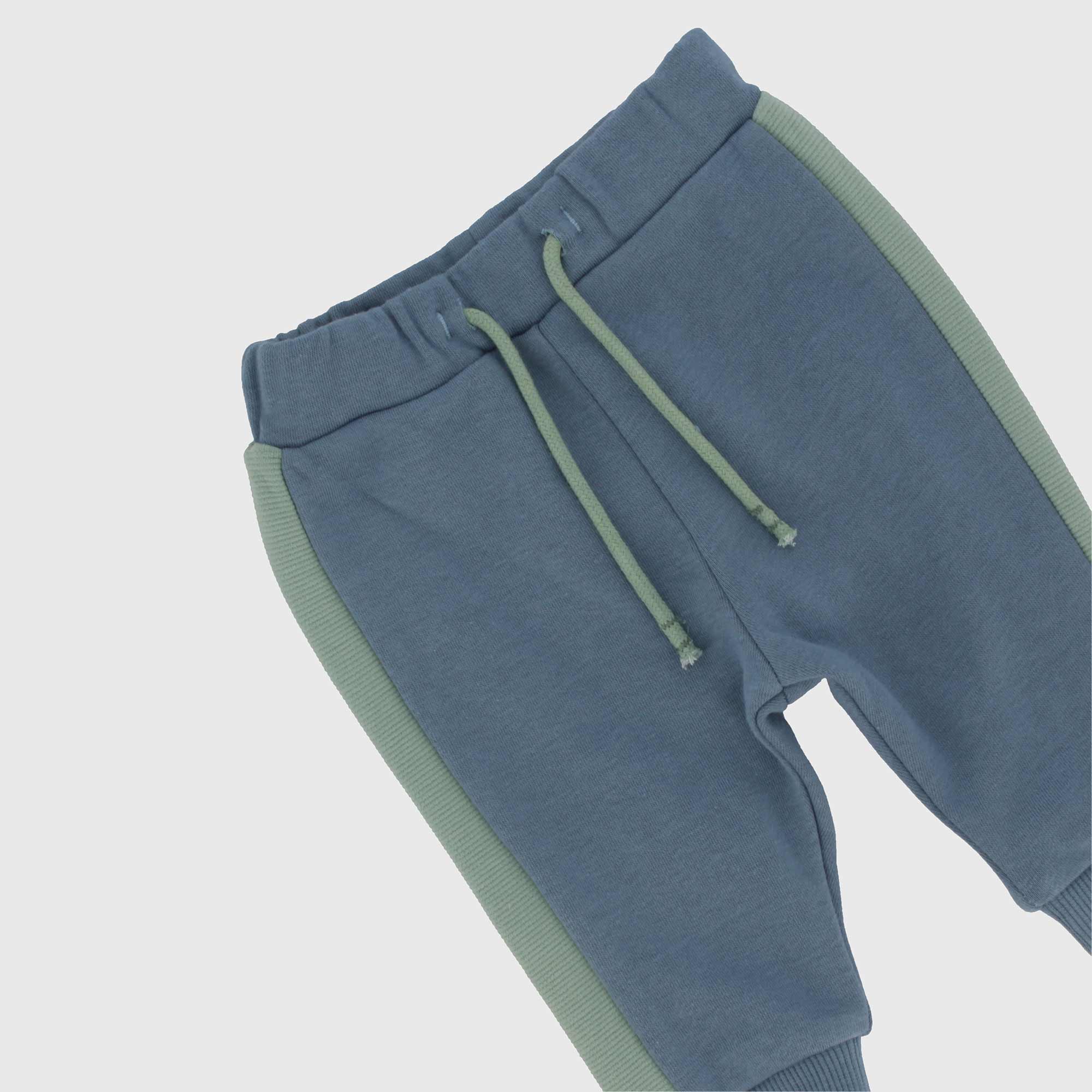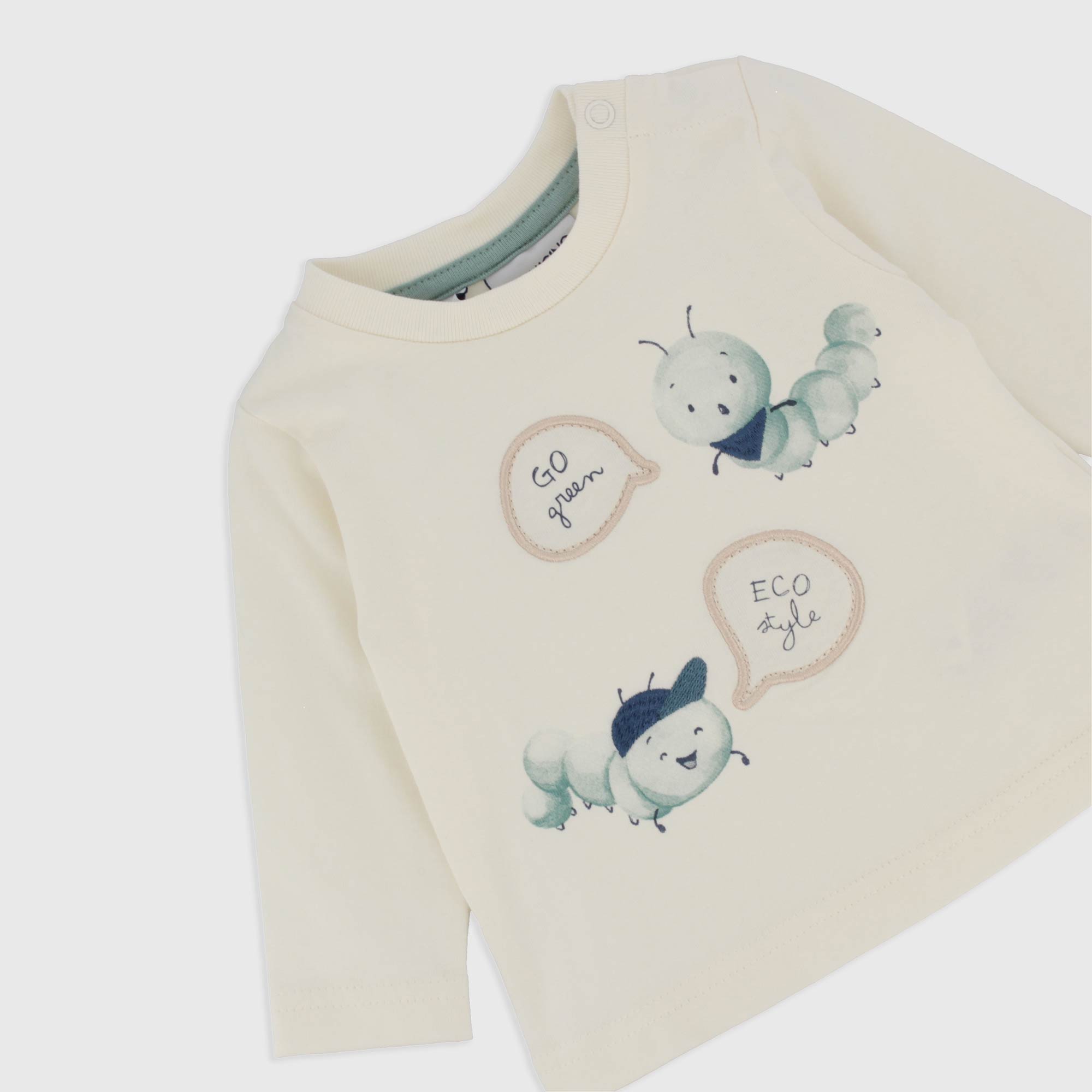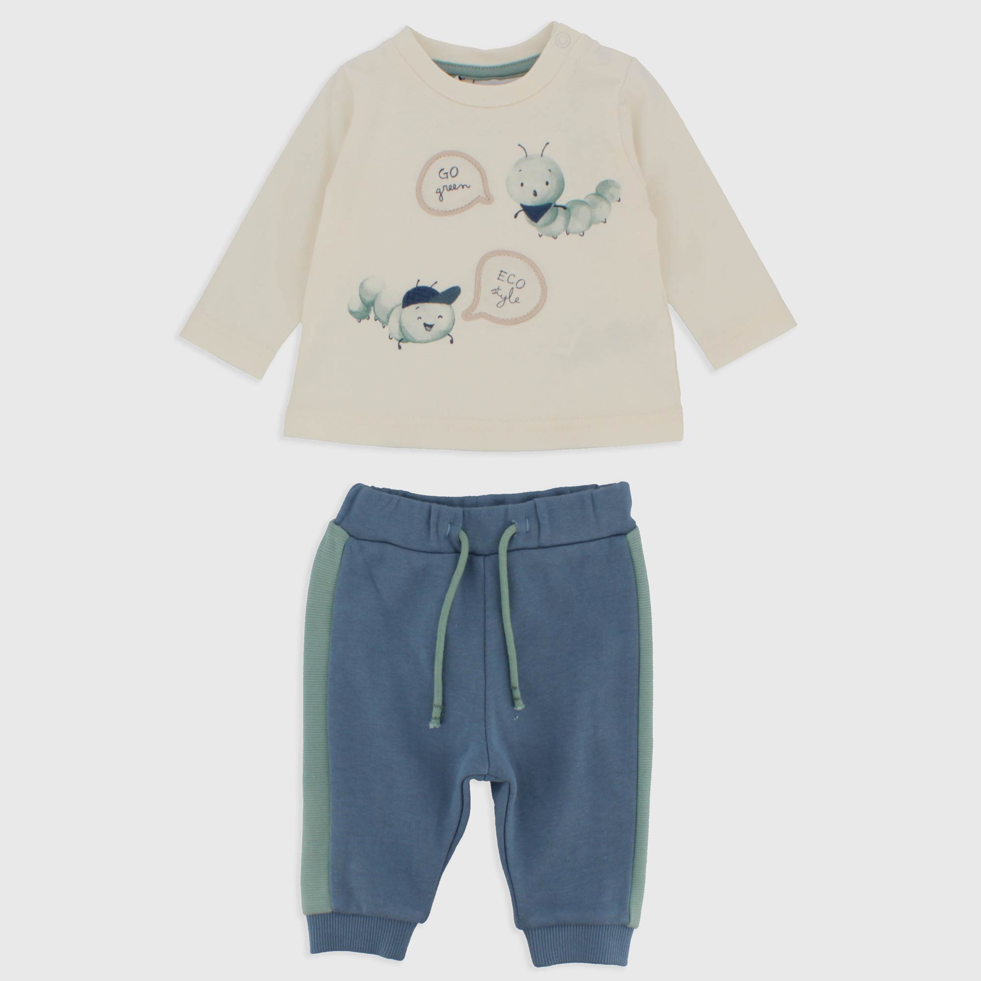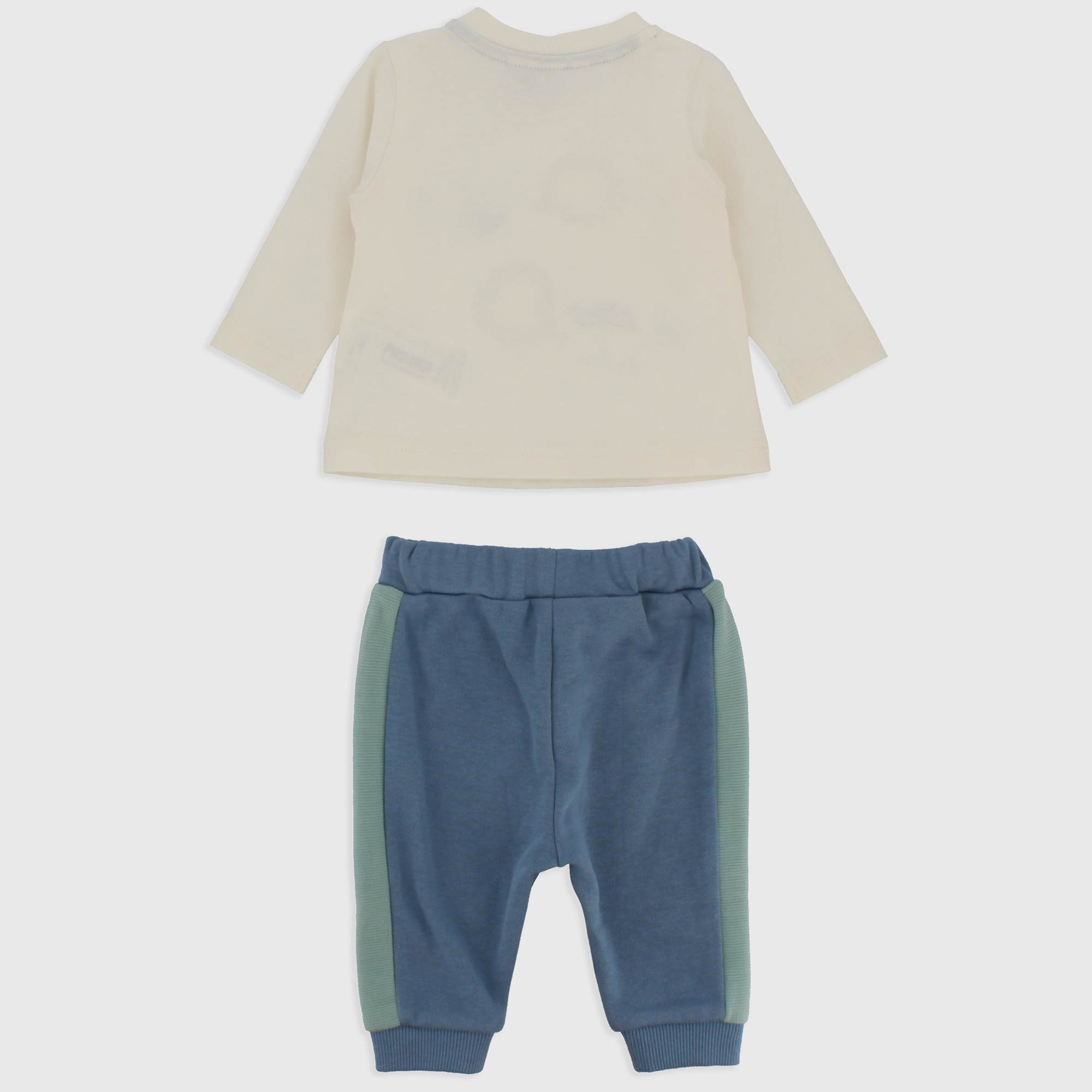 Set composed by two pieces. T-shirt in jersey round-neck, long sleeves. Automatic buttons on the shoulder. Printing and embroideries on the front. Trousers in fleece with elastic waist and contrasting laces. Contrasting side bands and ribbed cuffs.