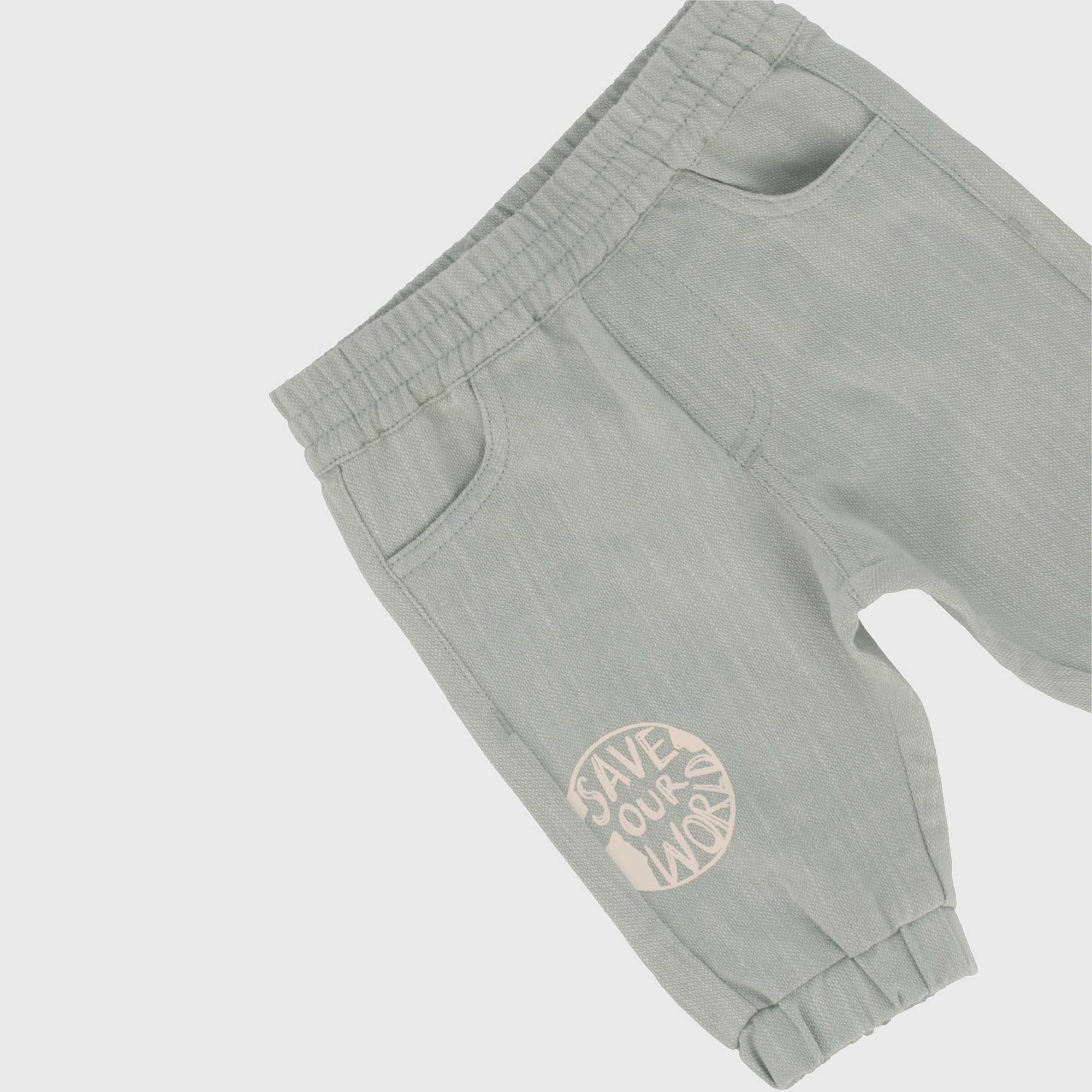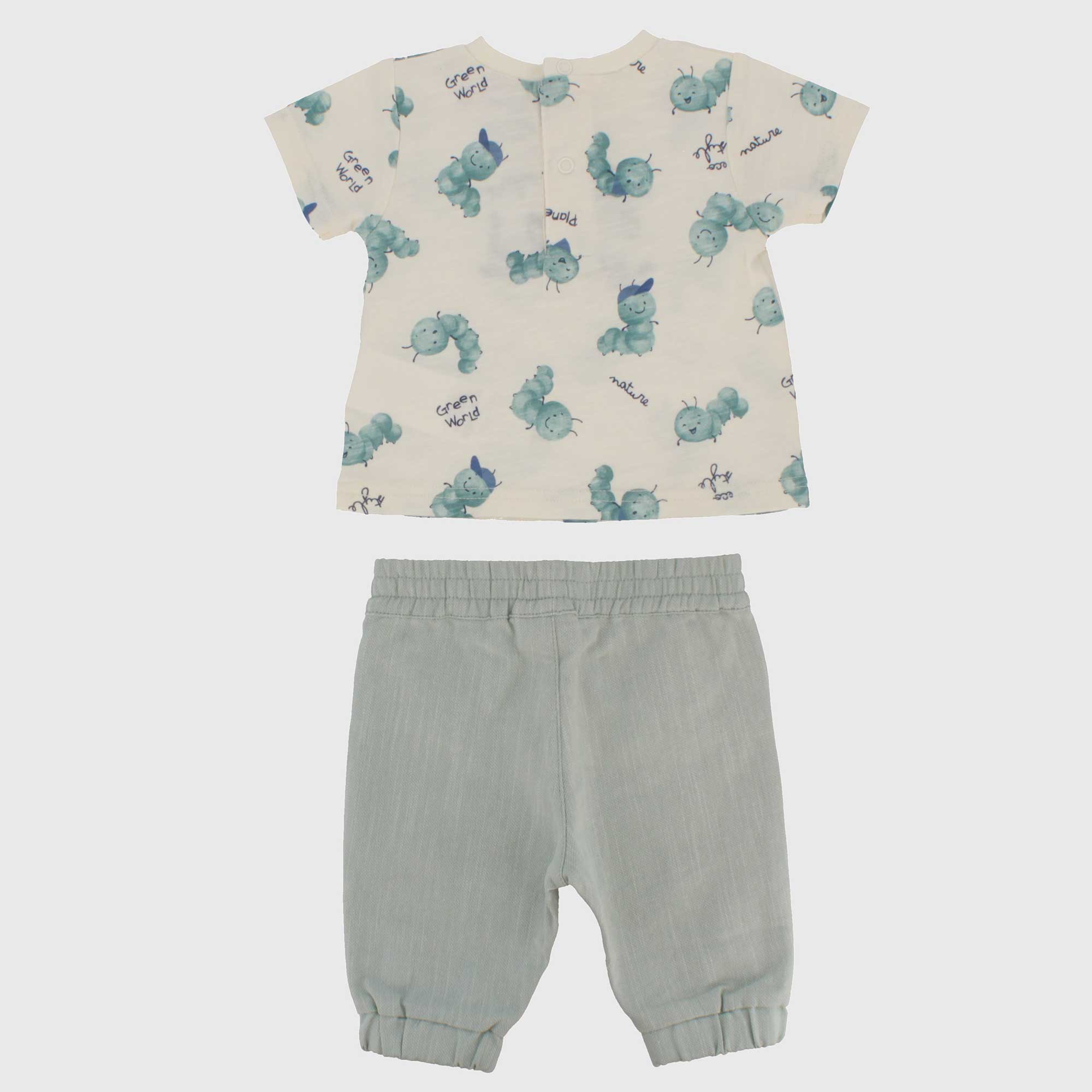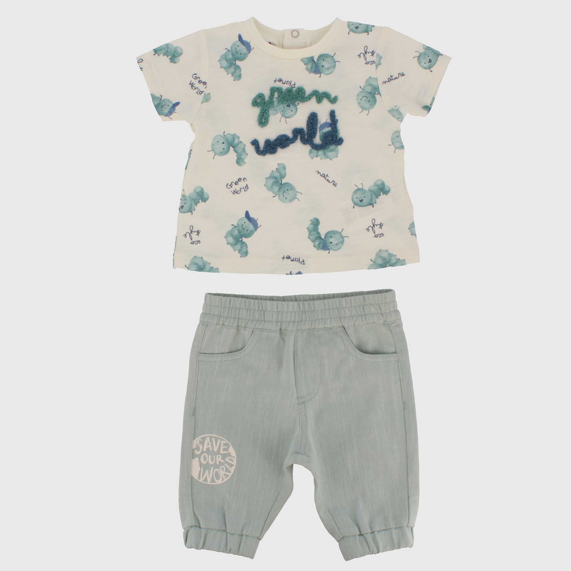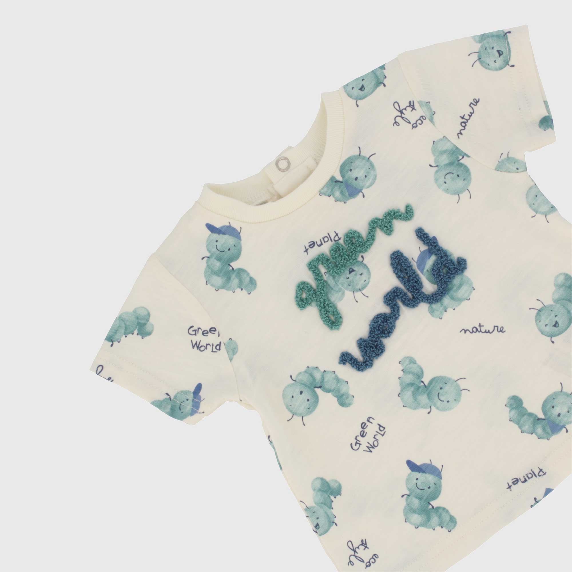 Set composed by two pieces. T-shirt in jersey round-neck, with long sleeves. Back-closure with automatic buttons. Printing all-over and wording embroidery on the front. Trousers in coton with elastic waist and fake pockets on the front. Lateral printing and elastic bottom.