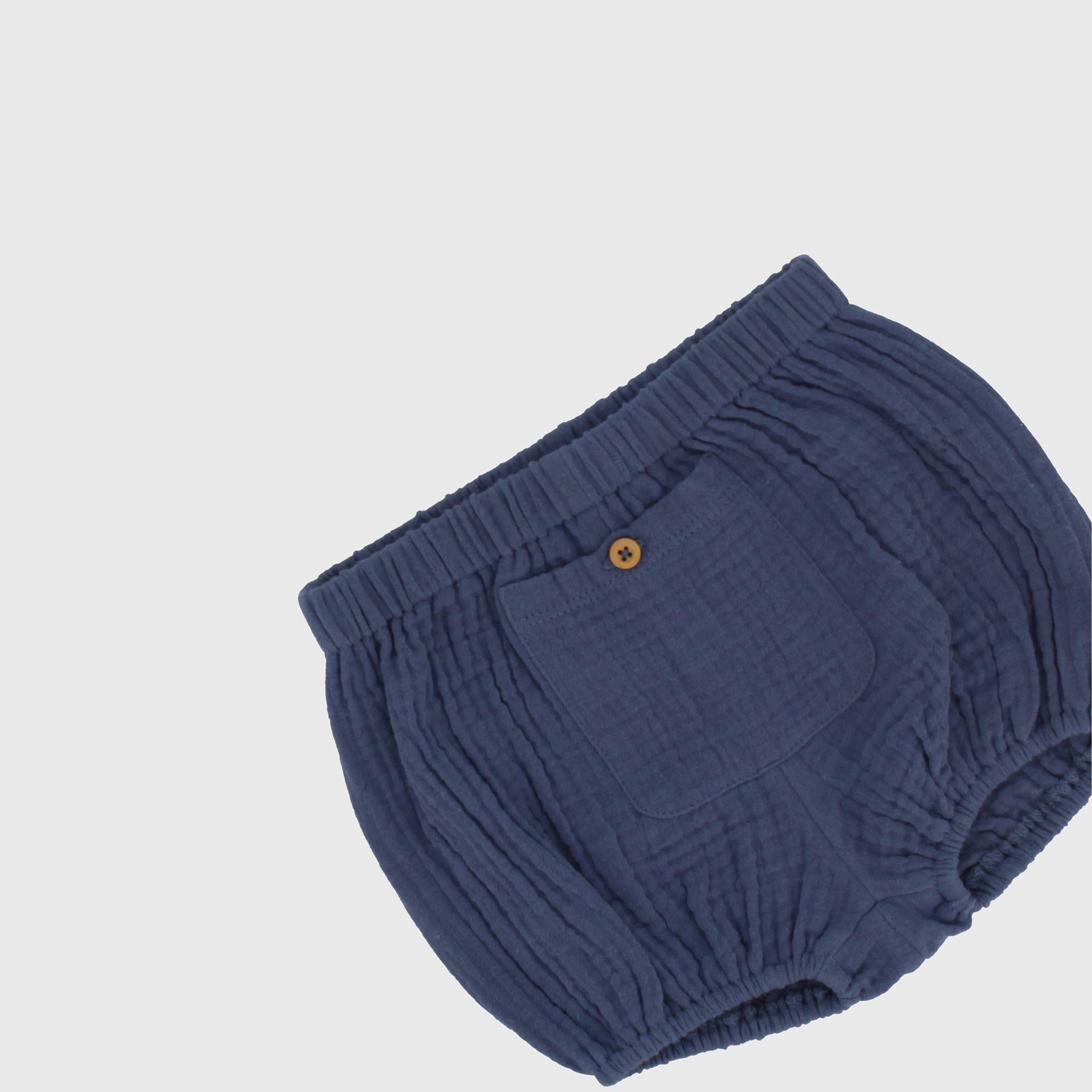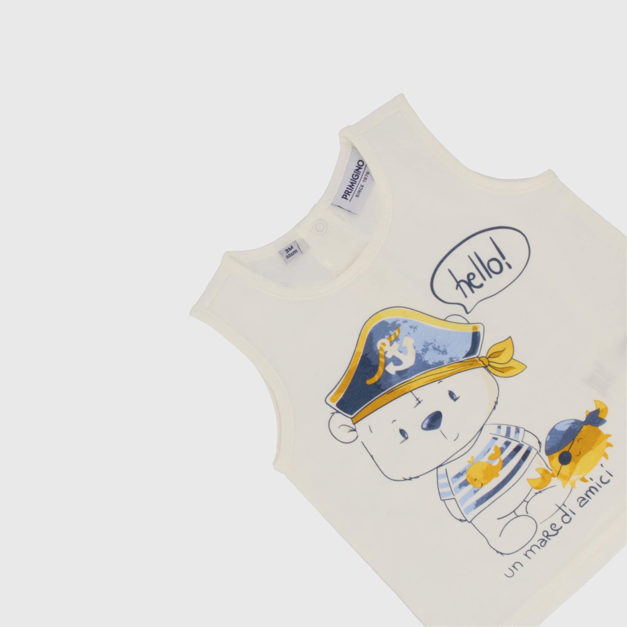 Set composed by two pieces. Tank top in jersey round-neck. Back-closure with automatic buttons. Printing on the front. Bermuda in gauze of coton with elastic waist and patch pocket on the front with button.