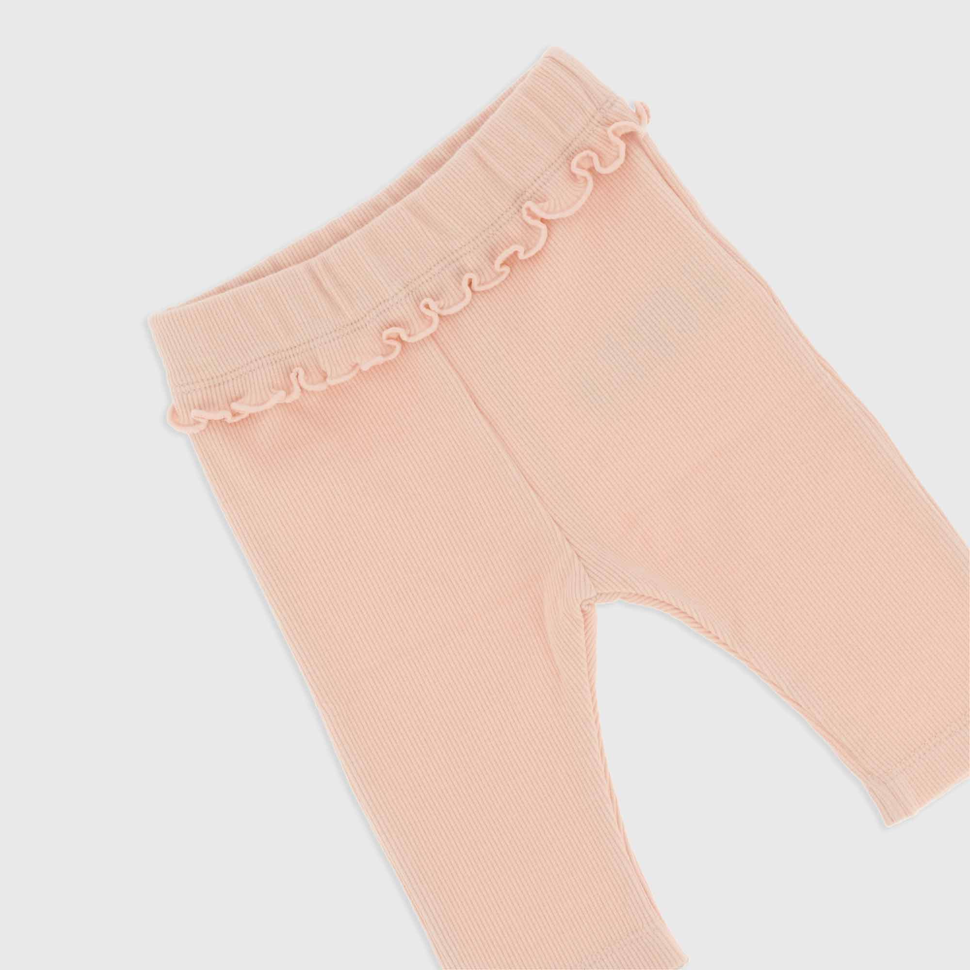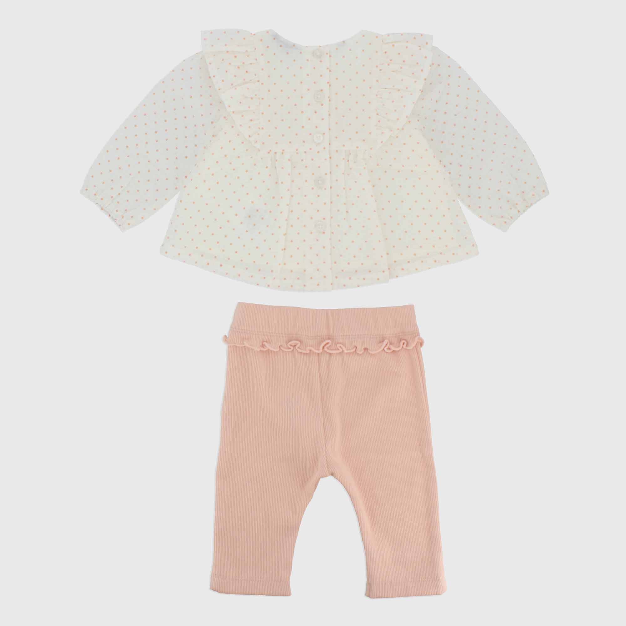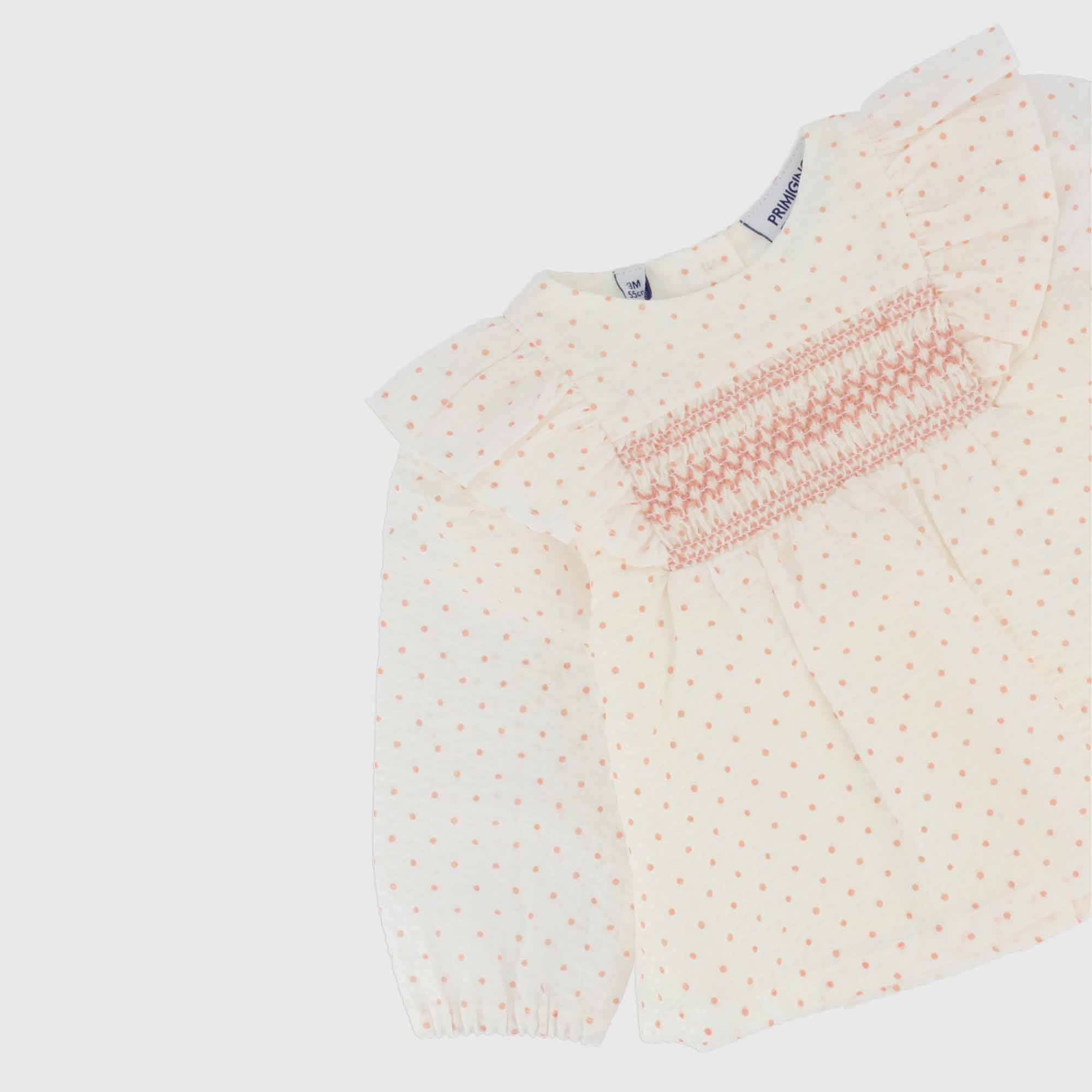 Set composed by two pieces. Blouse in coton, round-neck, long sleeves. Applied ruffles and elastic insert with embroidery on the chest. Inner lining. Back-closure with buttons. Ribbed leggings with elasticated waist.