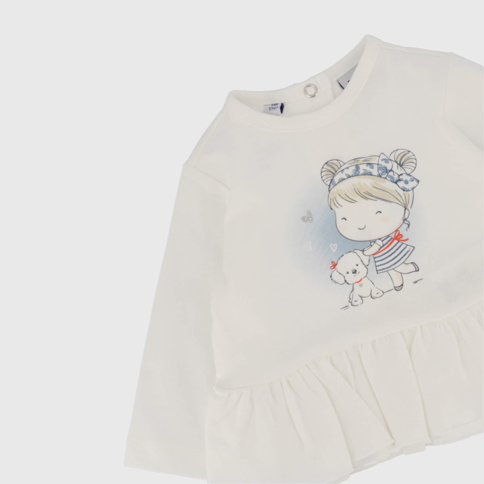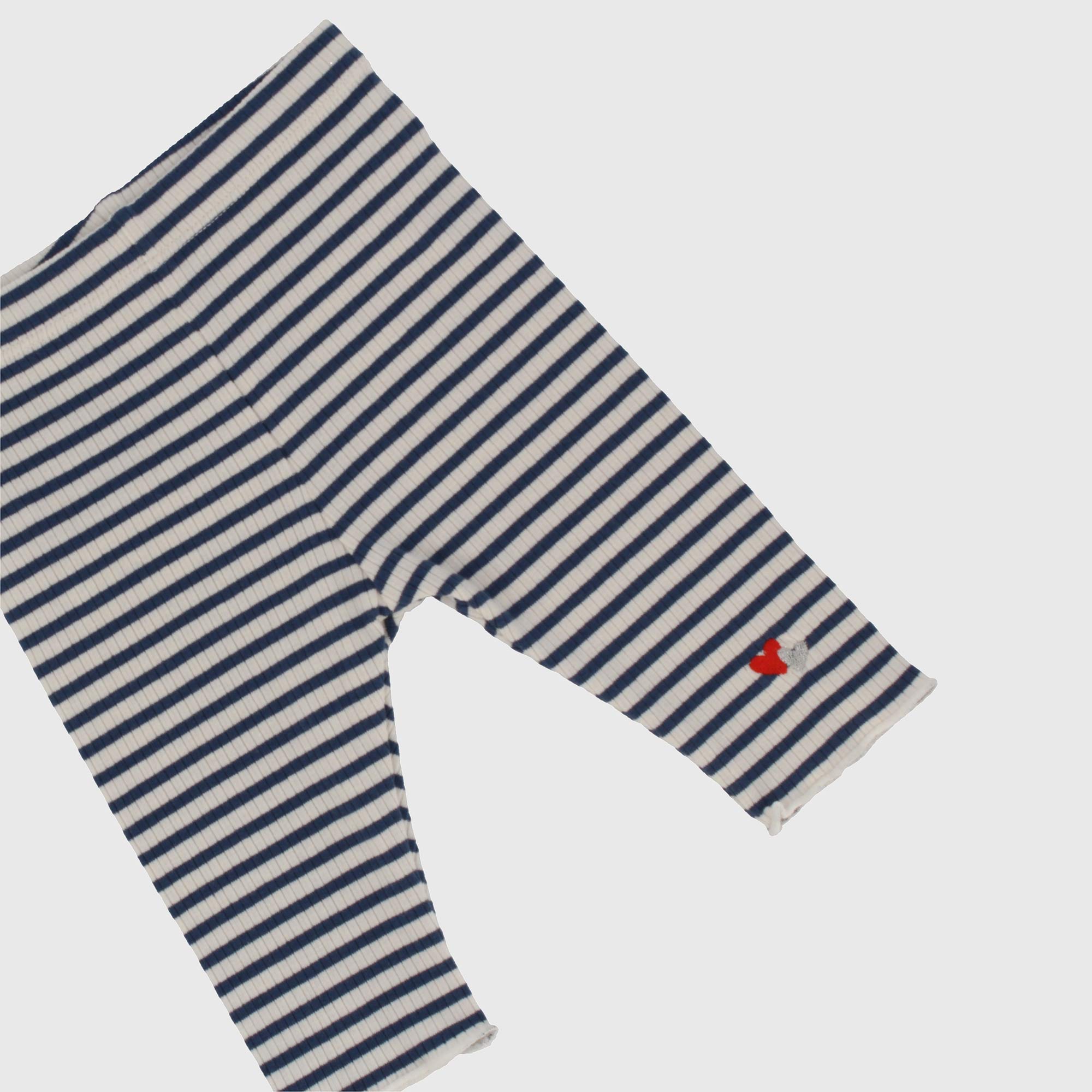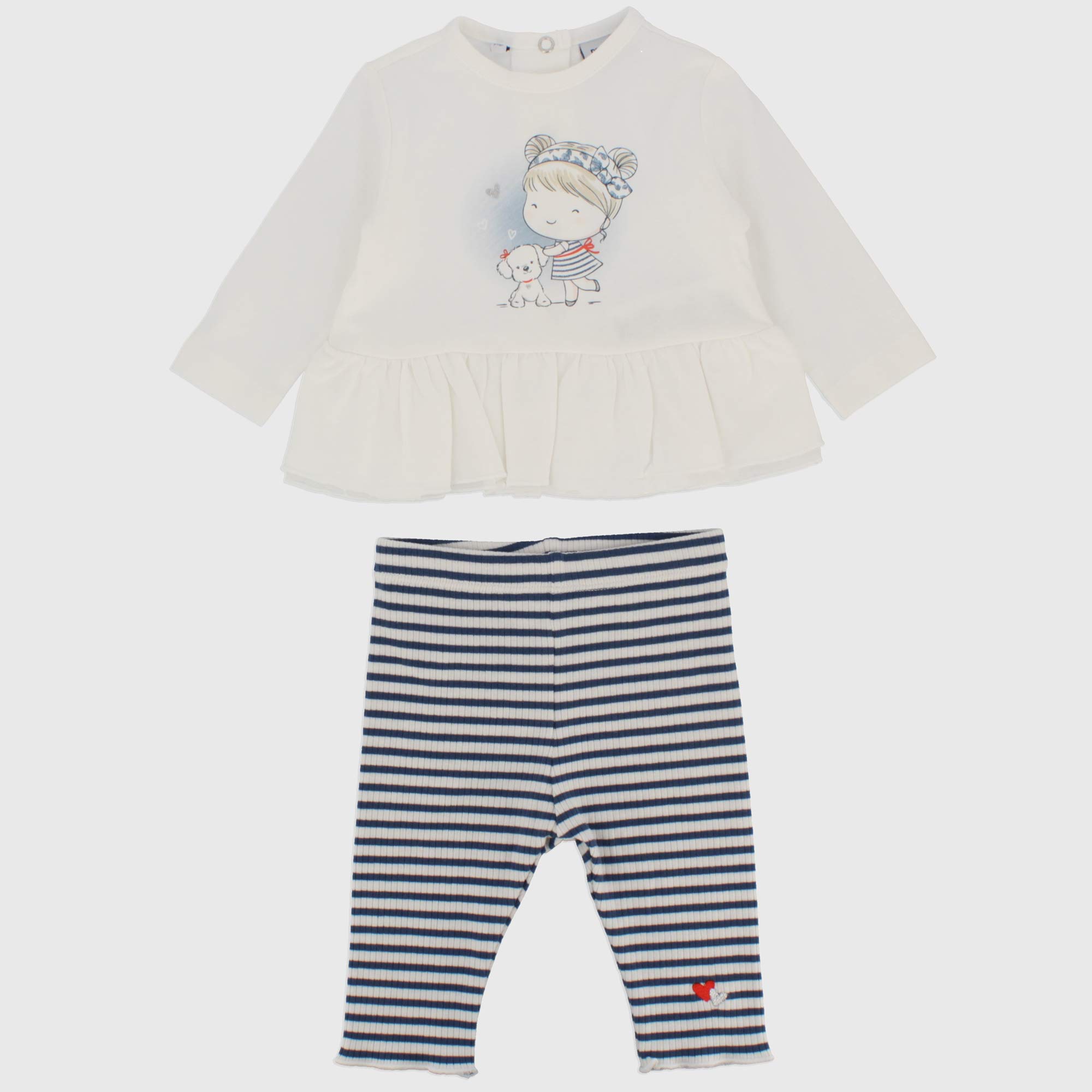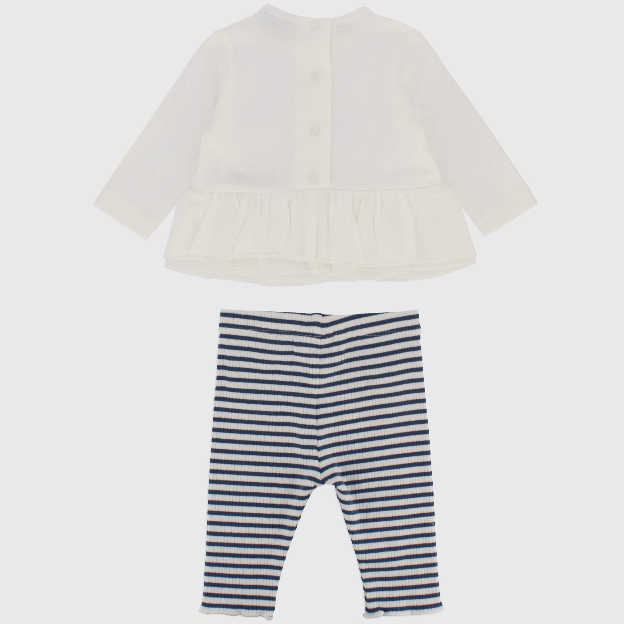 Set composed by two pieces. T-shirt in jersey, round-neck, long sleeves. Back-closure with automatic buttons. Flounces on the bottom. Ribbed leggings with yarn-dyed stripes. And elastic waist.