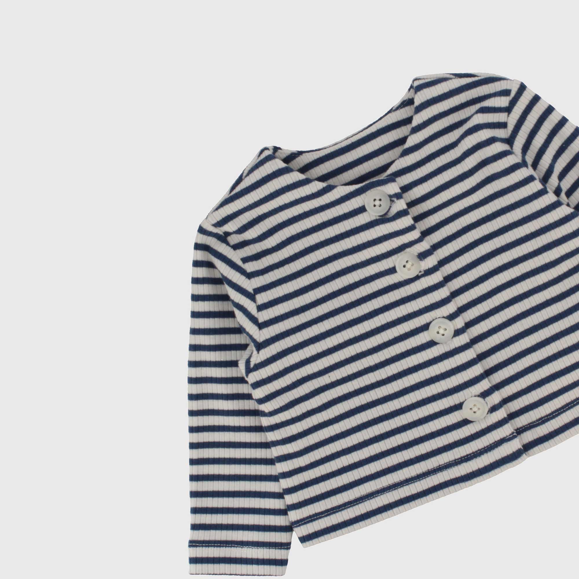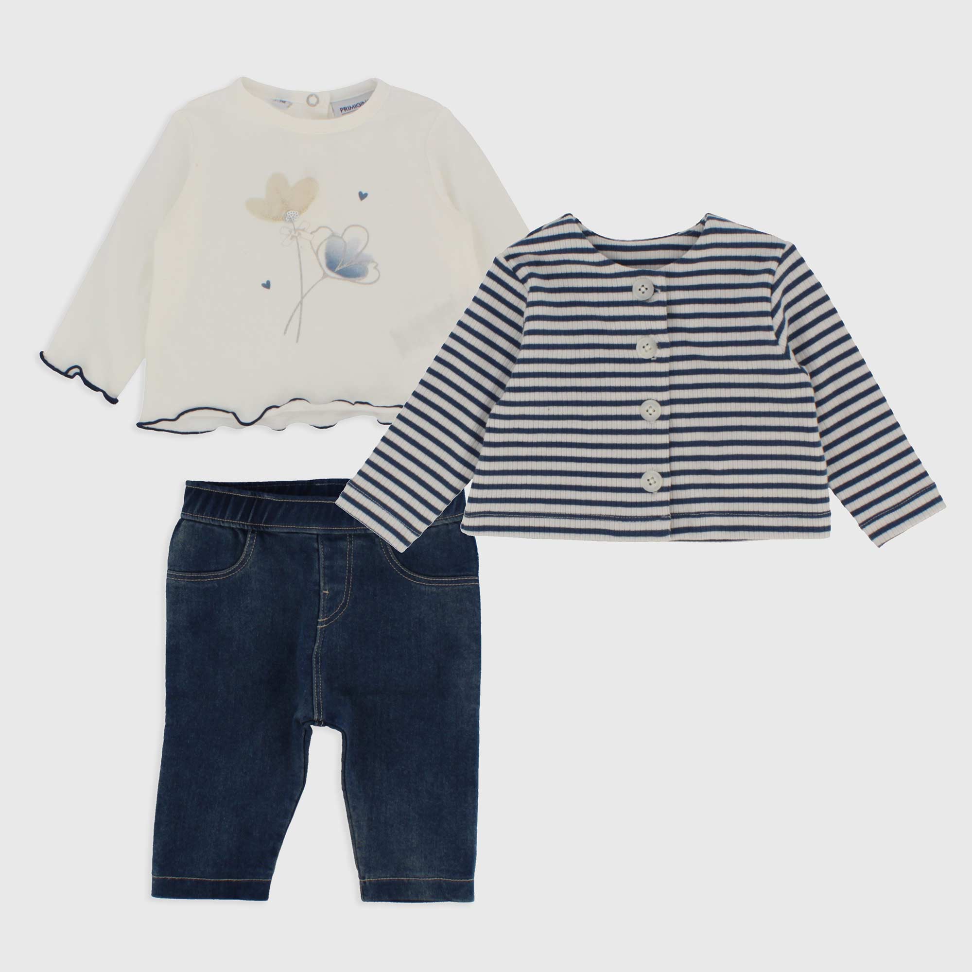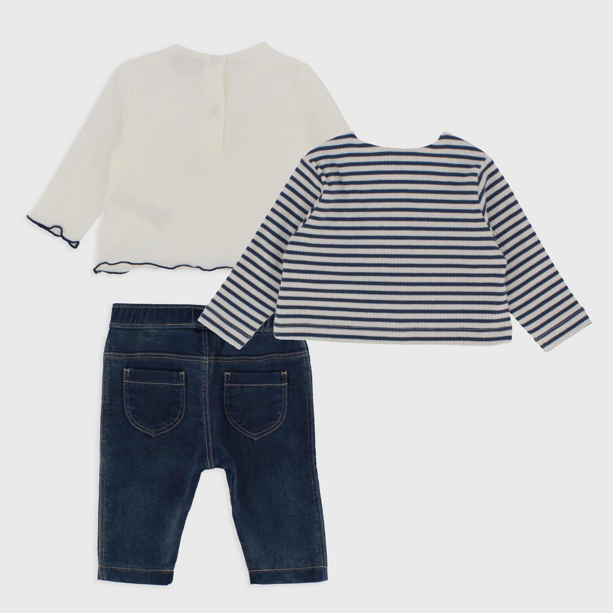 Set composed by three pieces. T-shirt in jersey round-neck, long sleeves. Back-closure with automatic buttons. Printing and tulle insert on the front. Jacket ribbed with yarn-dyed stripes and closing on the front. Trousers in Jeans with elastic waist and patch pockets on the back.