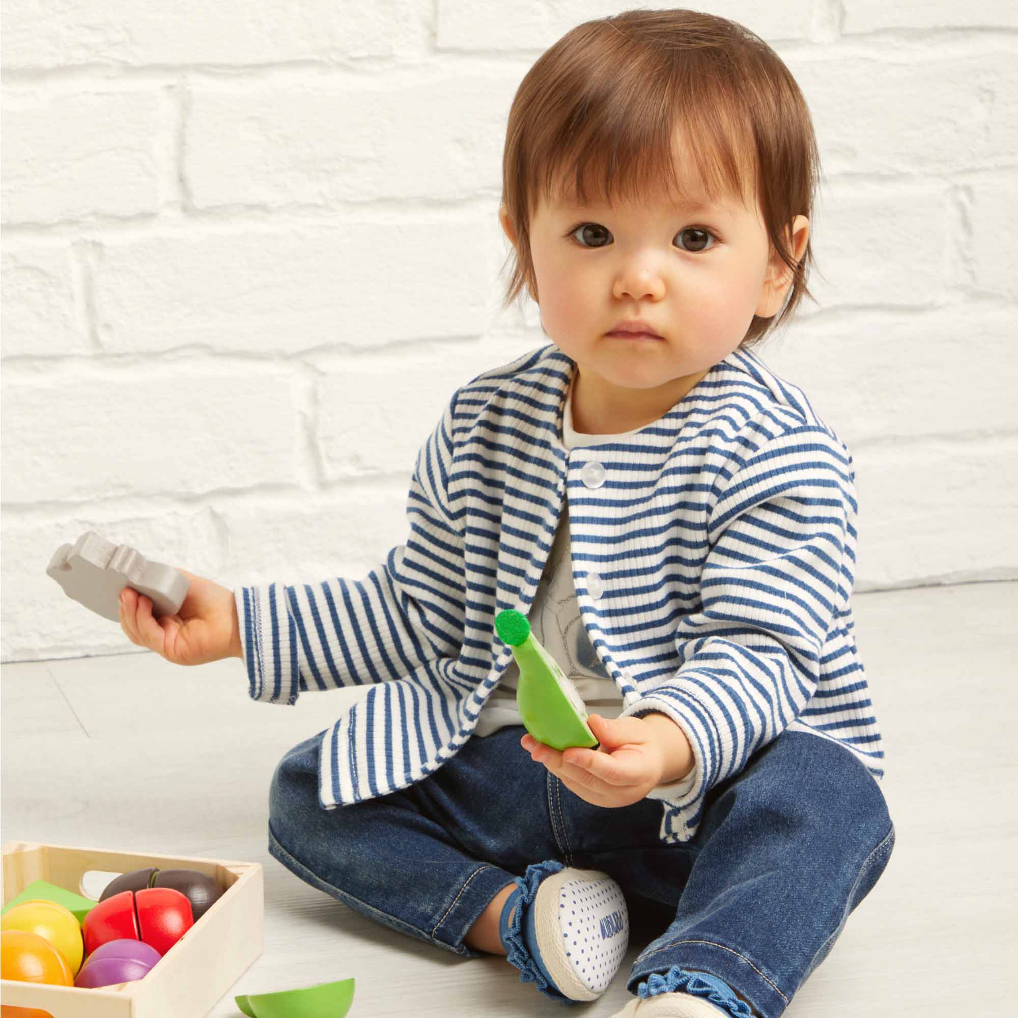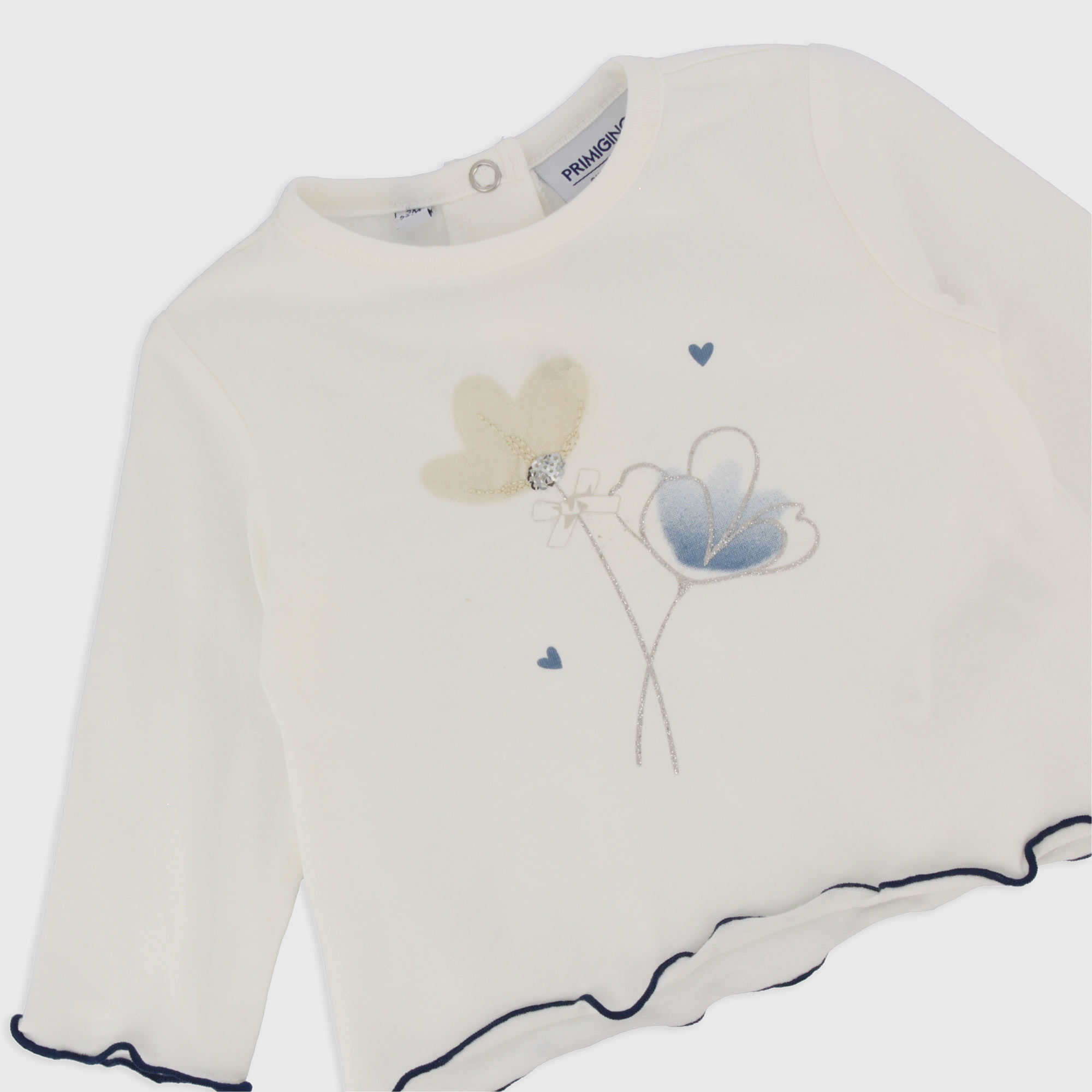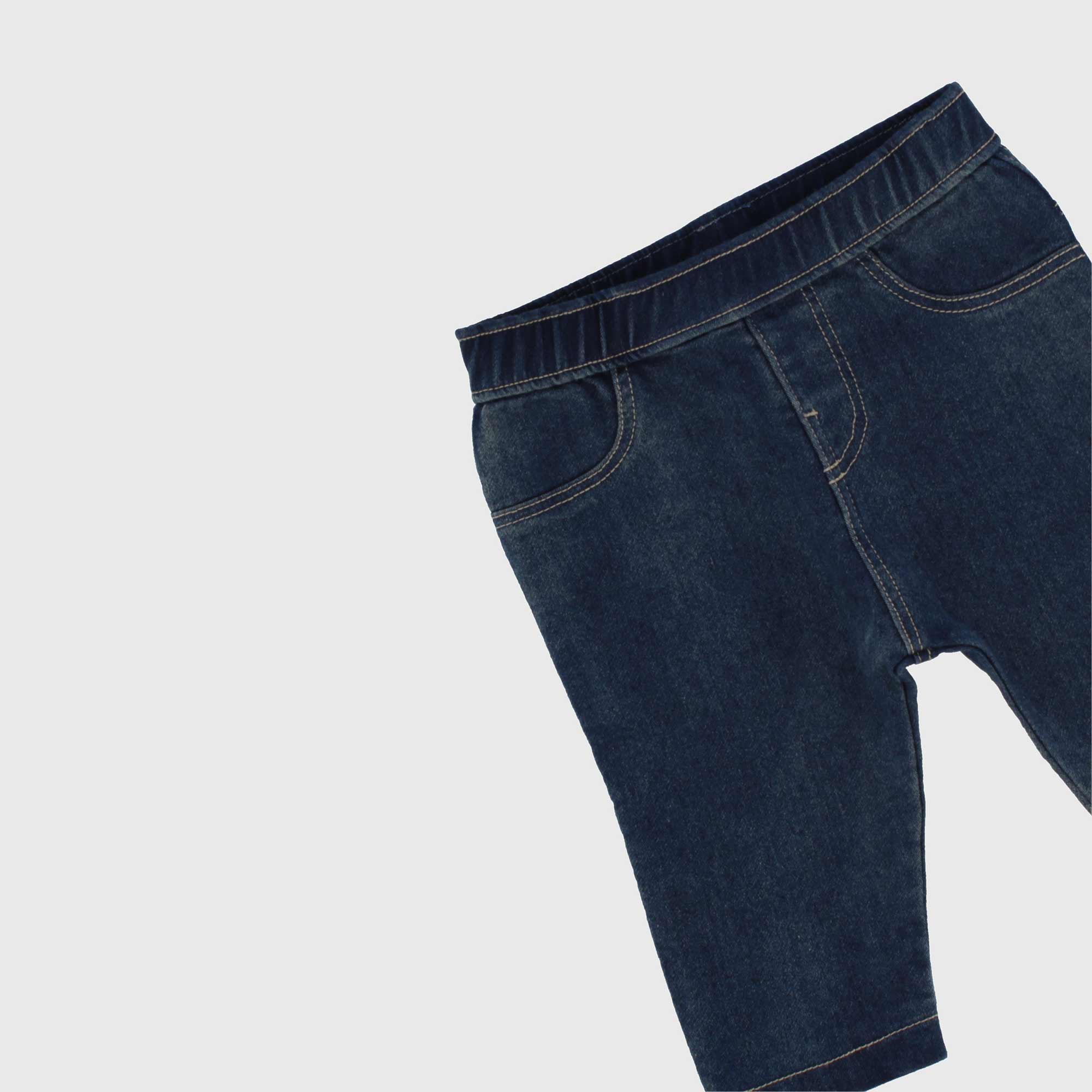 Set composed by three pieces. T-shirt in jersey round-neck, long sleeves. Back-closure with automatic buttons. Printing and tulle insert on the front. Jacket ribbed with yarn-dyed stripes and closing on the front. Trousers in Jeans with elastic waist and patch pockets on the back.