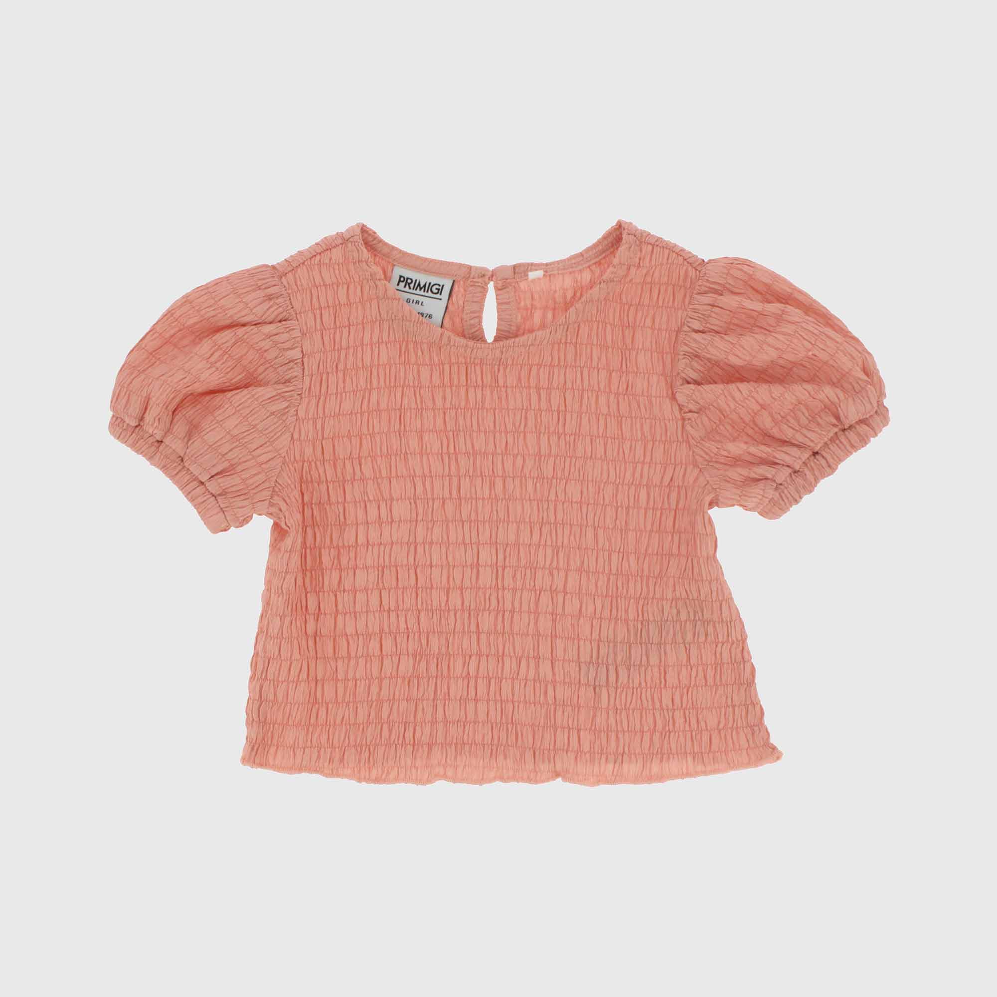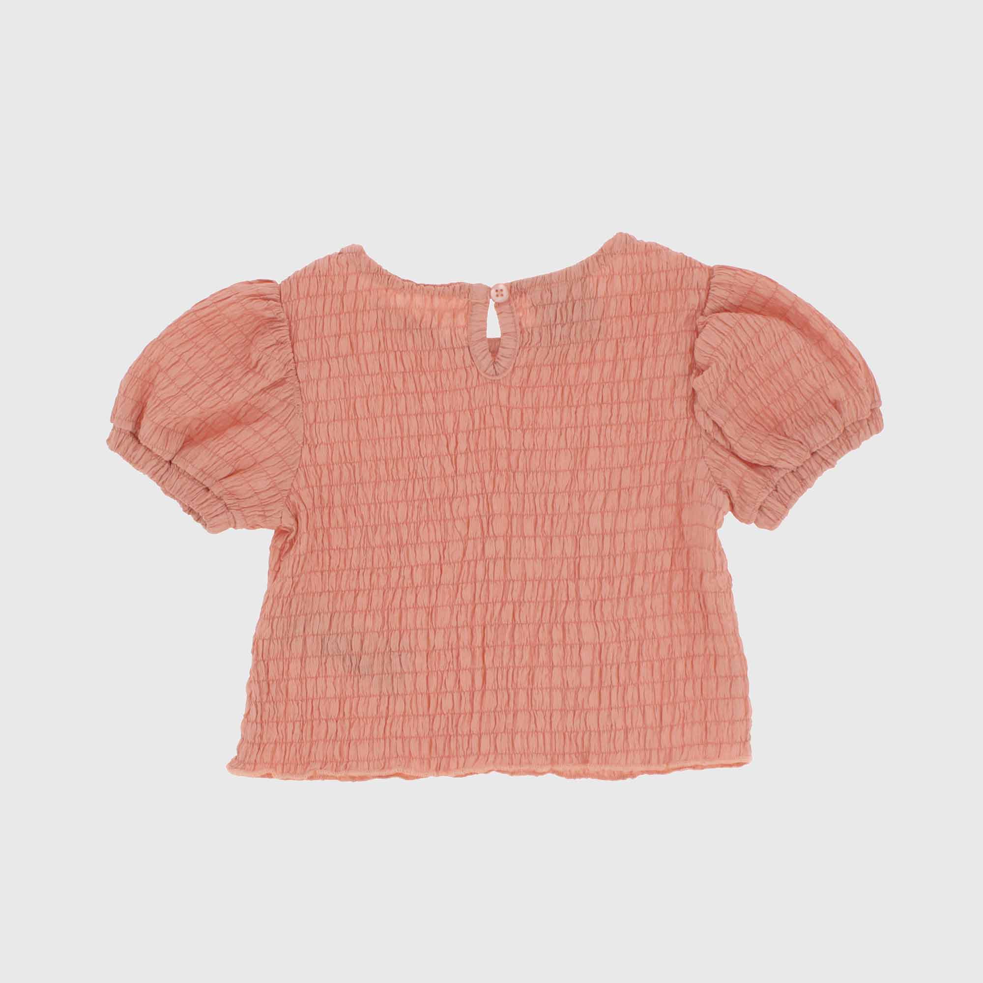 Top in seersucker, round-neck, with short ballon-sleeves. Drop-closure with botton on the back.