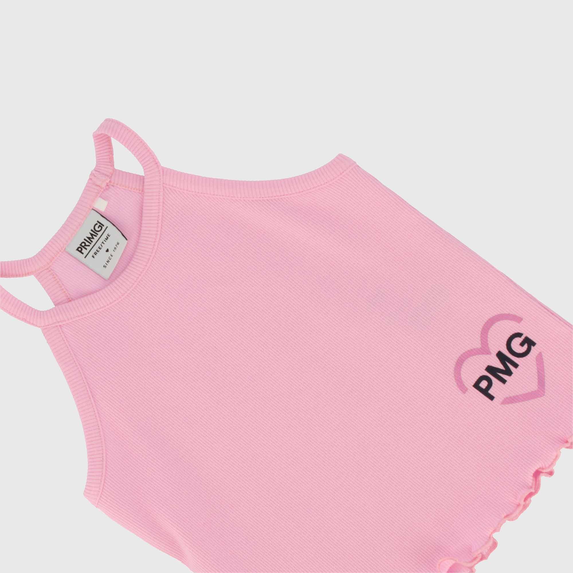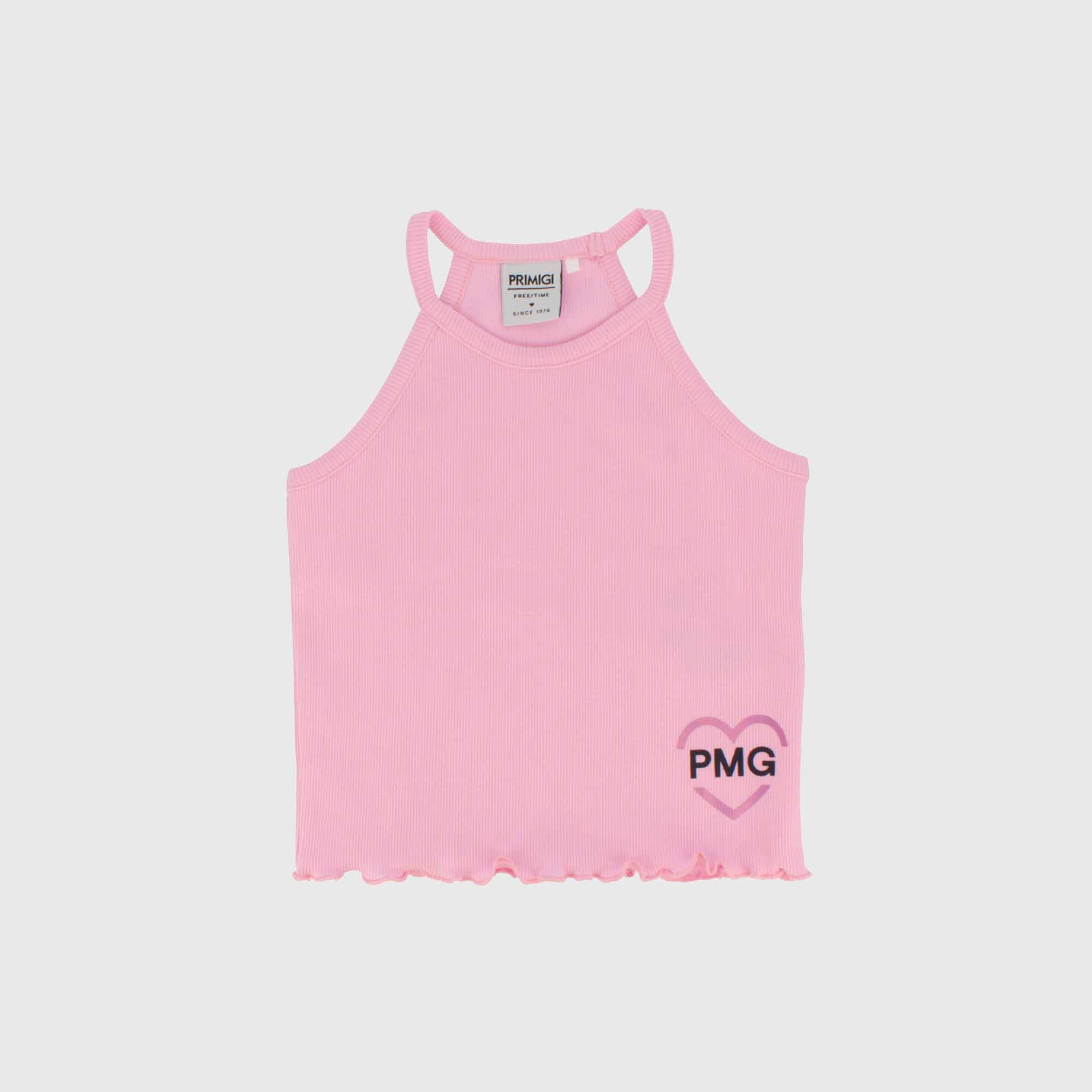 Ribbed tanktop with small braces. Printing with logo. Waved bottom.