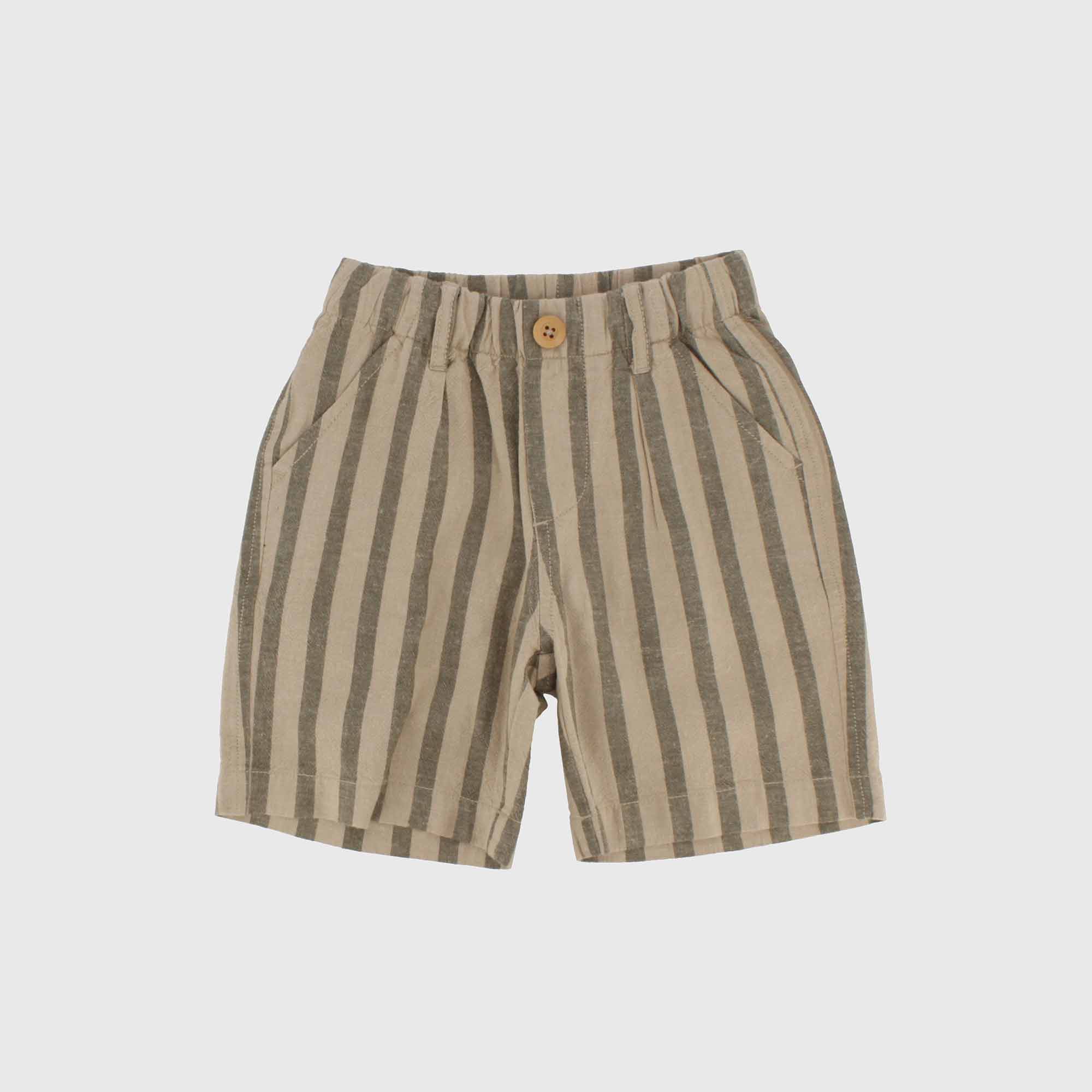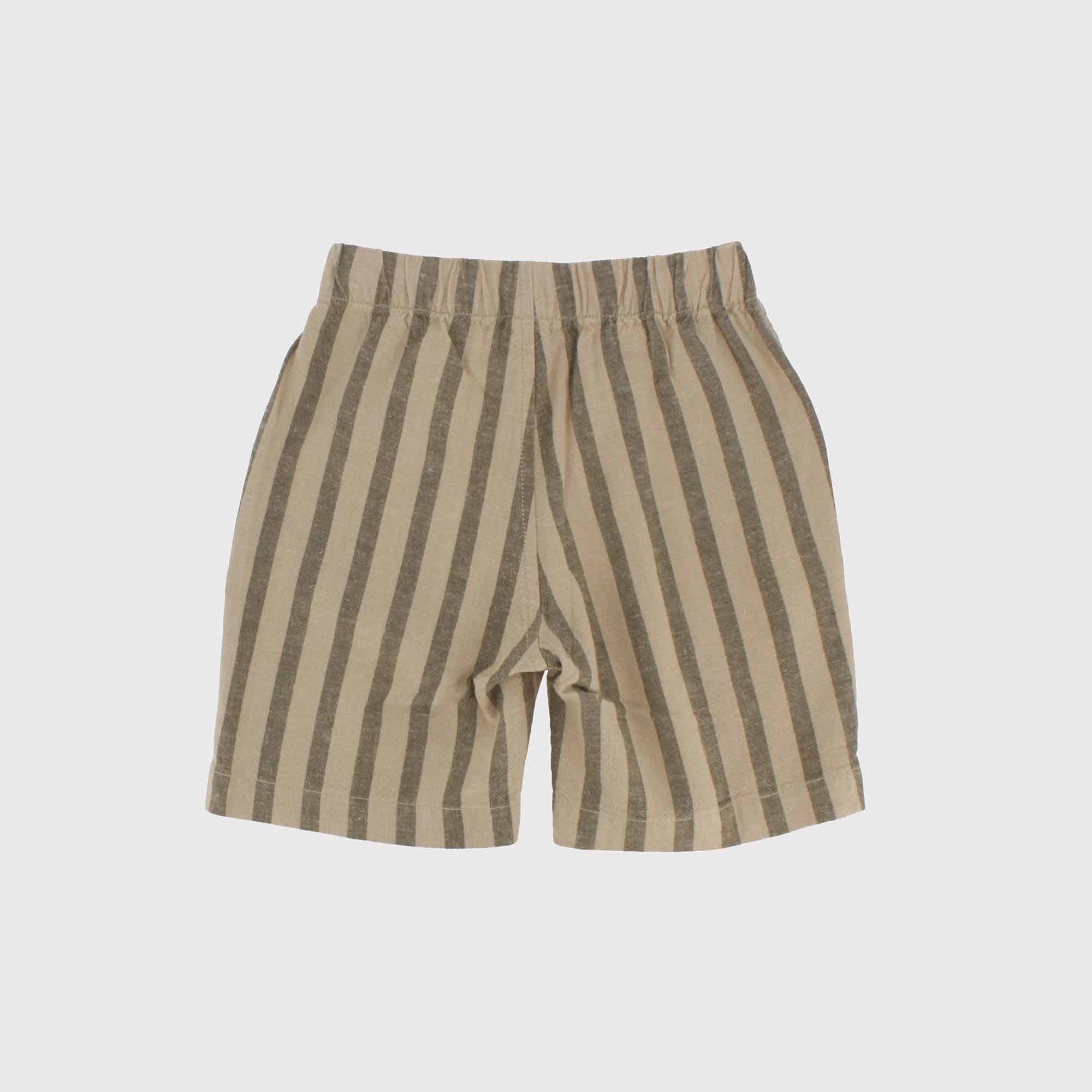 Bermuda with stripes yarn died, with elastic waist and botton applied. French pockets on the front.