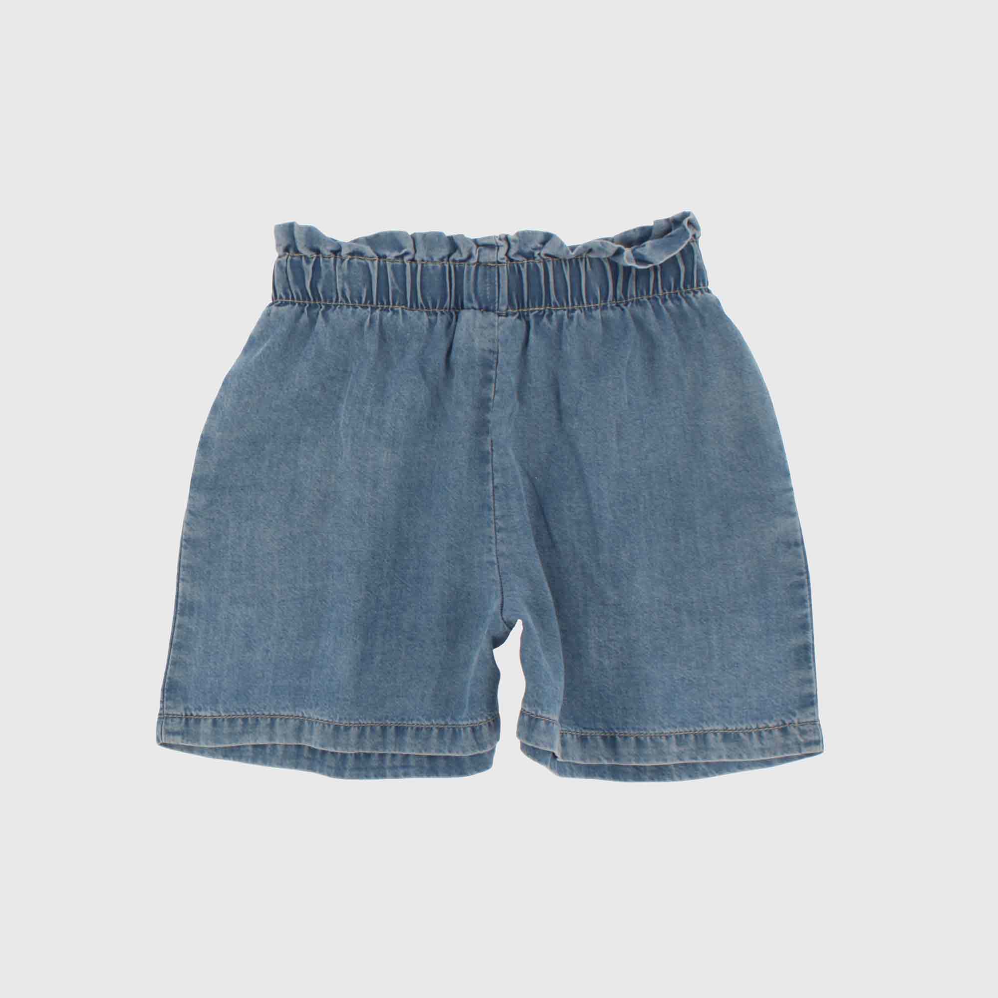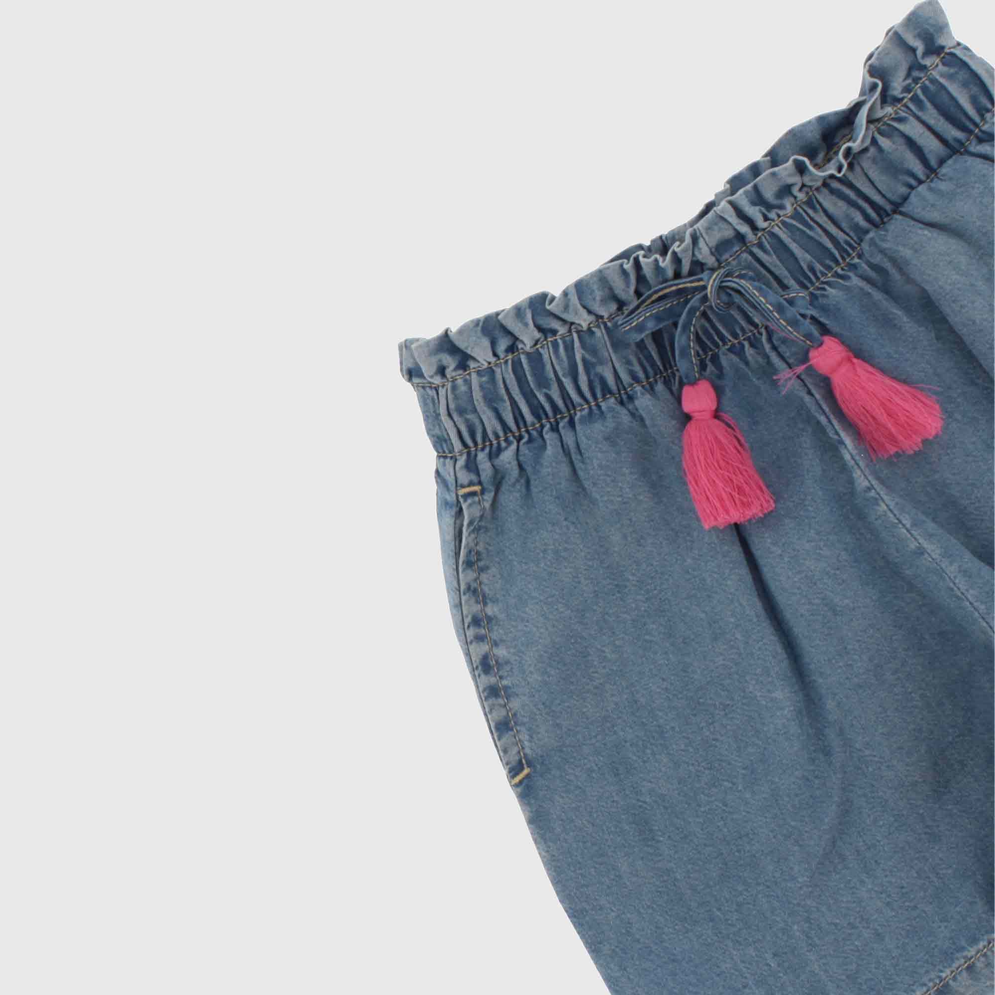 Shorts in light Jeans with elastic waist and front laces with contrasting pompons.