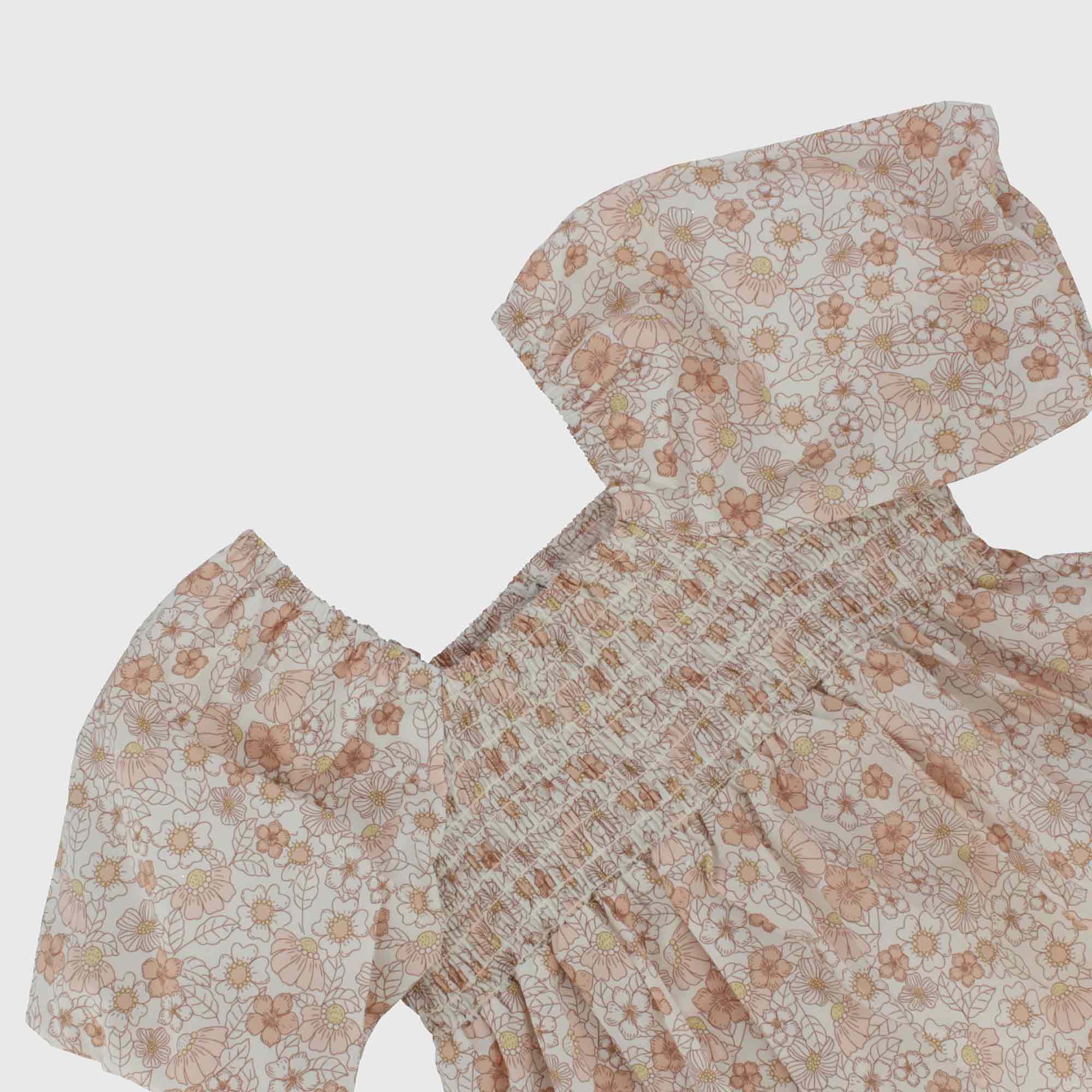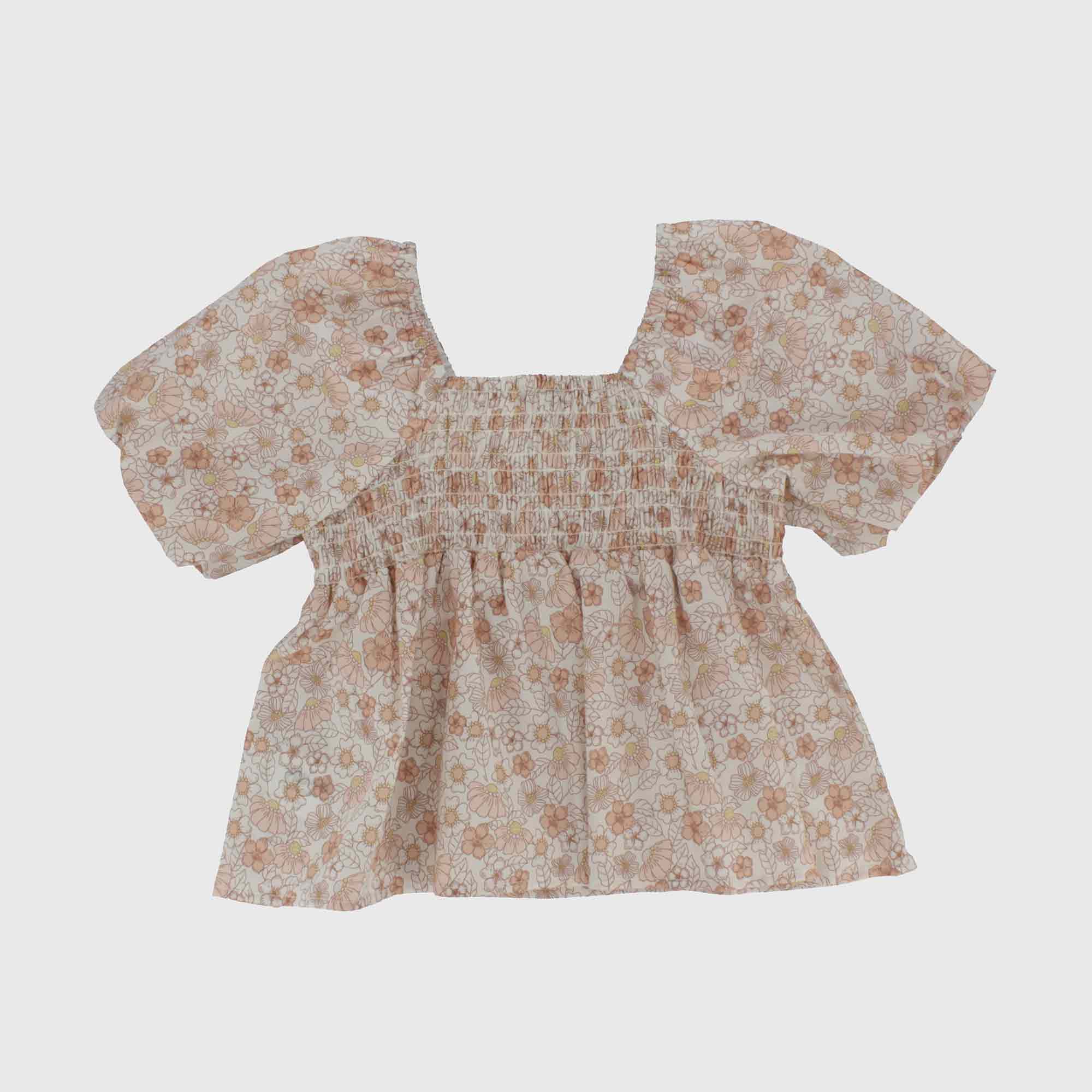 Blouse in printed coton, squared collar, with short ballon-sleeves. Elastic curl on shoulders and on the back.