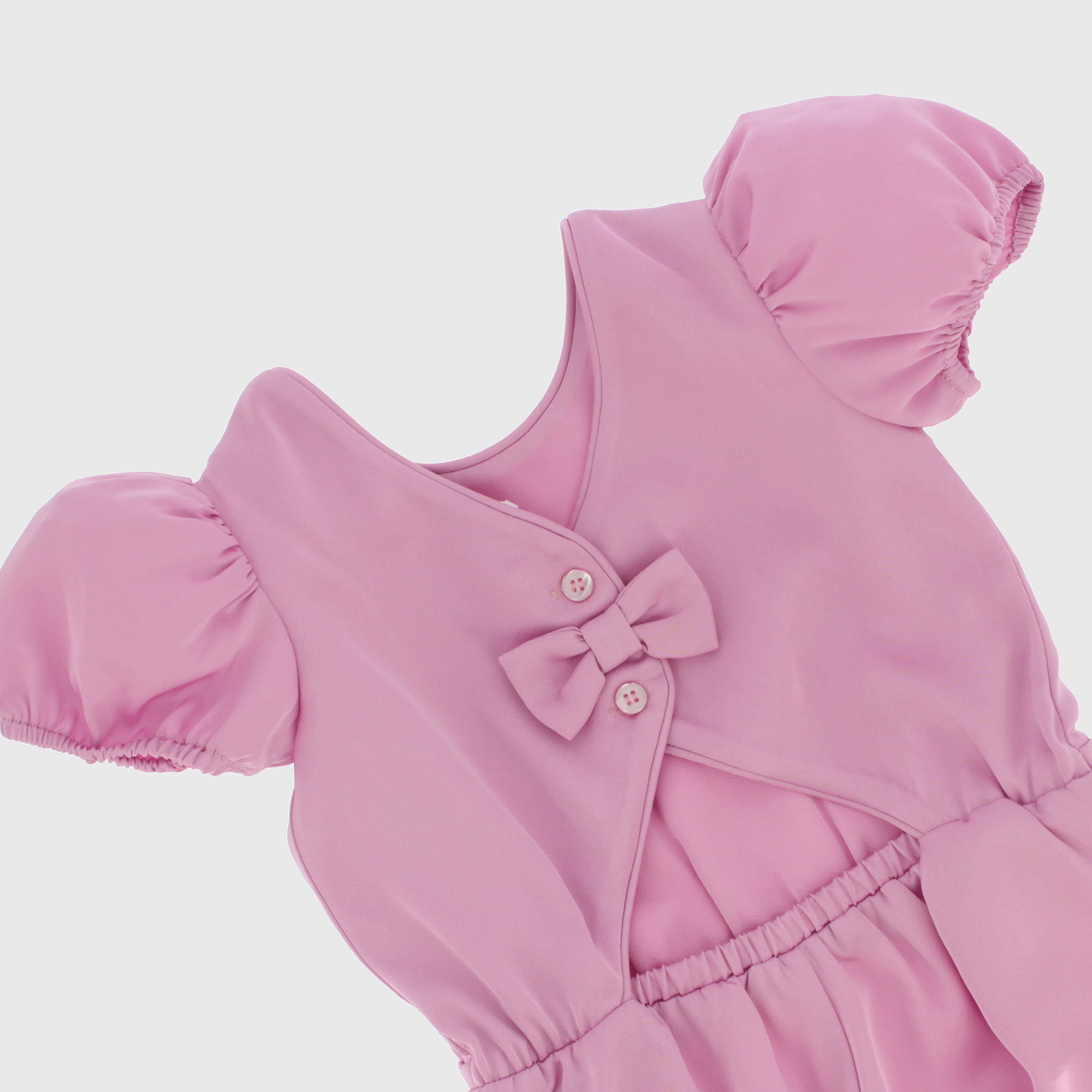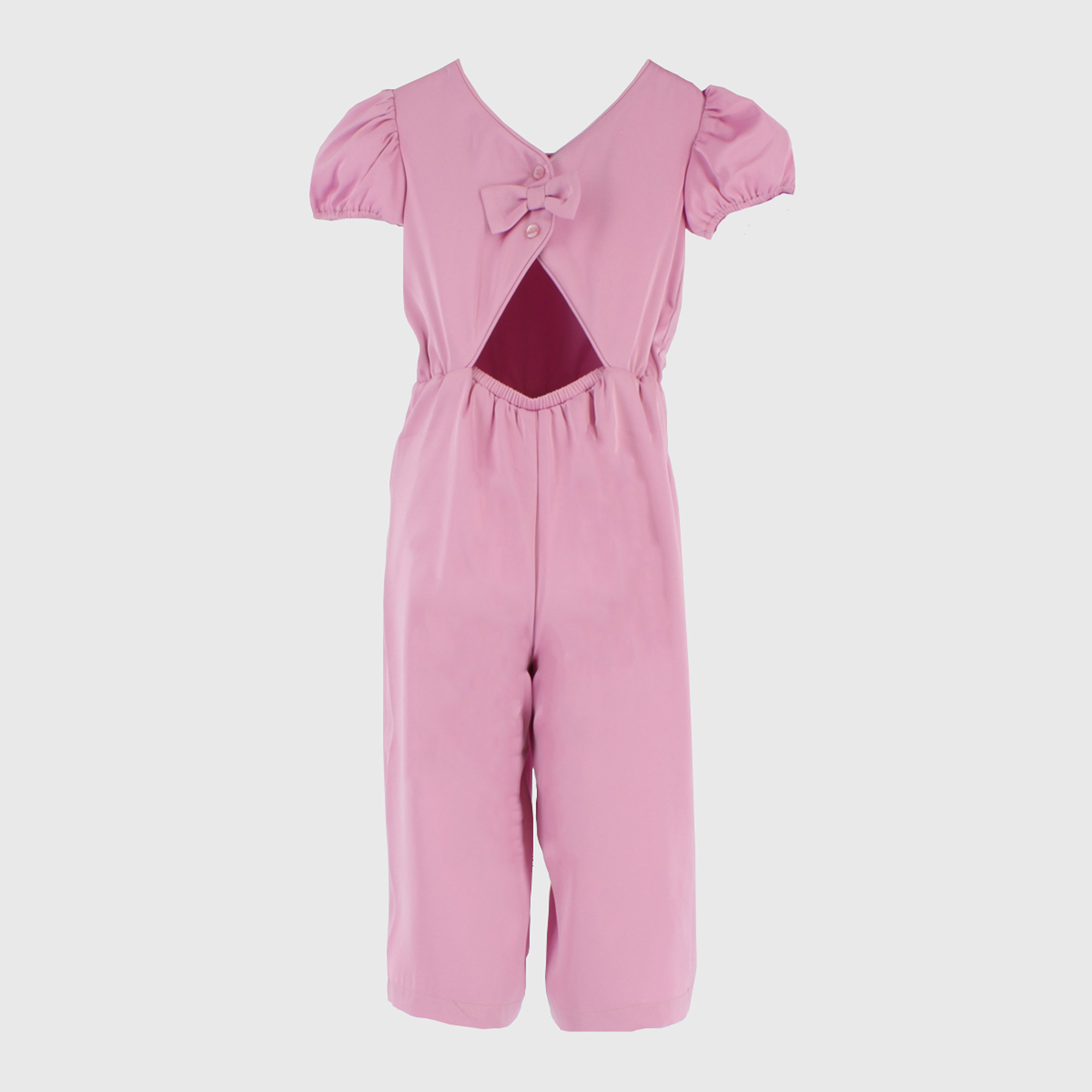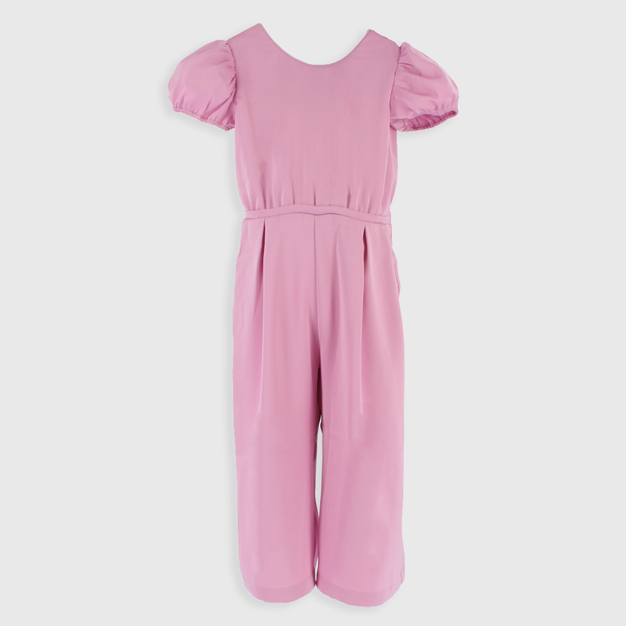 Jump suit in satin, round-neck and short ballon-sleeves. Back-closure with buttons and applied bow. Elastic on the waist only on the back. French pockets on the front.