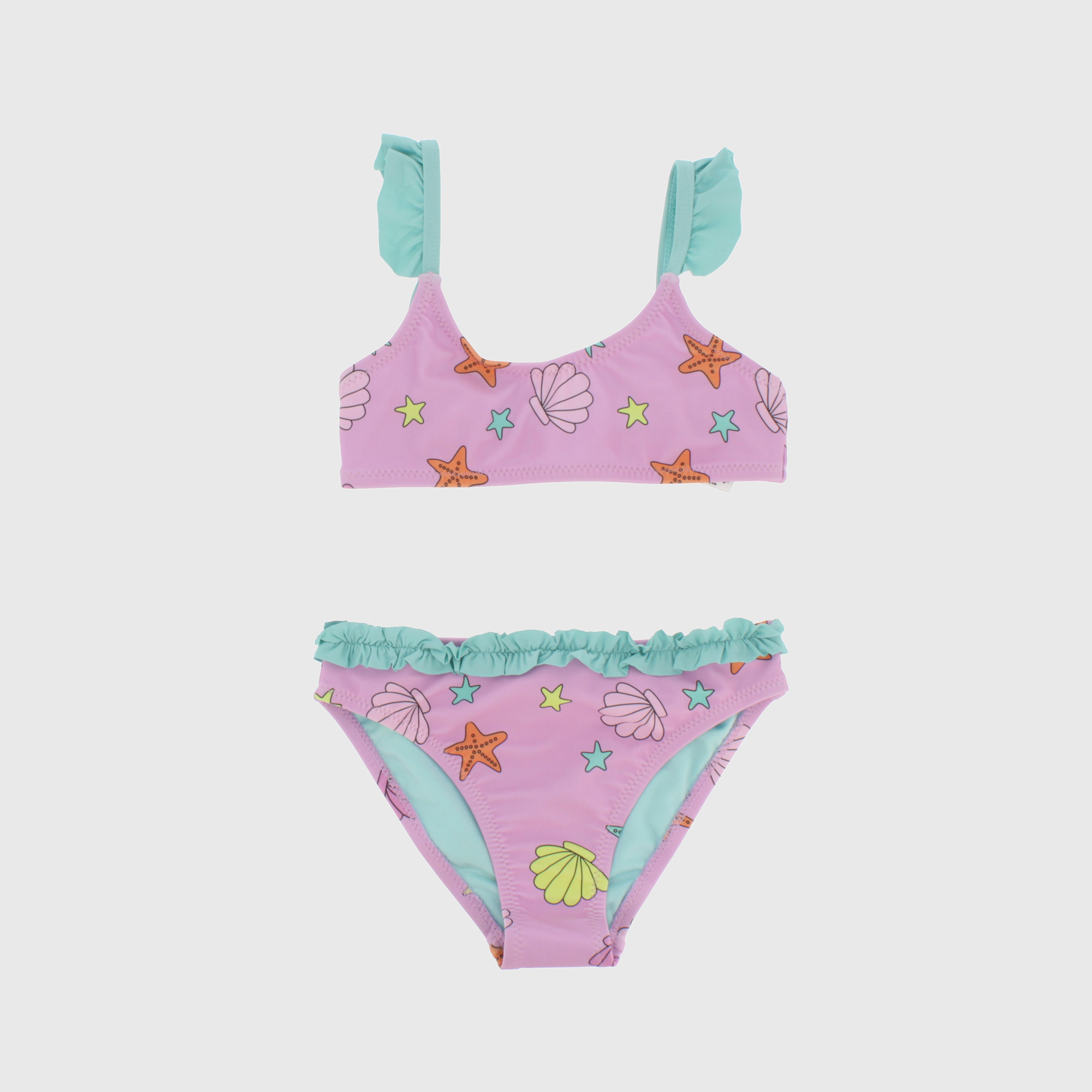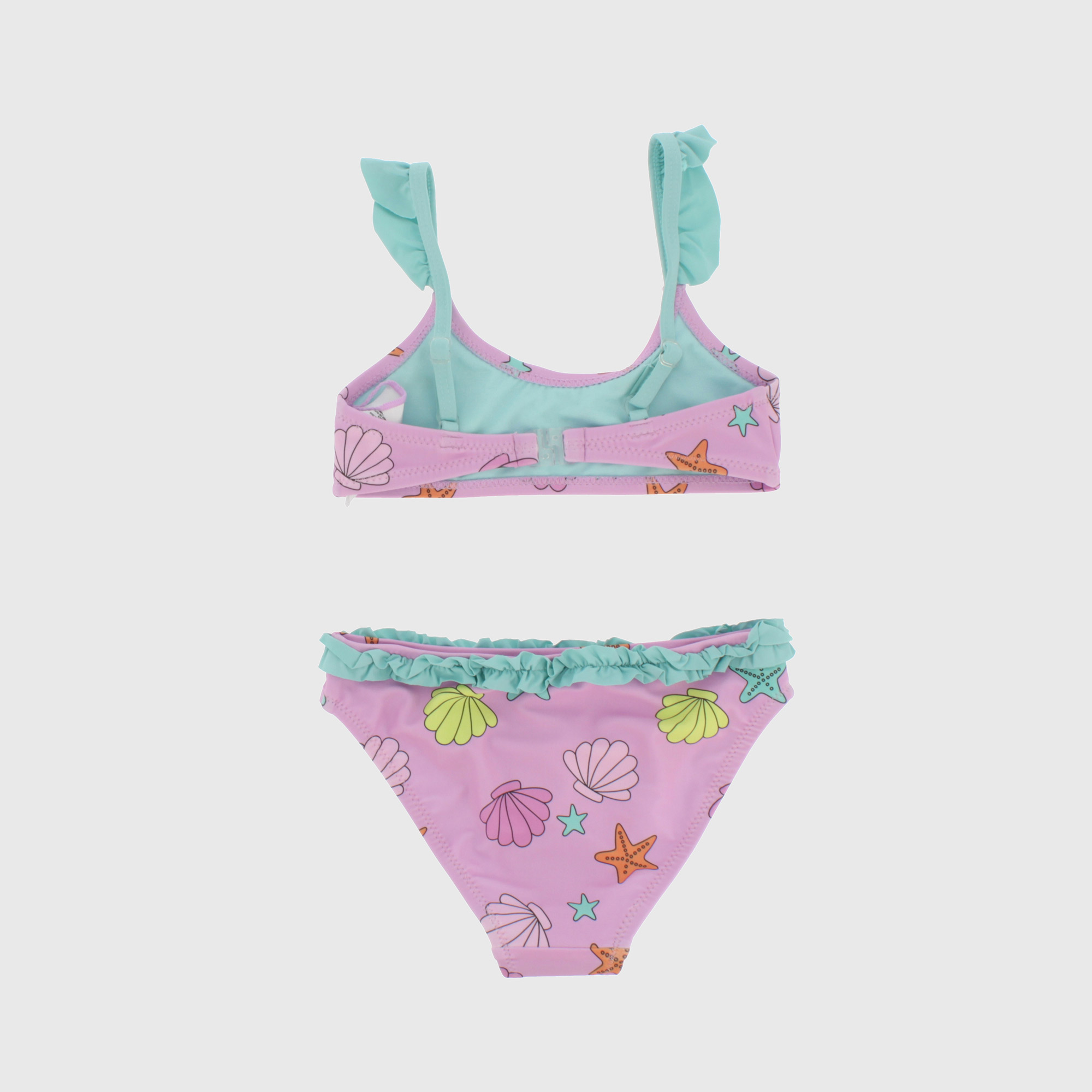 Printed bikini with top and combined slip. Top with ruffles on the shoulders. Slip with volants.