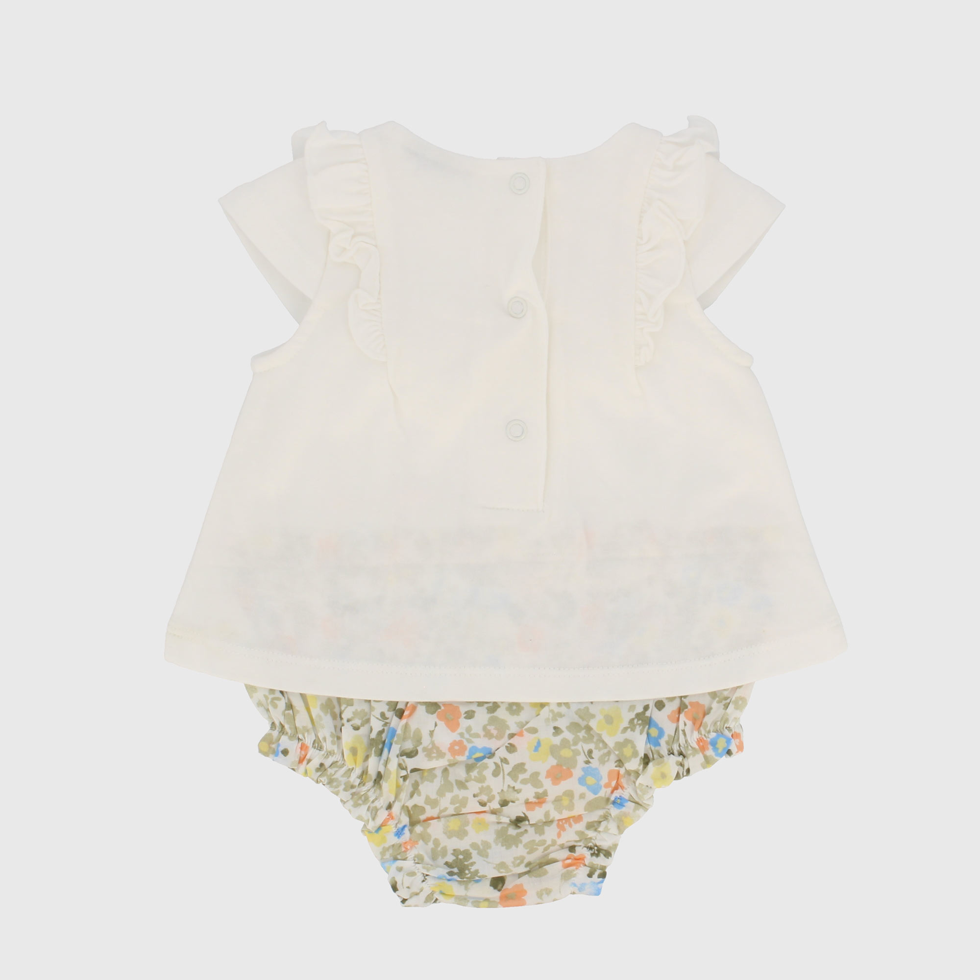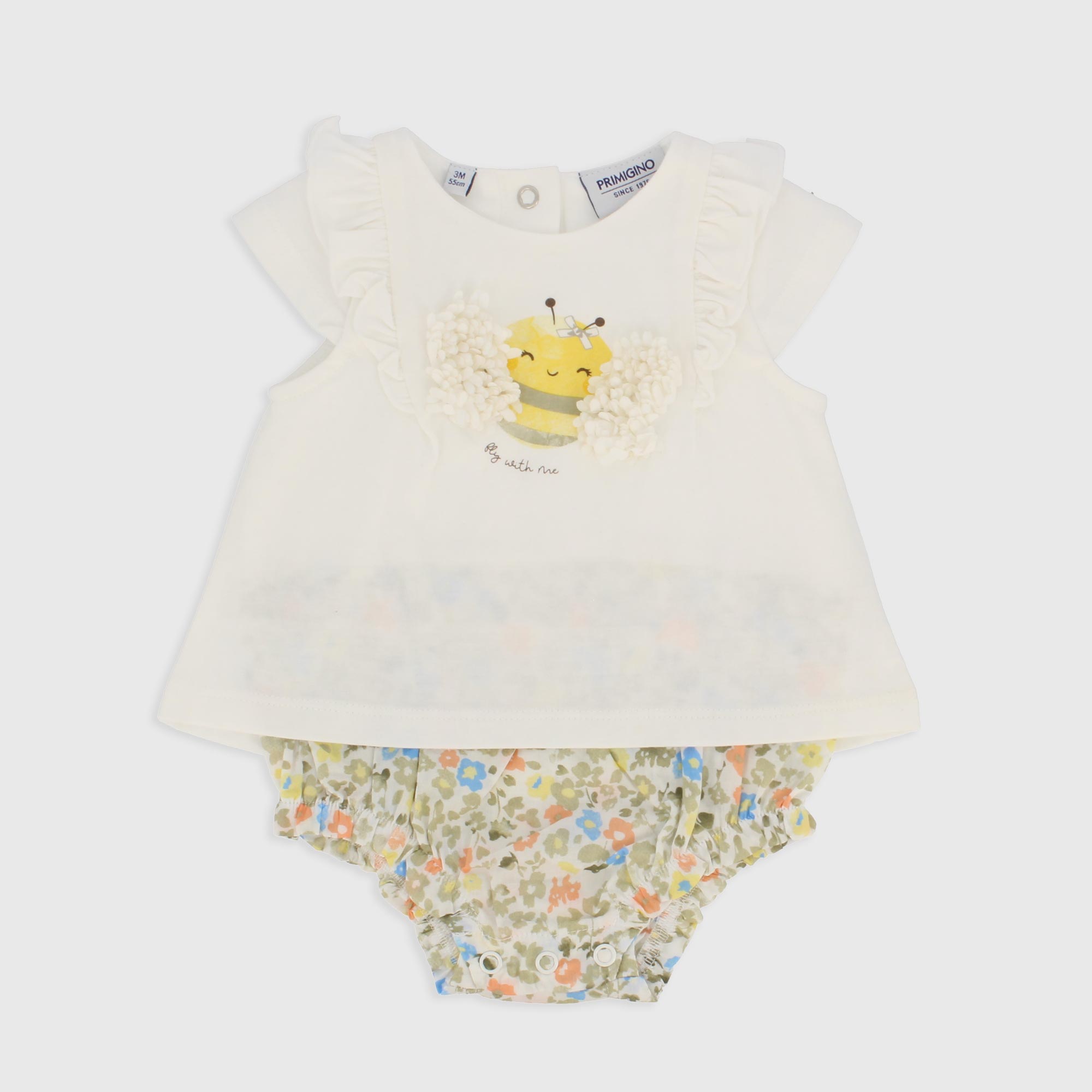 Romper in jersey, round-neck, with long sleeves. Back-closure and on the crotch with automatic buttons. Printing on the front with embroidered wings 3D effect. Slip in printed coton.