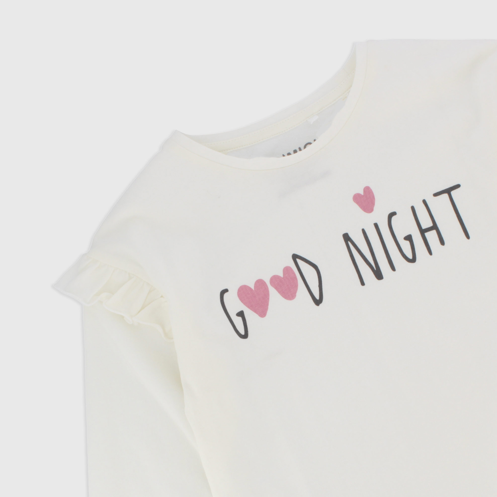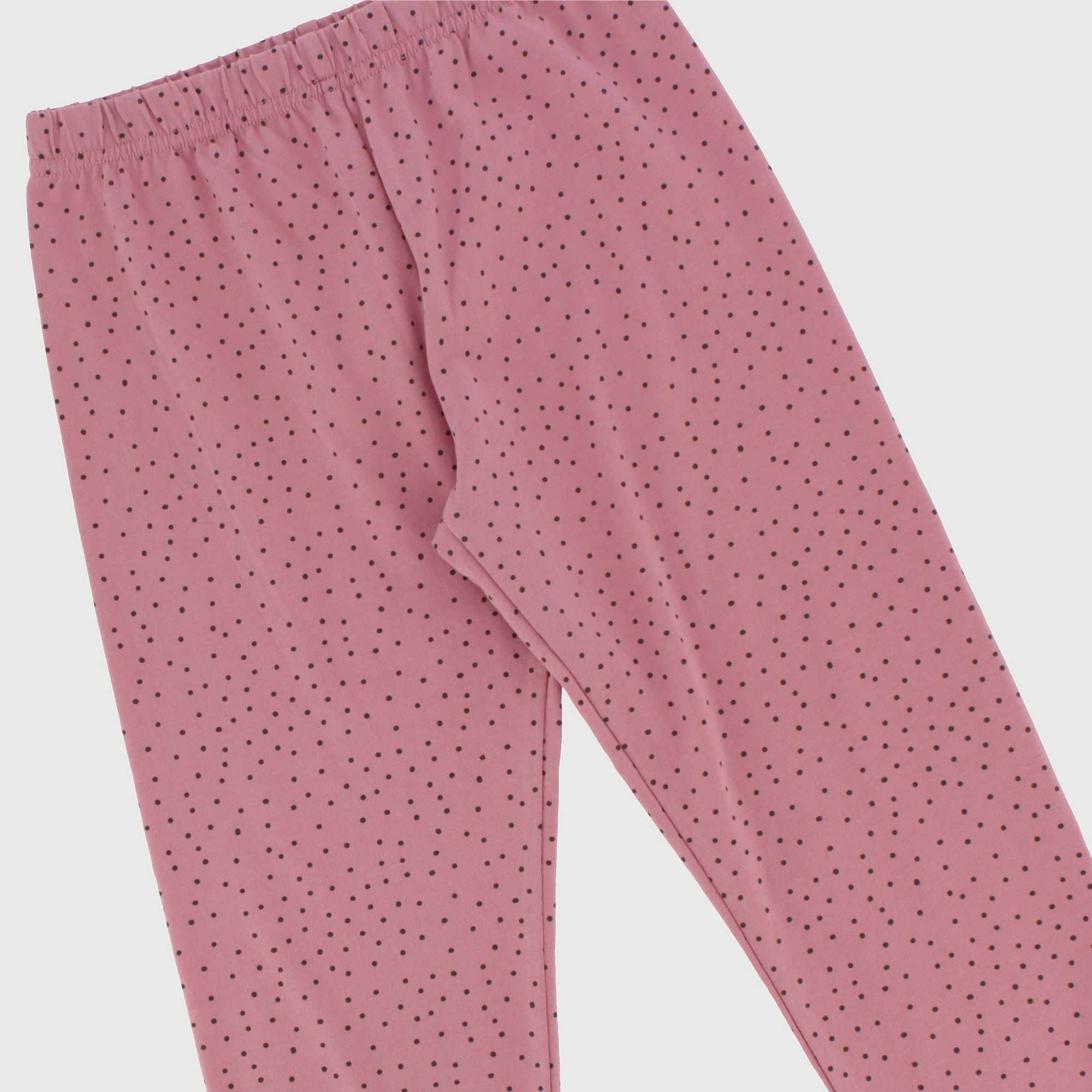 Pyjama set in jersey. T-shirt round-neck long sleeves. Small ruffles on the shoulders. Printing on the front. Trousers with elastic waist and printing all-over Polka-Dots.