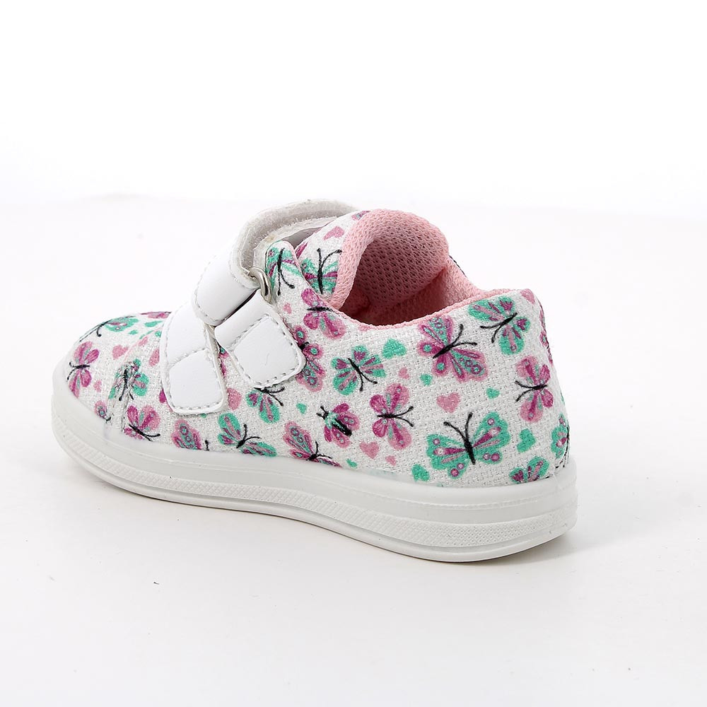 These low fabric first steps sneakers are practical, lightweight and very easy to put on independently. They have velcros and a soft mesh lining. The sole is flat and the leather insole is removable so it can be left to air dry.