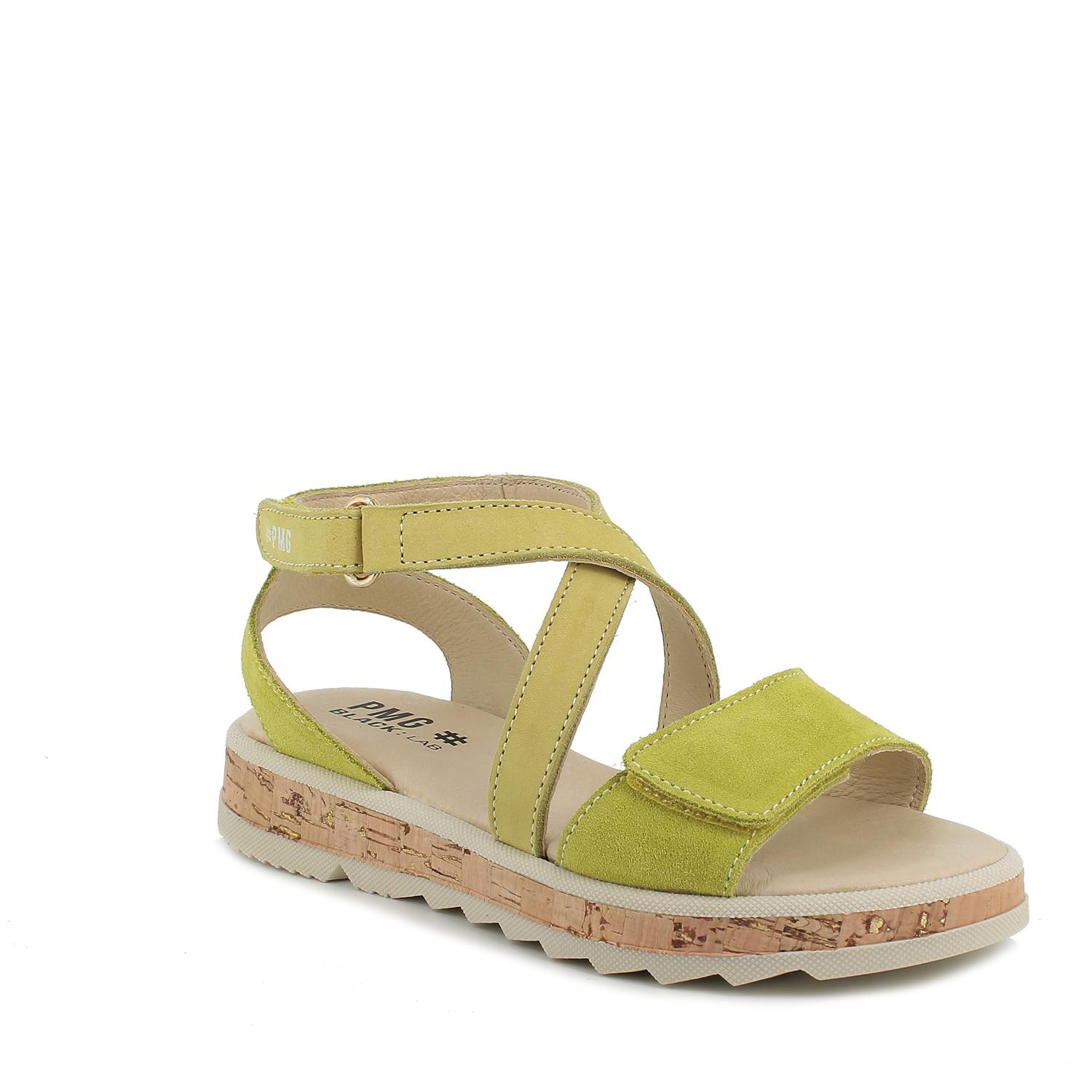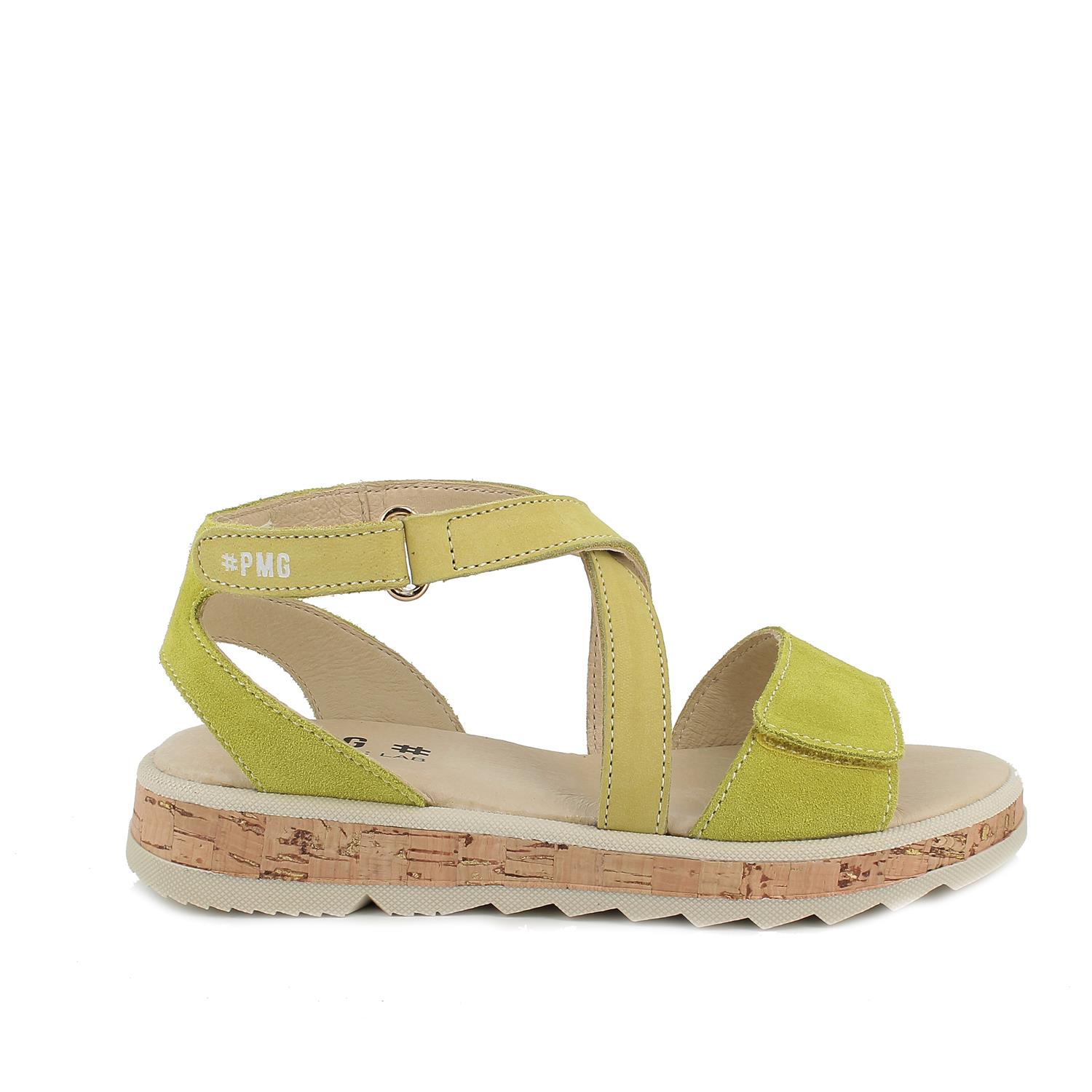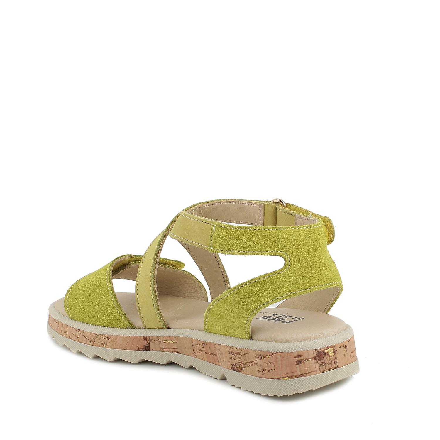 Girls' leather sandals with a classic silhouette with an adjustable front band and crossed straps on the back of the foot. The slightly wedge sole is decorated with a cork effect insert. The foot rests on an insole covered in technical material that offers breathability like natural leather.