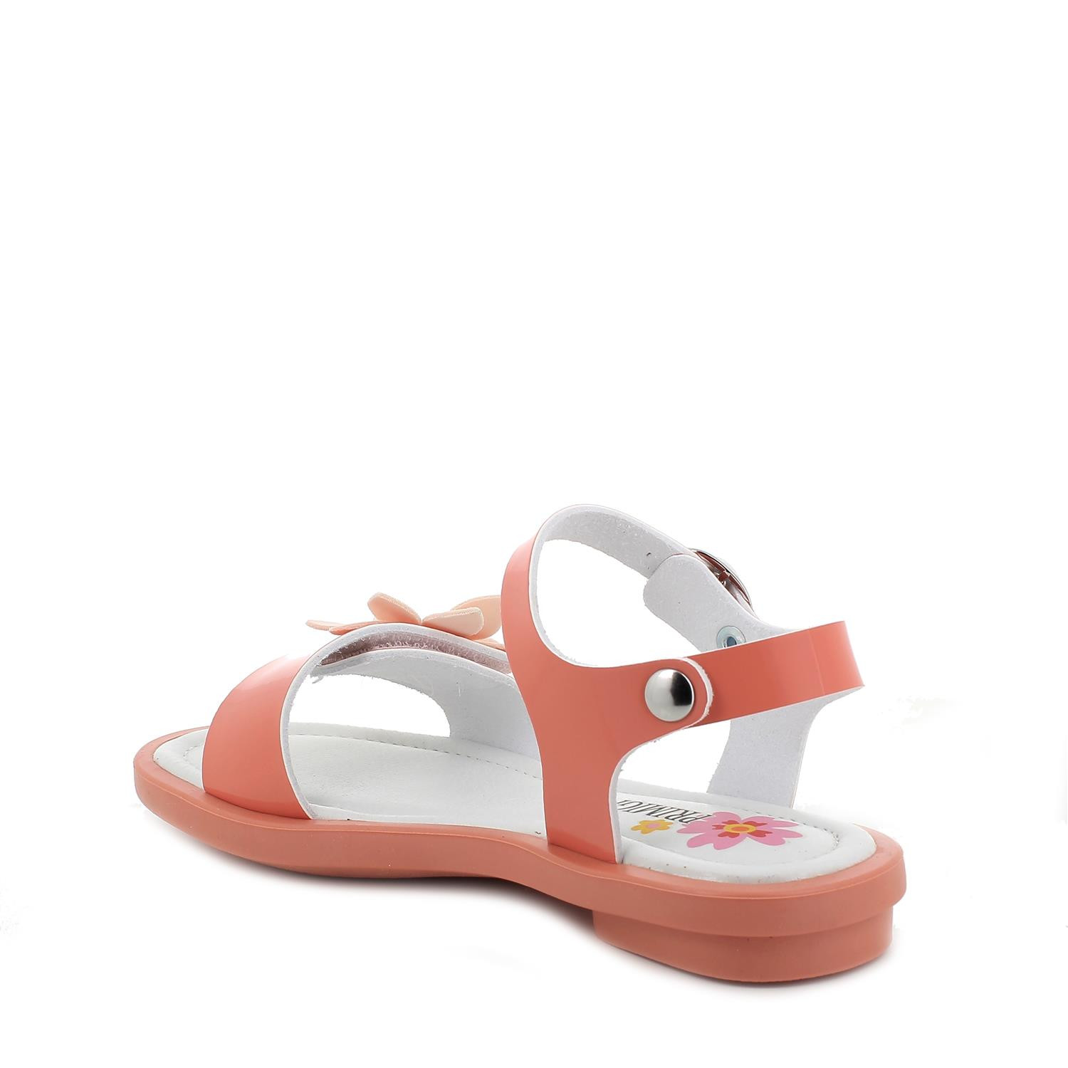 Girls' patent leather sandals with wide adjustable band on the front and applied flower. The glitter detail makes them shine in the summer sun. They have an ankle buckle. Unlined, they have a footbed covered in delicate leather. The sole has a small heel and is flexible and non-slip.