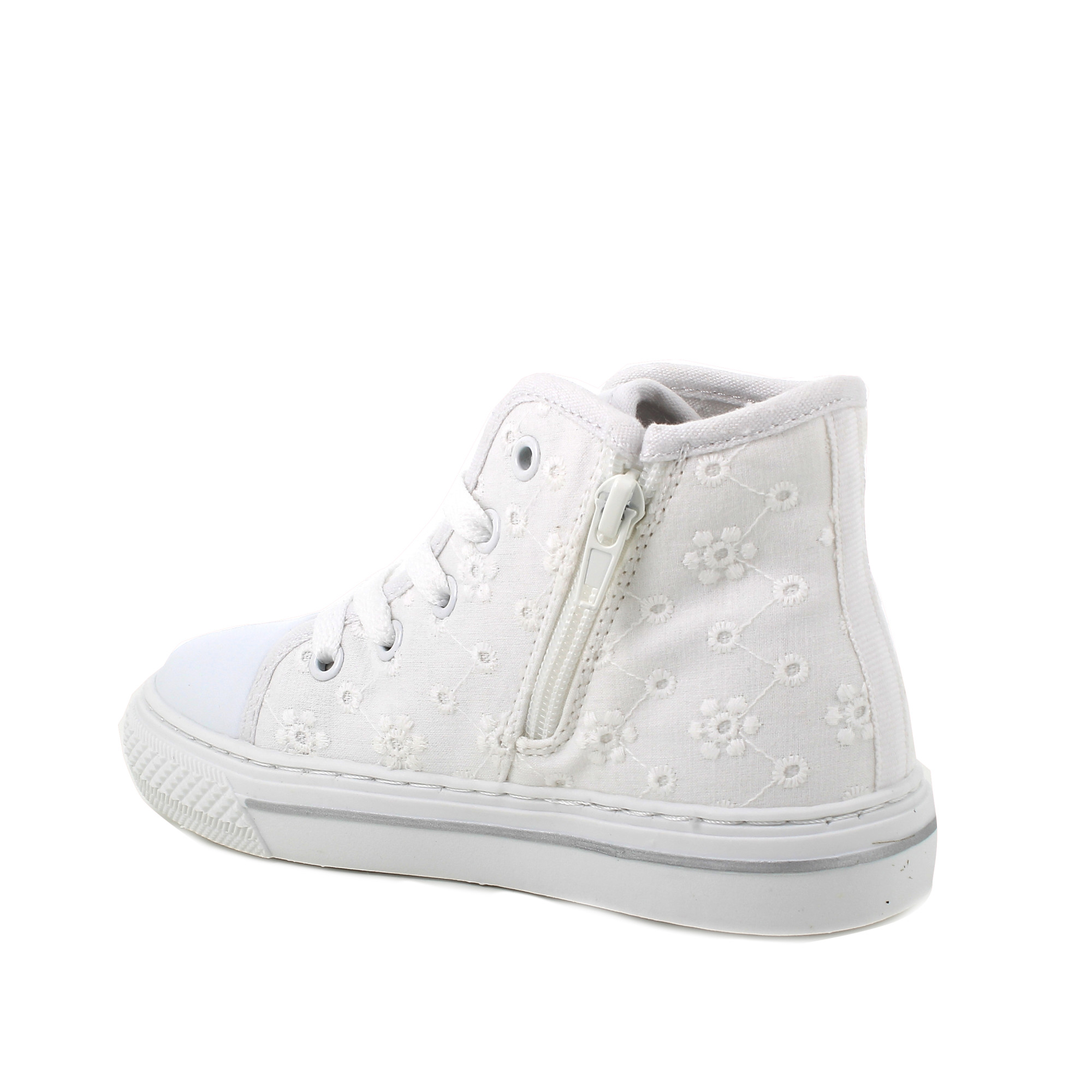 High fabric sneakers for girls. Easy to match and suitable for special occasions. In addition to the laces, they have a practical internal zip. The tip is protected by a large insert decorated with rhinestones. The sole is flat and with a rounded tip. The insole is removable and covered in leather to ensure breathability and hygiene.