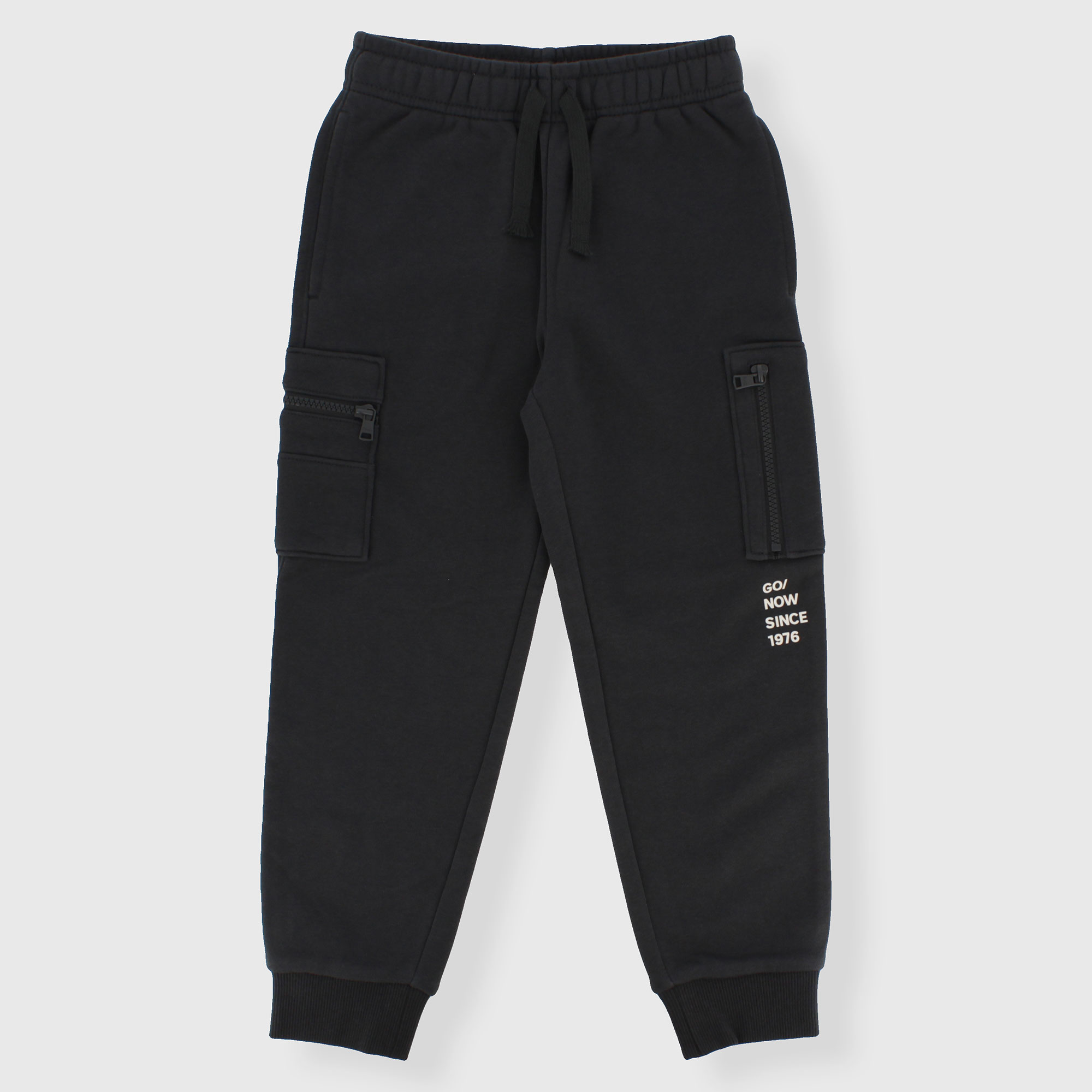 Fleece trousers with soft brushed interior. Elasticated waist with front laces. Large side pockets with contrasting zip and small rubberized effect print. Ribbed bottom.