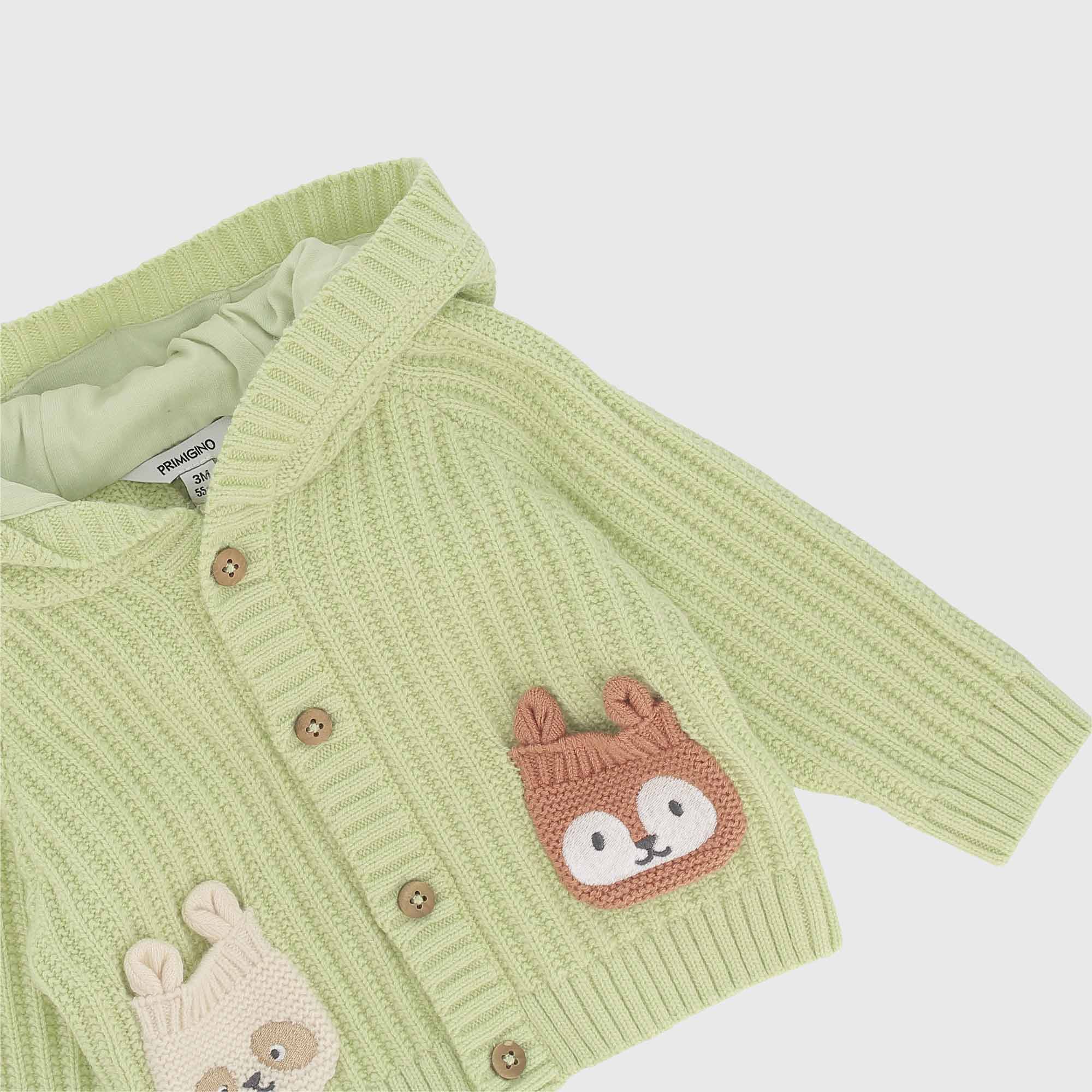 Soft knit cardigan with hood, long sleeves. Button closure on the front. Patch pockets with little animals.