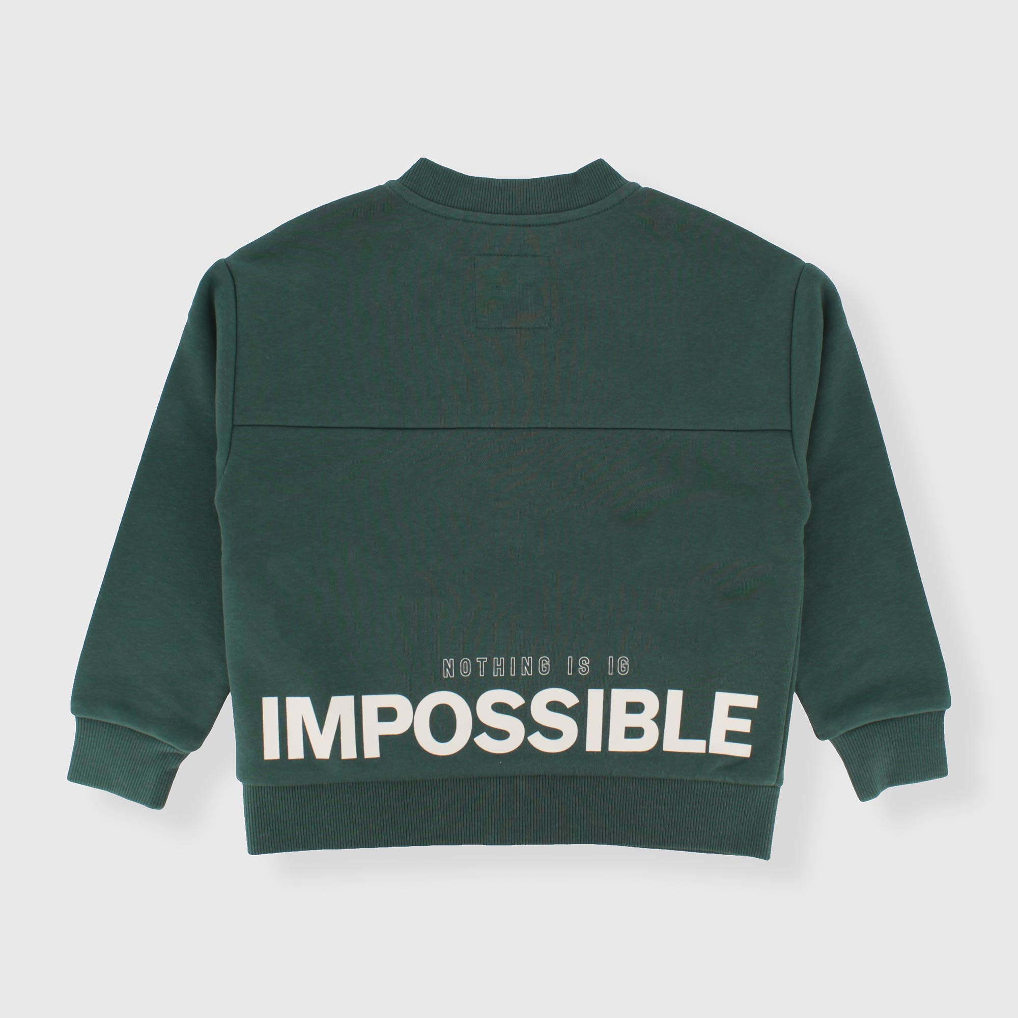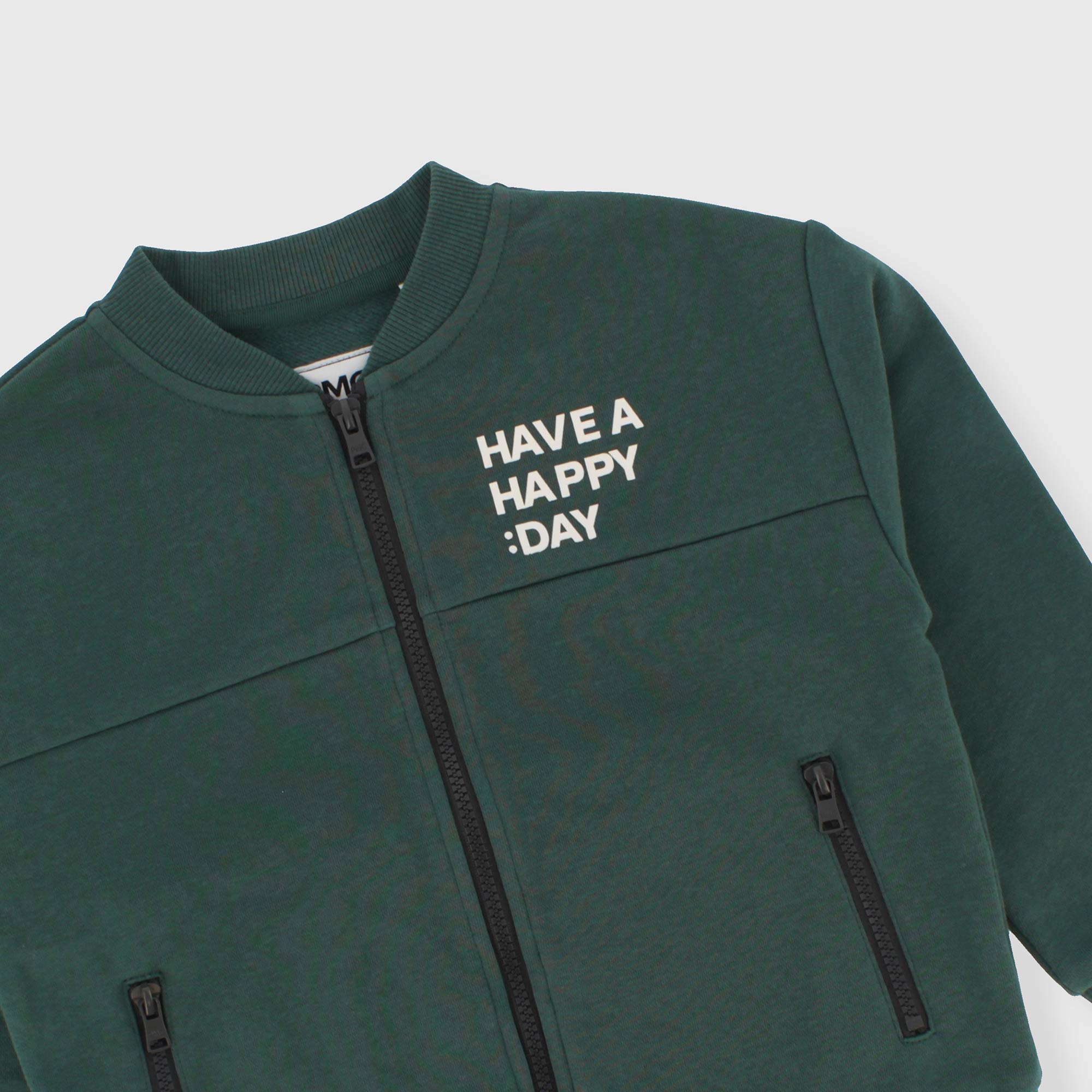 Sweatshirt with soft brushed interior, half collar, long sleeves. Zip closure on the front. Front zip pockets. Print with writing on the front and back. Ribbed collar, cuffs and bottom.