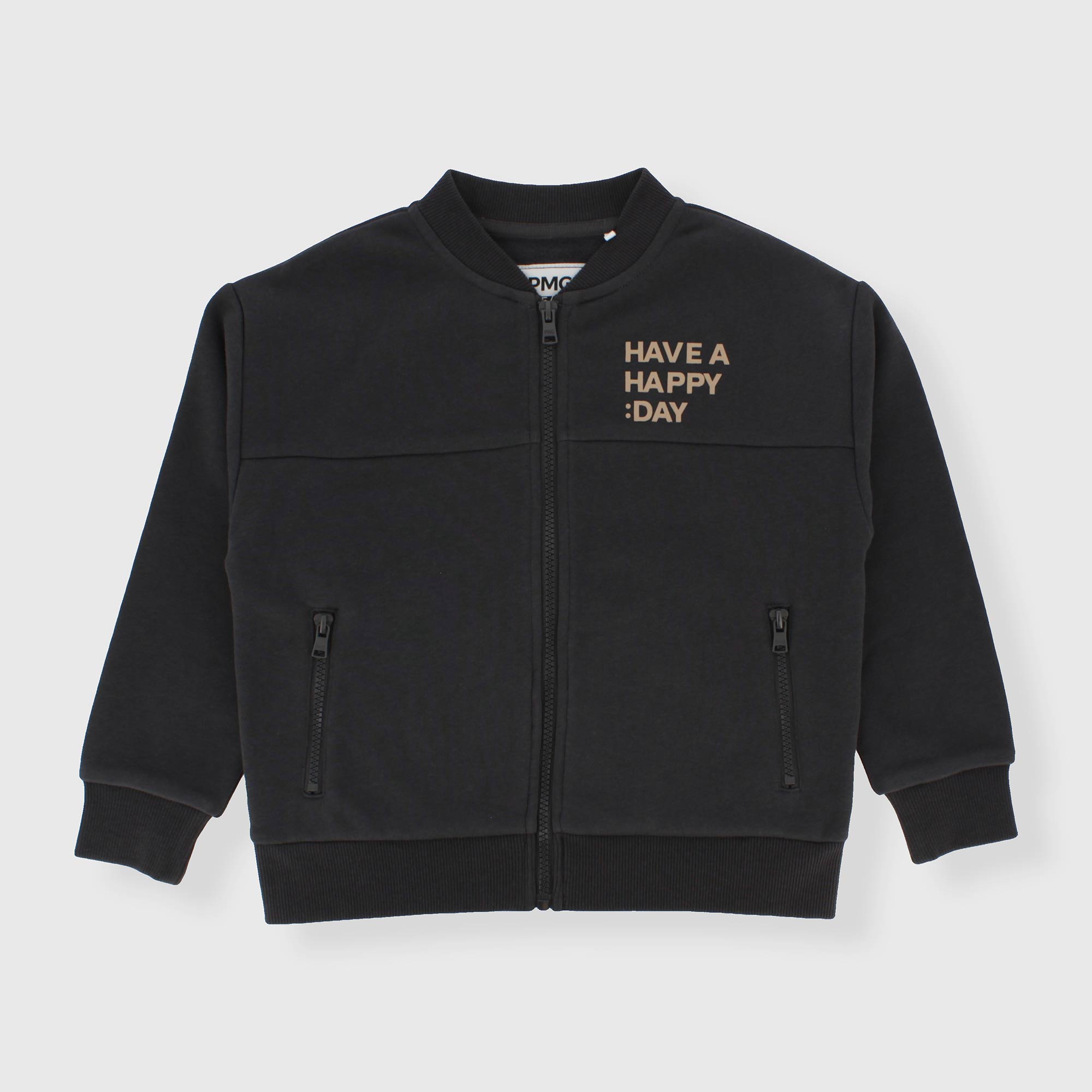 Sweatshirt with soft brushed interior, half collar, long sleeves. Zip closure on the front. Front zip pockets. Print with writing on the front and back. Ribbed collar, cuffs and bottom.