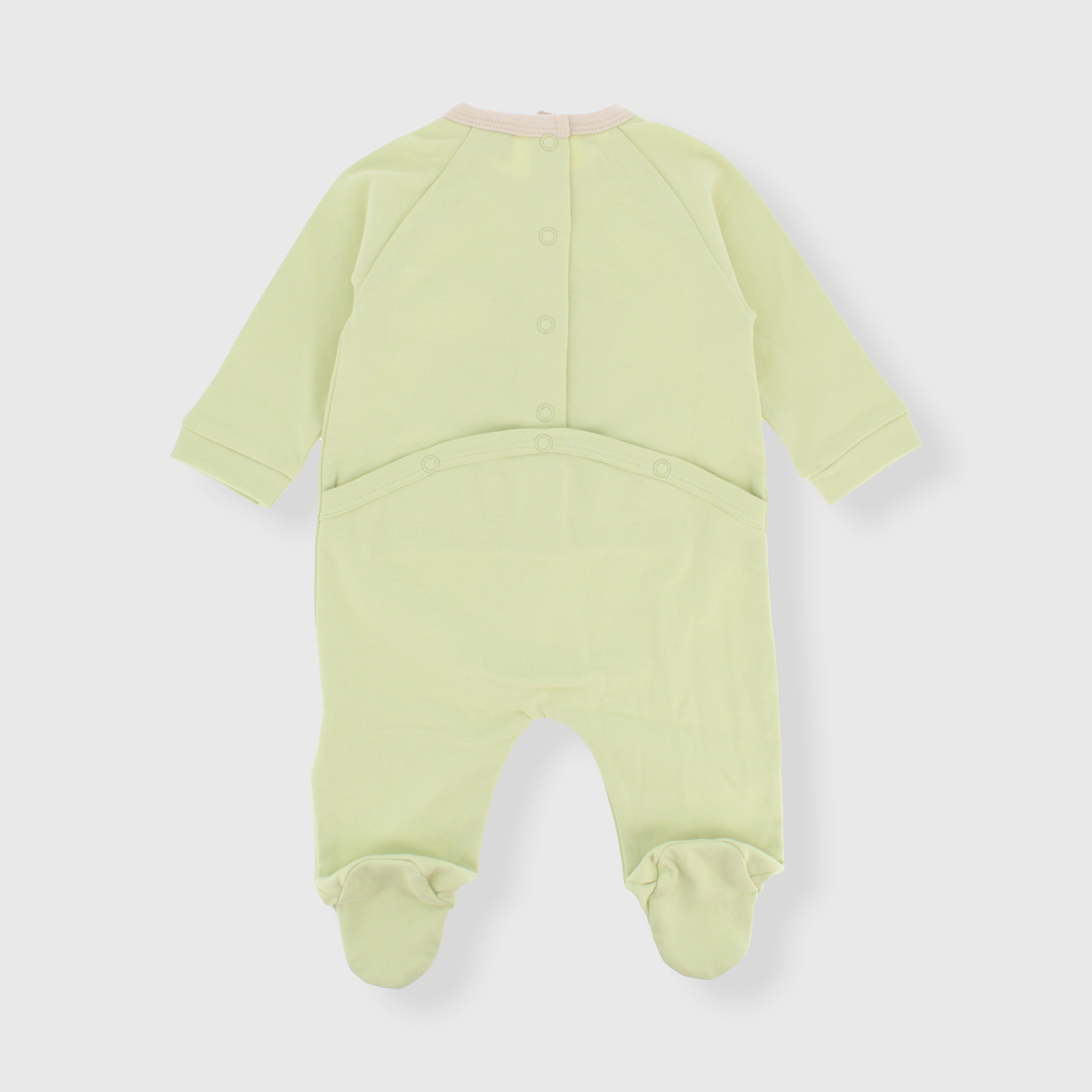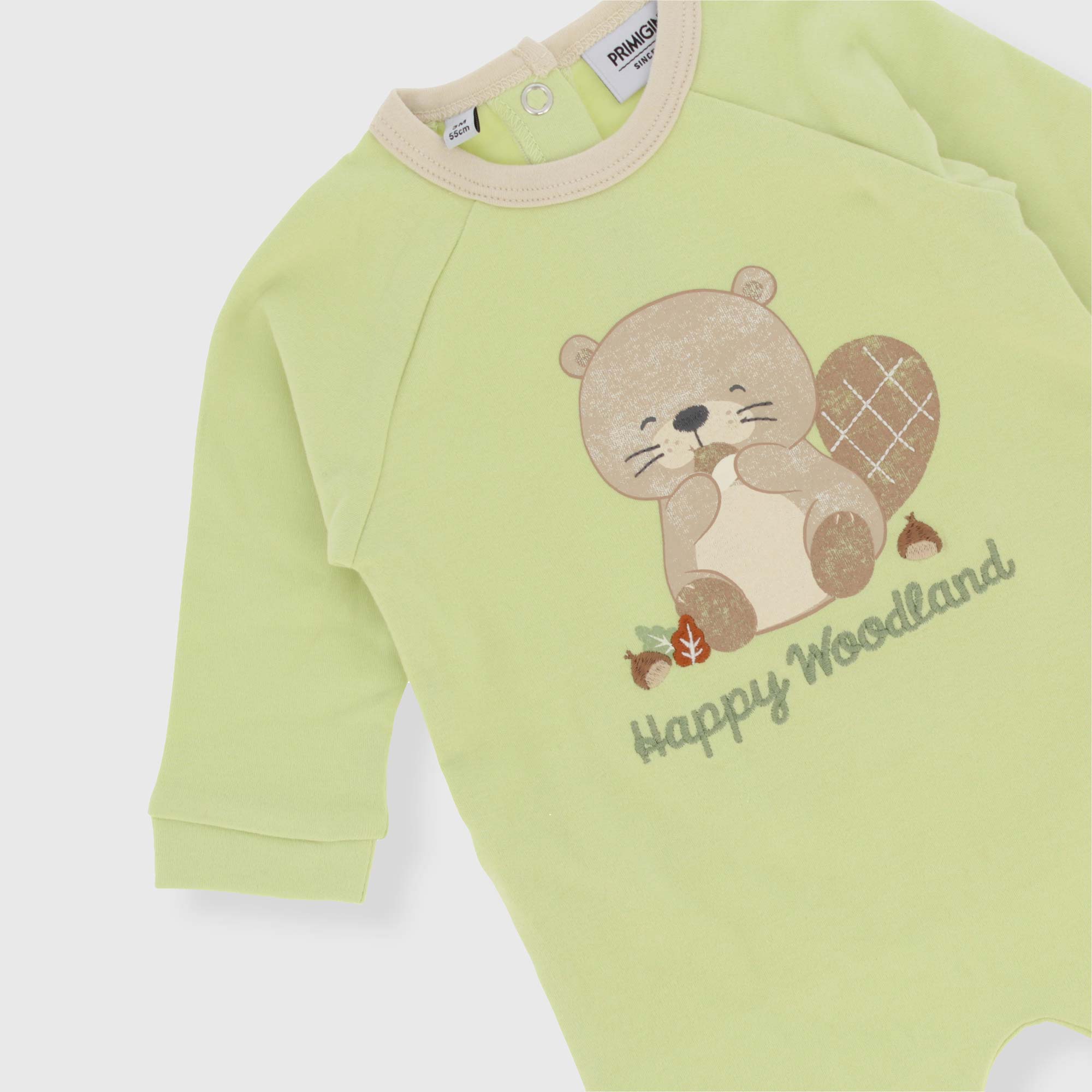 Crew-neck interlock playsuit with long sleeves. Closure with automatic buttons on the back. Printed squirrel and embroidery on the front.