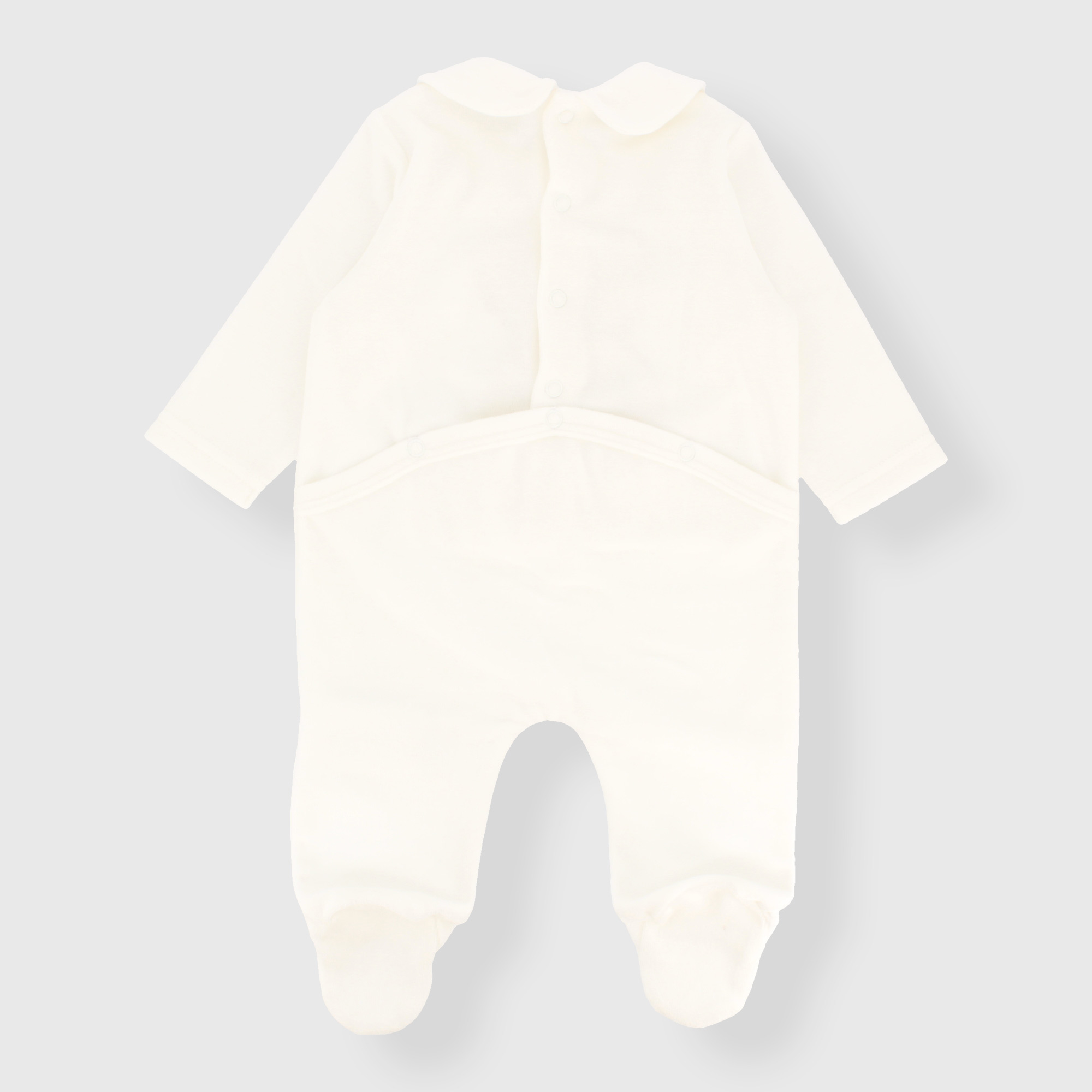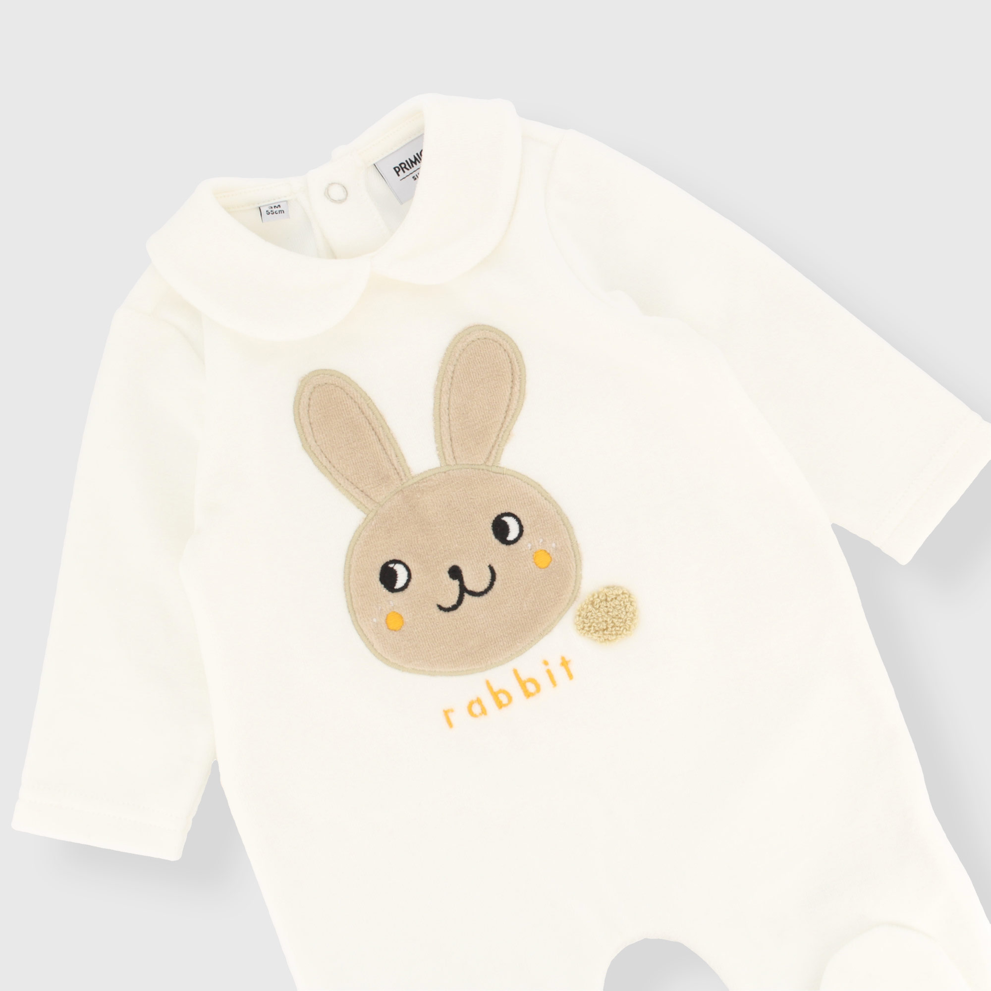 Chenille suit with peter pan collar, long sleeves. Closure with automatic buttons on the back. Rabbit embroidered on the front.