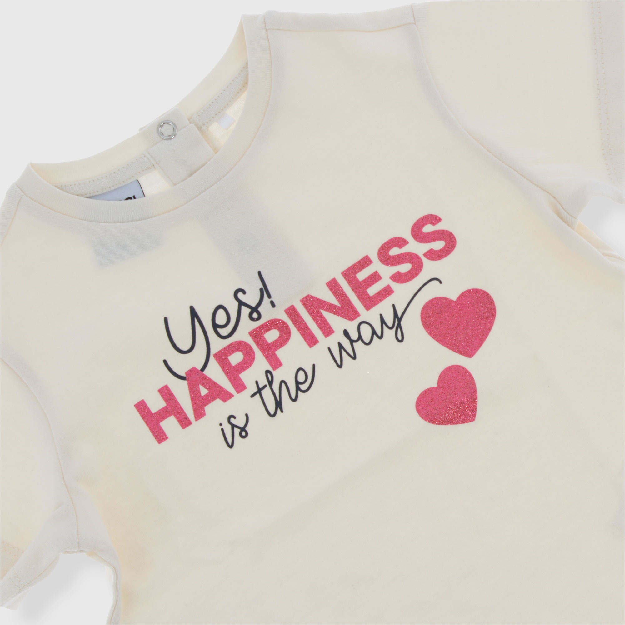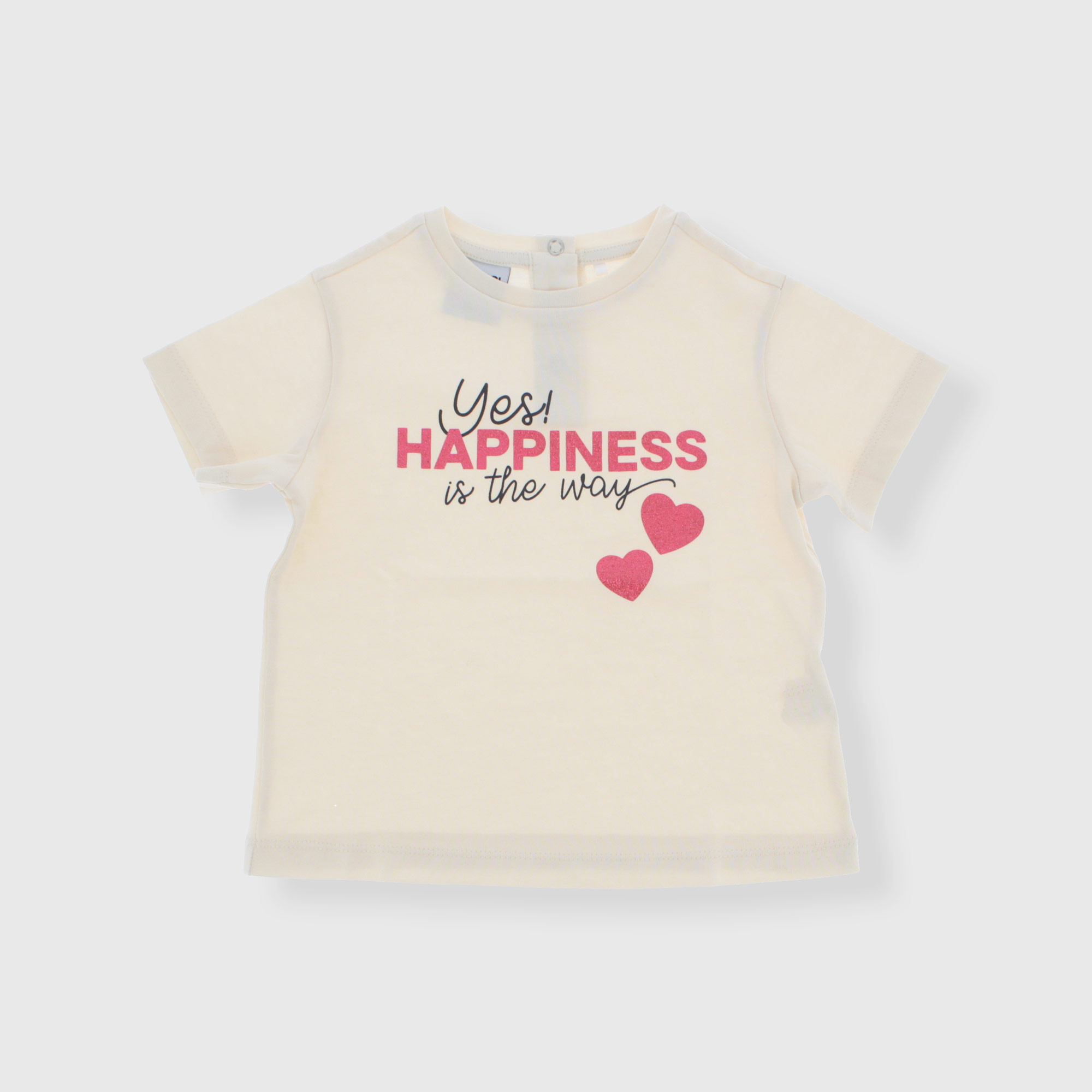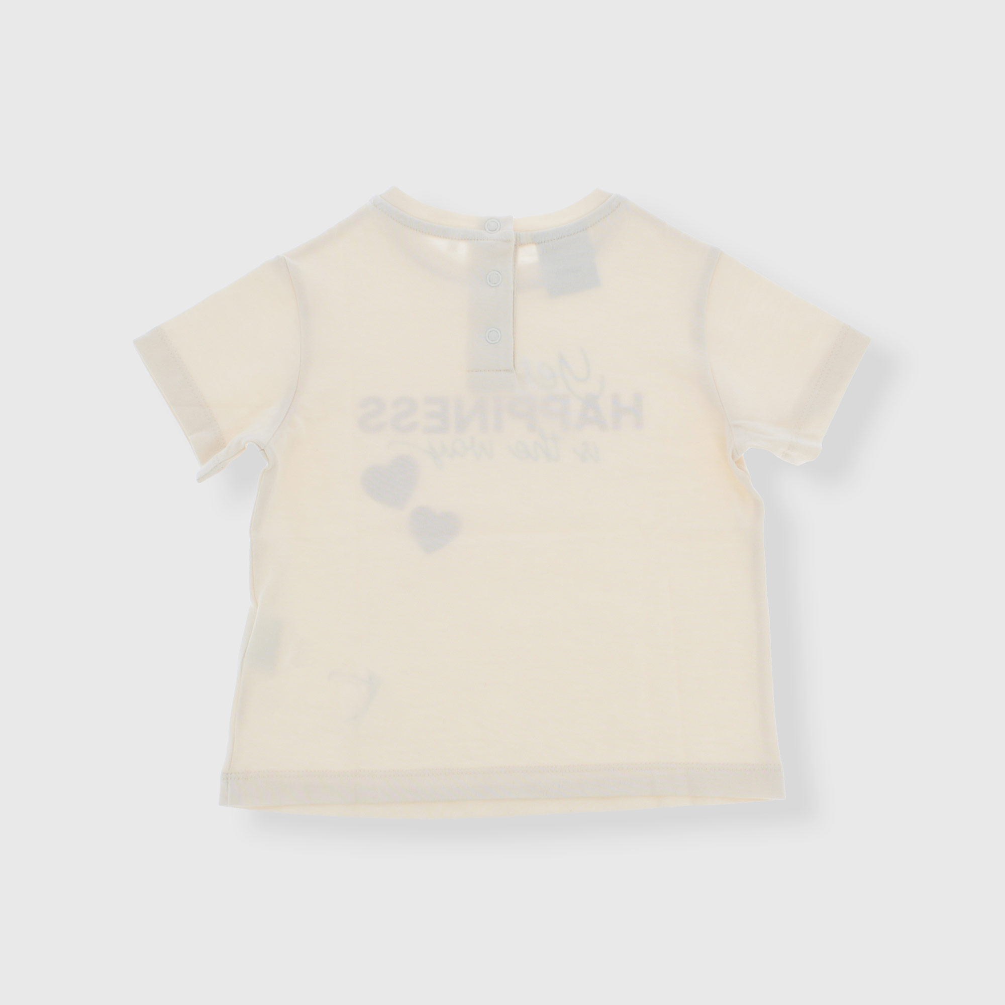 Jersey t-shirt, crew neck, short sleeves. Snap button closure on the shoulder. Print with glitter details on the front.