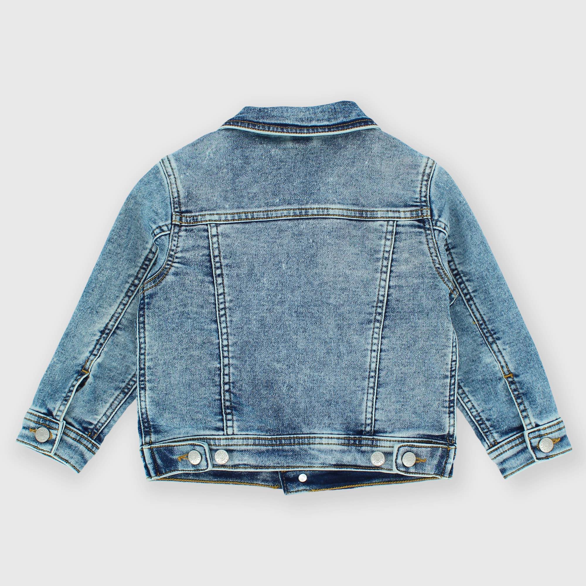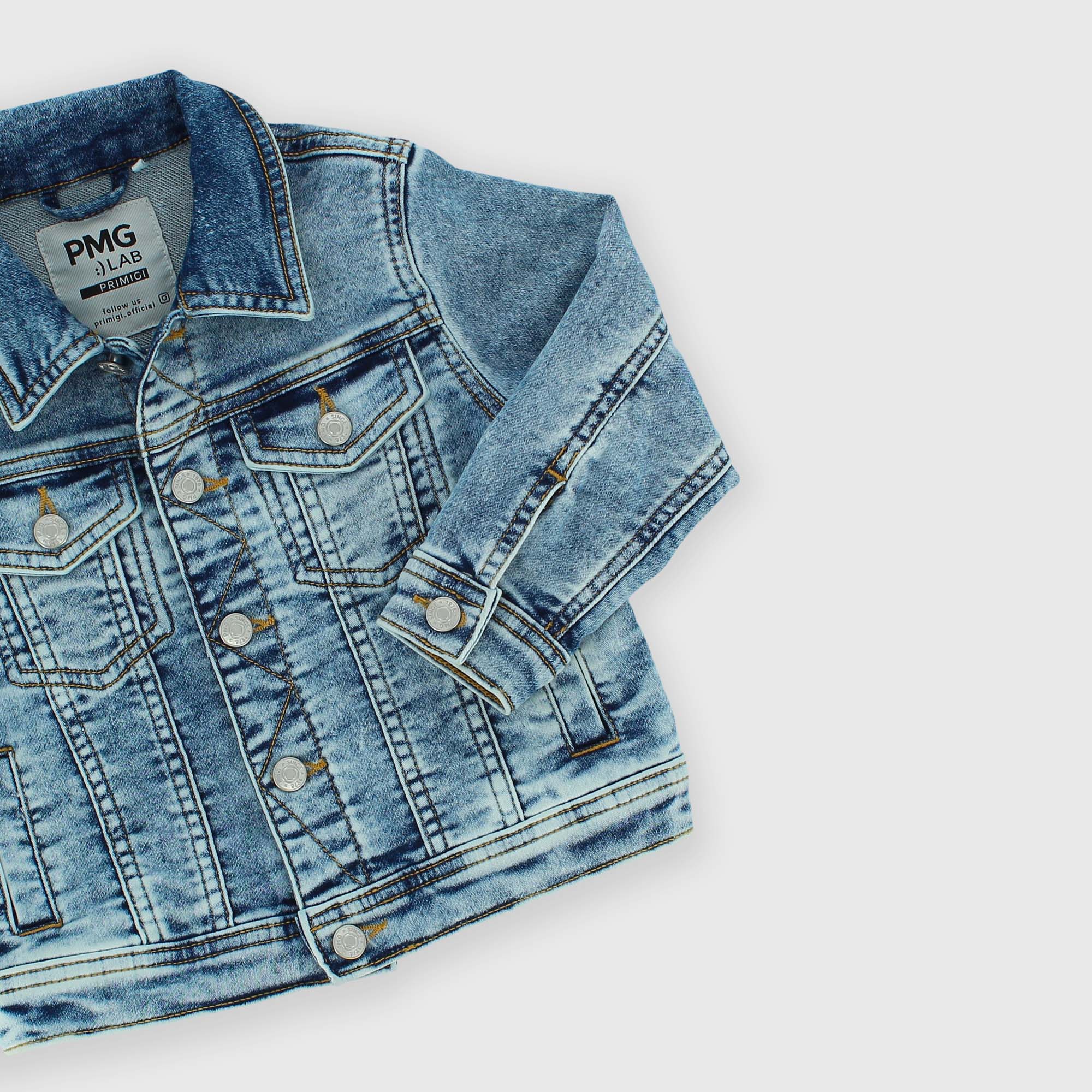 Denim jacket, with collar, with long sleeves. Button closure on the front. Welt pockets and flap on the front.