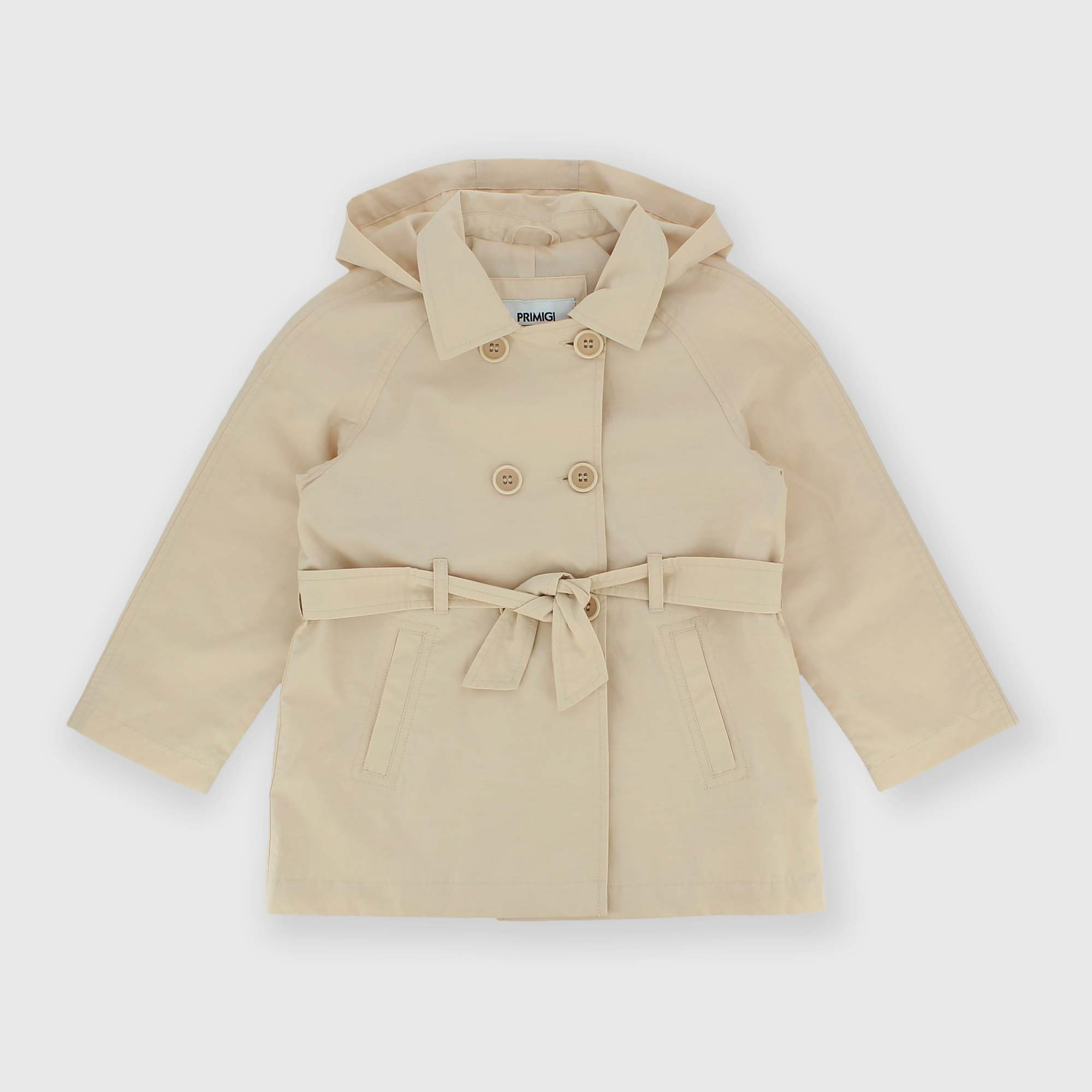 Nylon trench coat with hood, long sleeves. Button closure on the front. Belt to be inserted on the belt loops at the waist. Welt pockets.