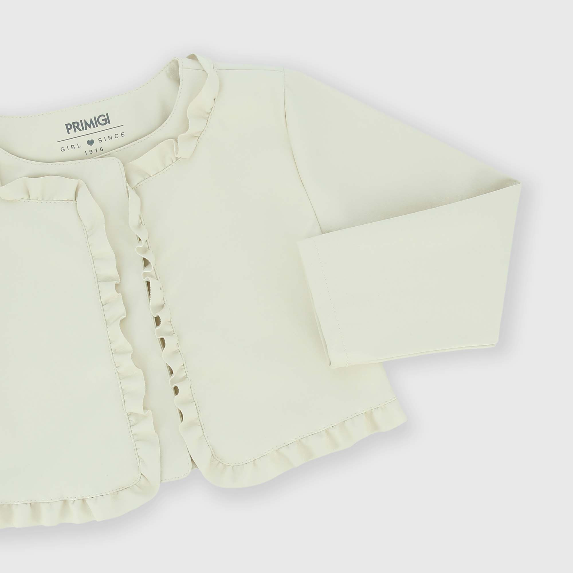 Faux leather jacket, round neckline, long sleeves. Snap button closure. Ruffles on the profiles. Lining.
