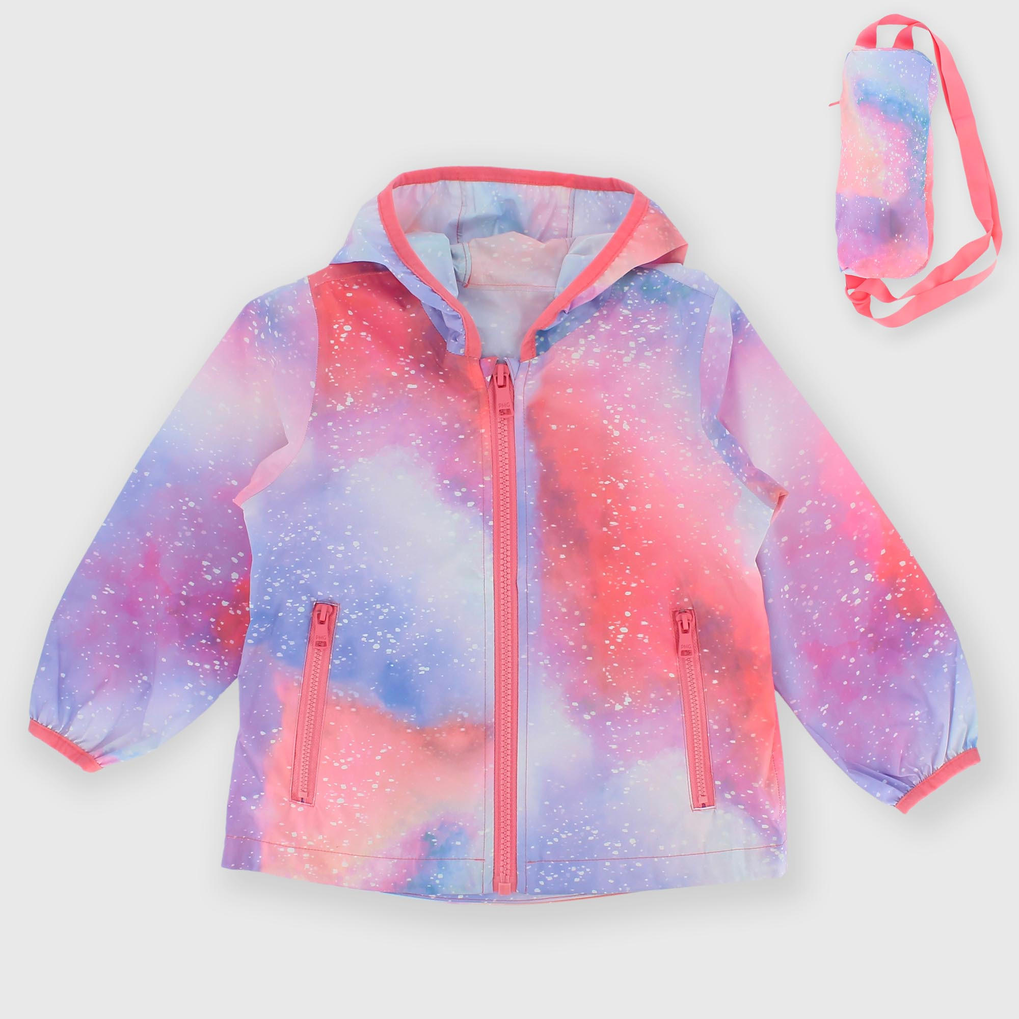 Printed nylon jacket with hood, long sleeves. Front zip closure. Heat-sealed internal seams. Zip pockets and elastic cuffs. Hidden zip on the back that allows you to close the backpack jacket.