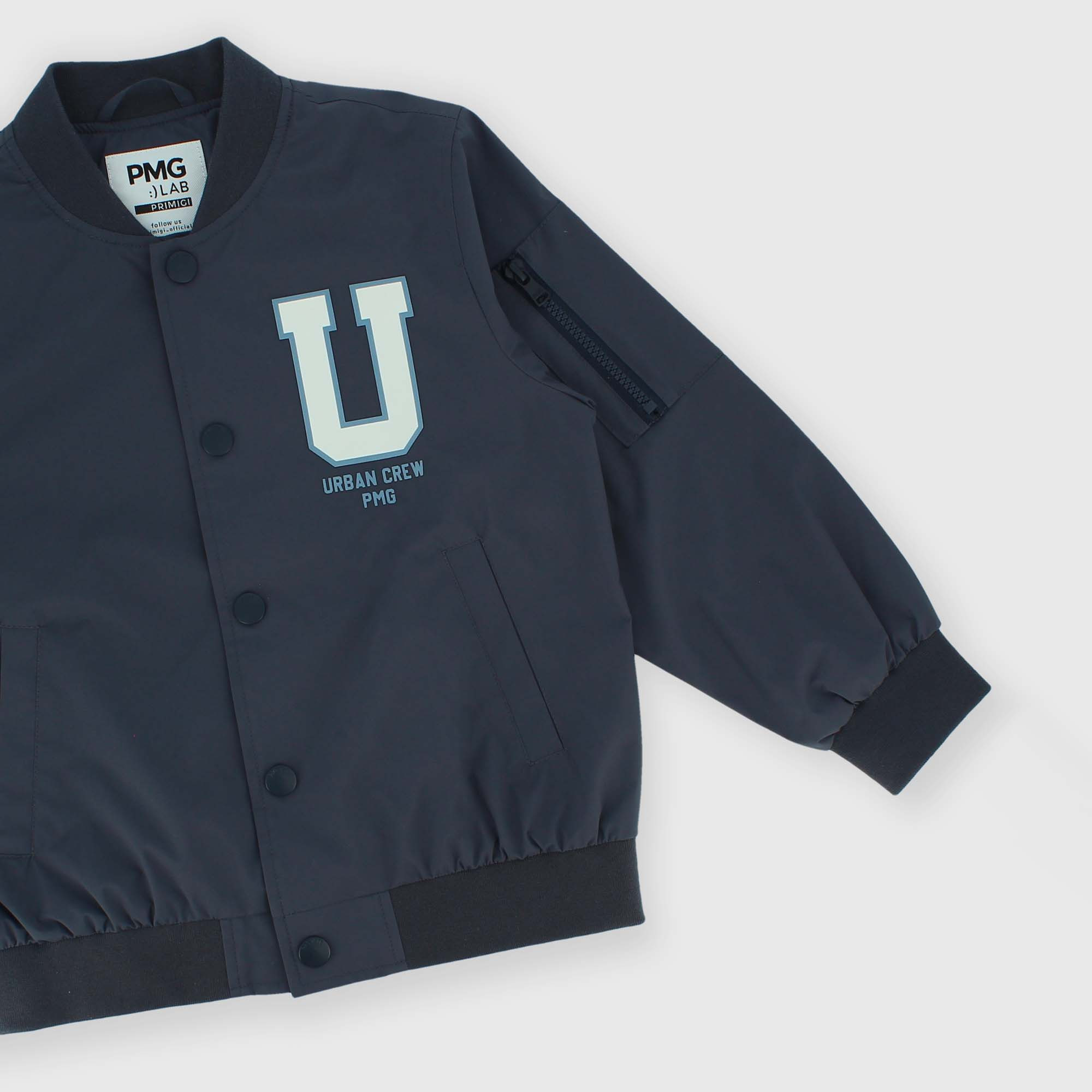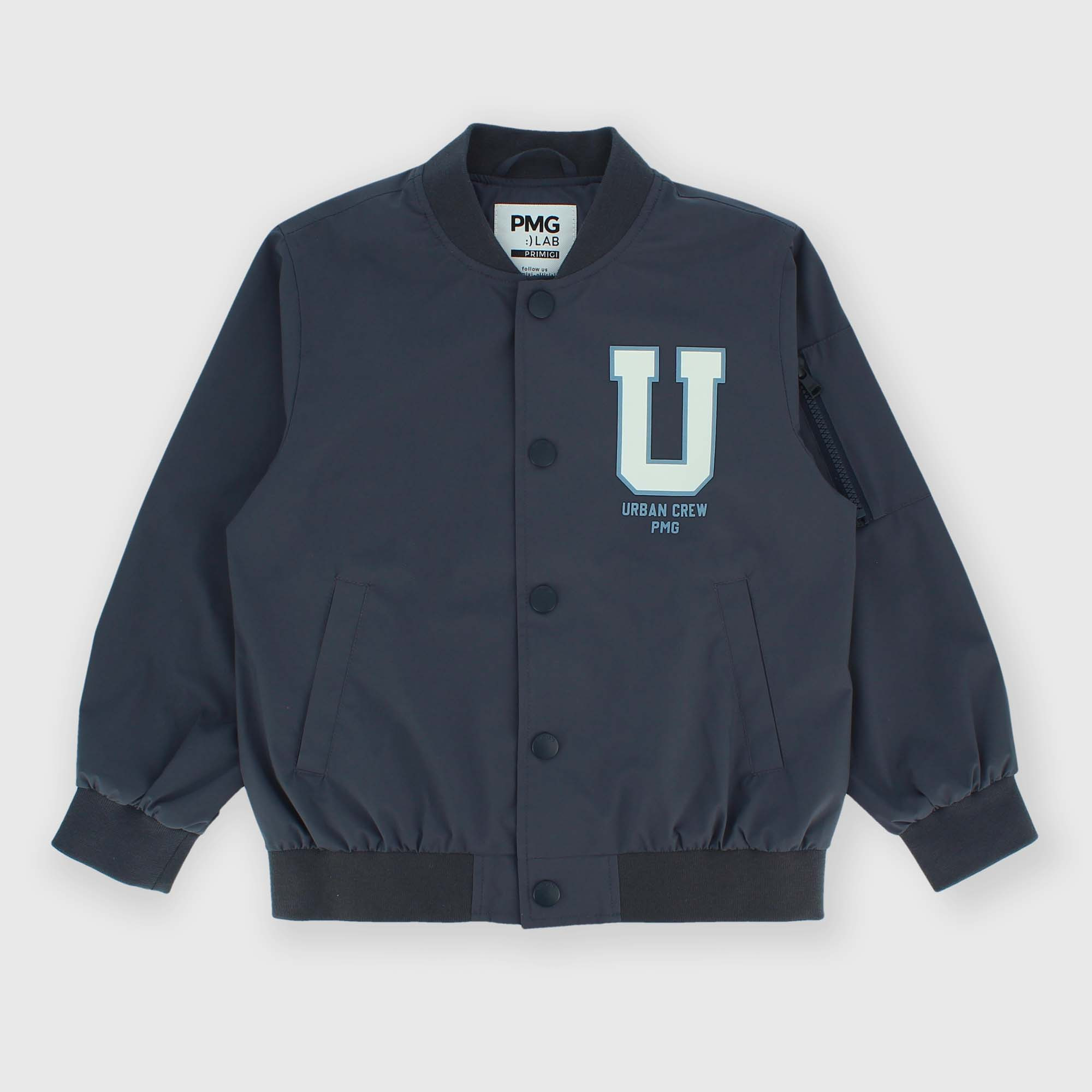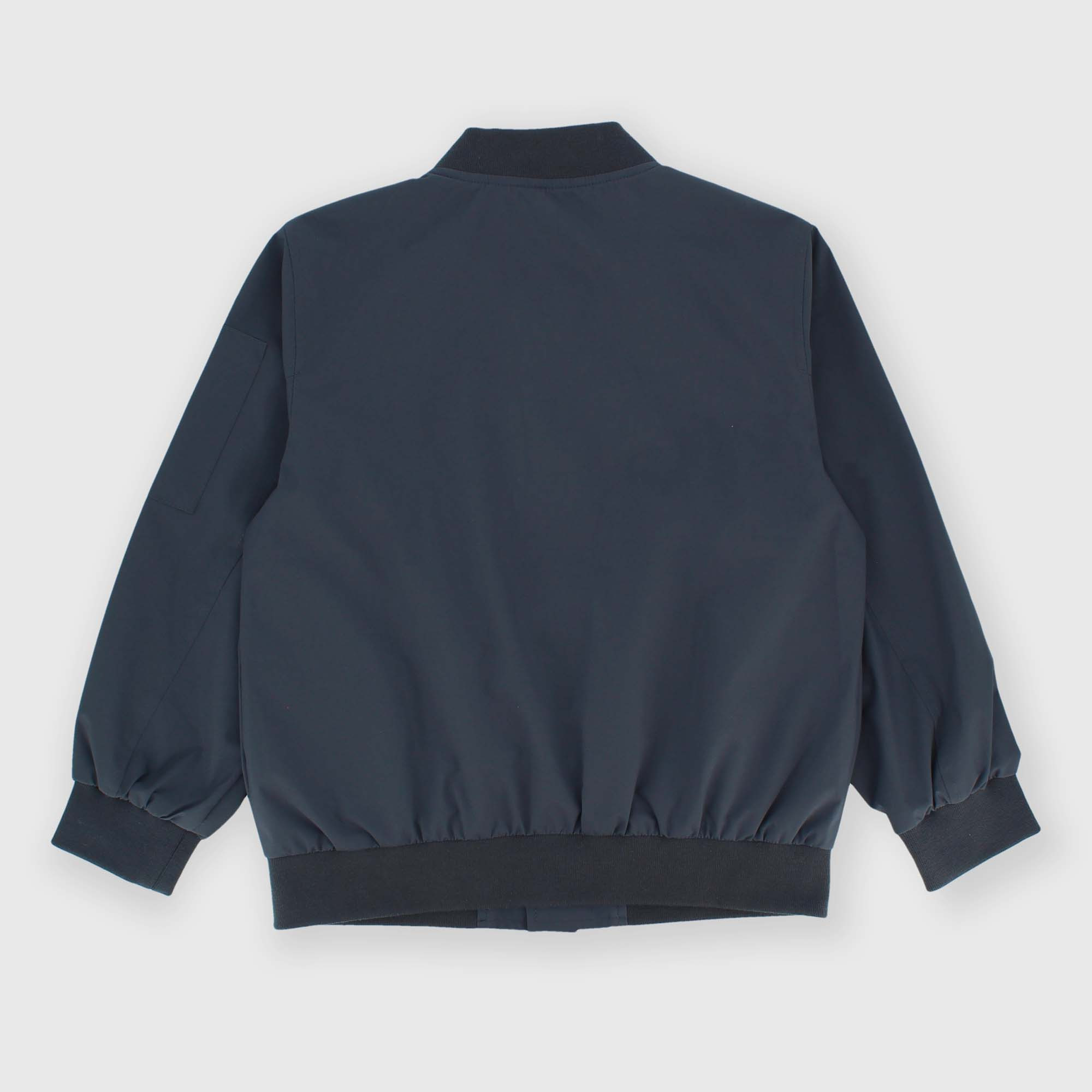 Nylon bomber jacket, with long sleeves. Ribbed collar, cuffs and hem. Front closure with snap buttons. Rubberized-effect print on the chest. Welt pockets on the front and zip patch pockets on the arm.