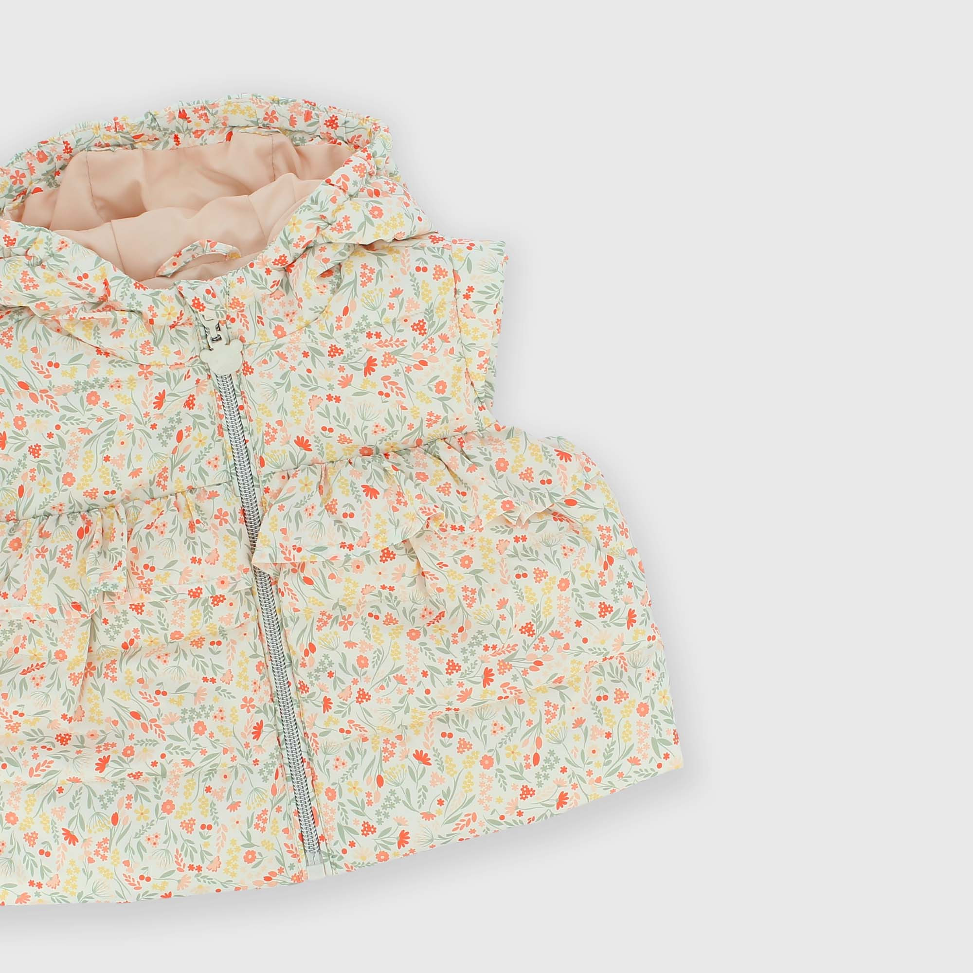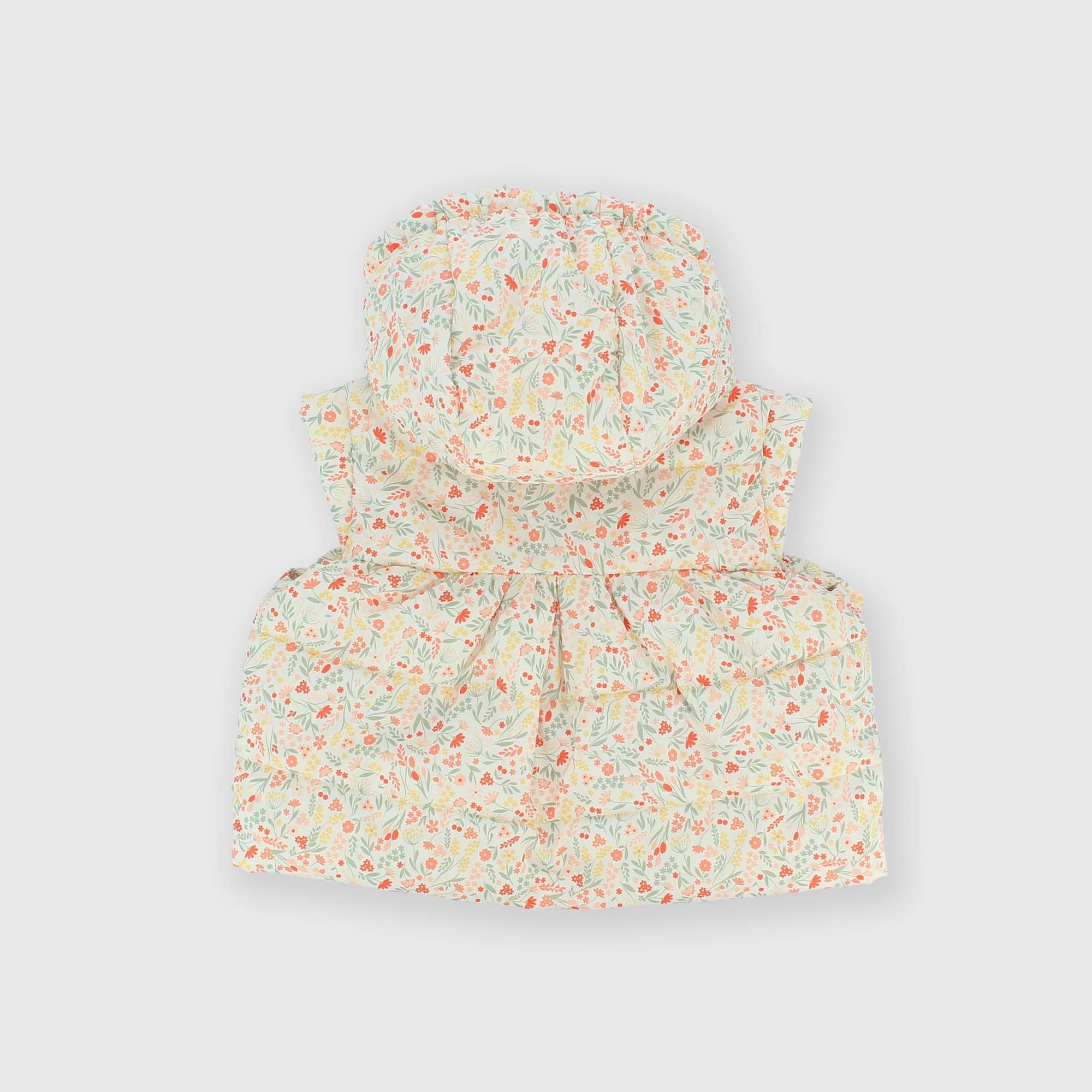 Printed nylon vest with hood. Zip closure and front gathering with flounce. Solid color inner lining.