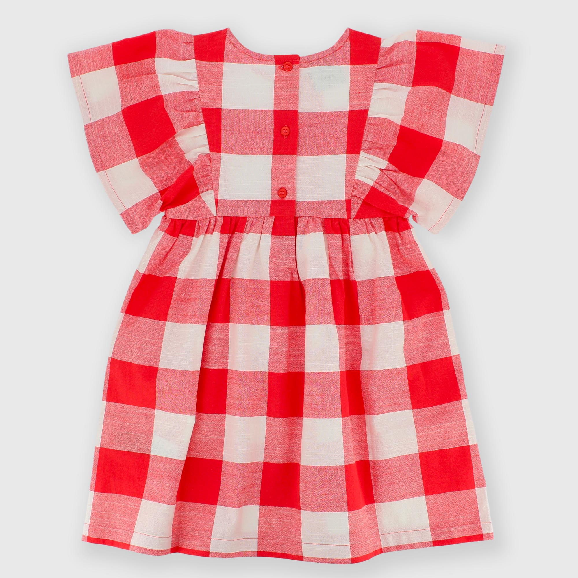 Checked cotton dress, crew neck, with wide short sleeves. Back closure with buttons.
