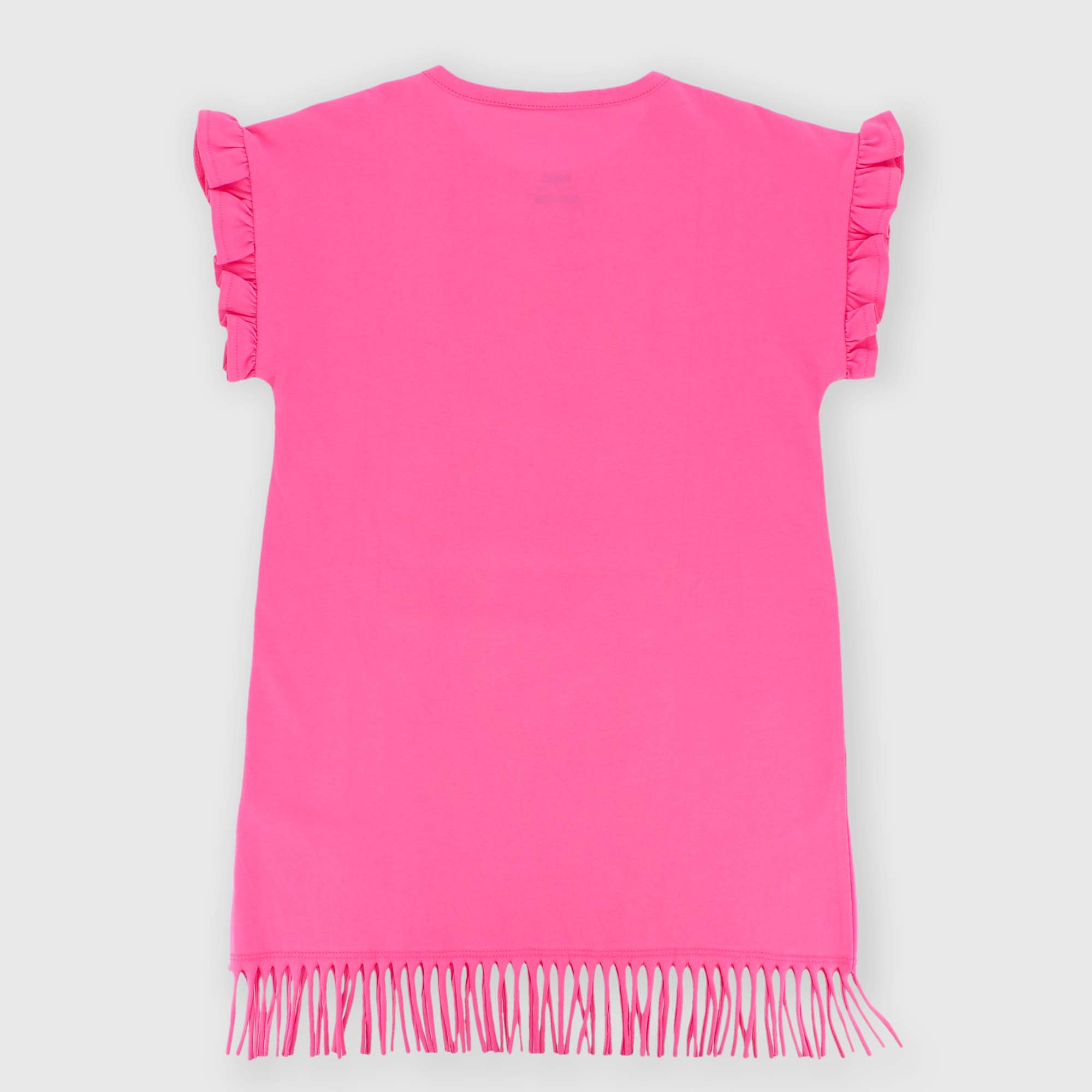 Jersey cover-up, crew neck, short-sleeved with ruffles. Unicorn print on the front. Bottom with small fringes.
