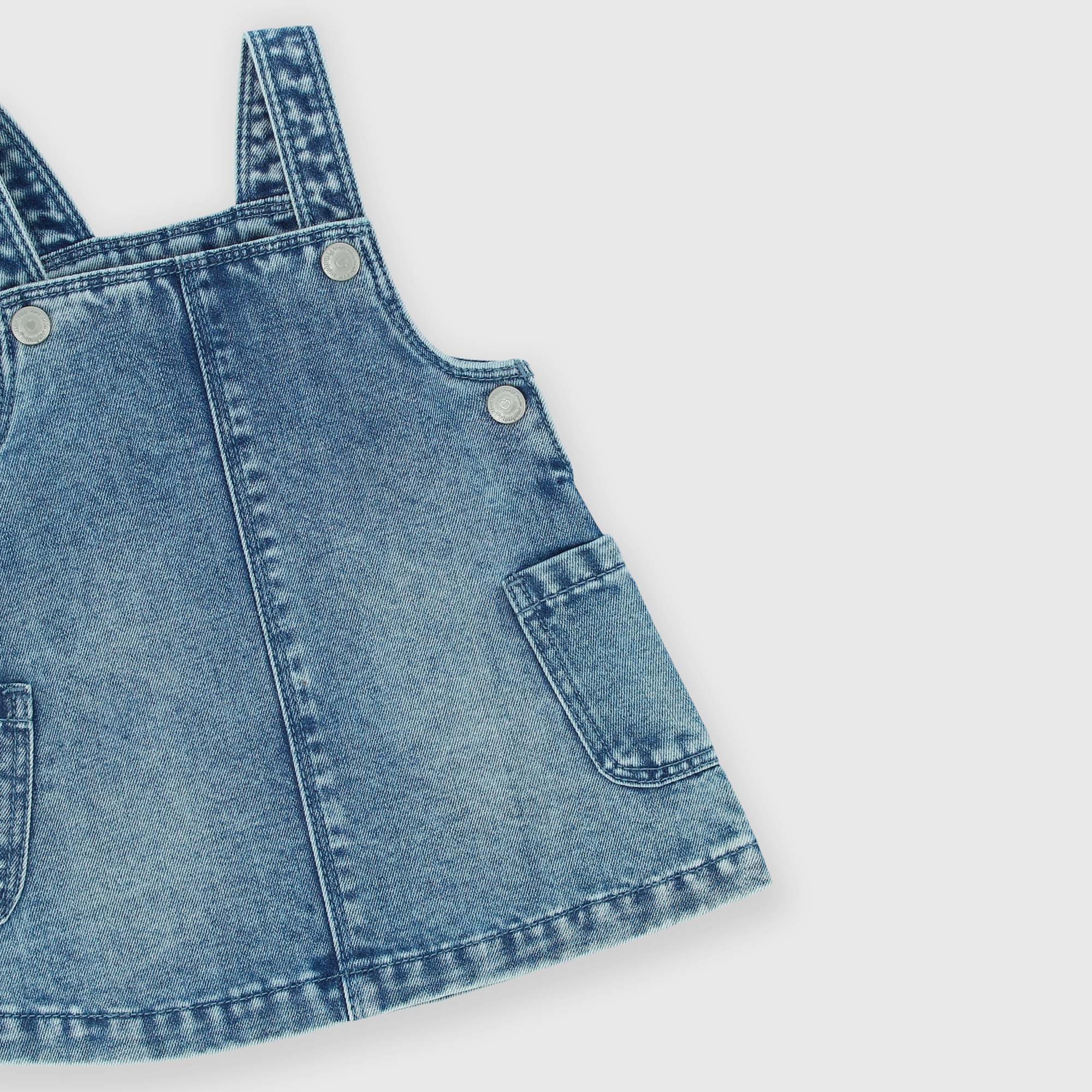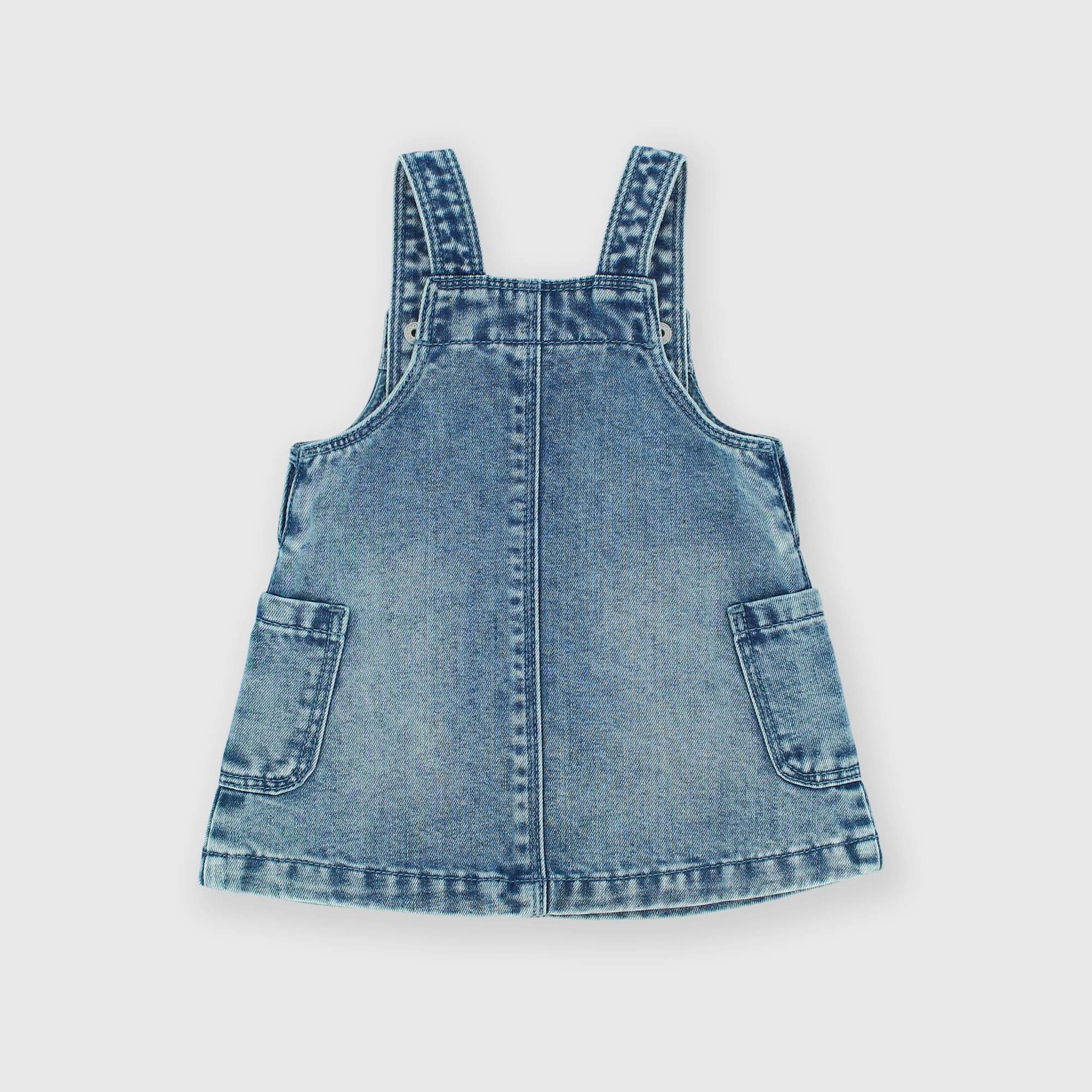 Denim overalls with snap buttons. Patch pockets on the sides.