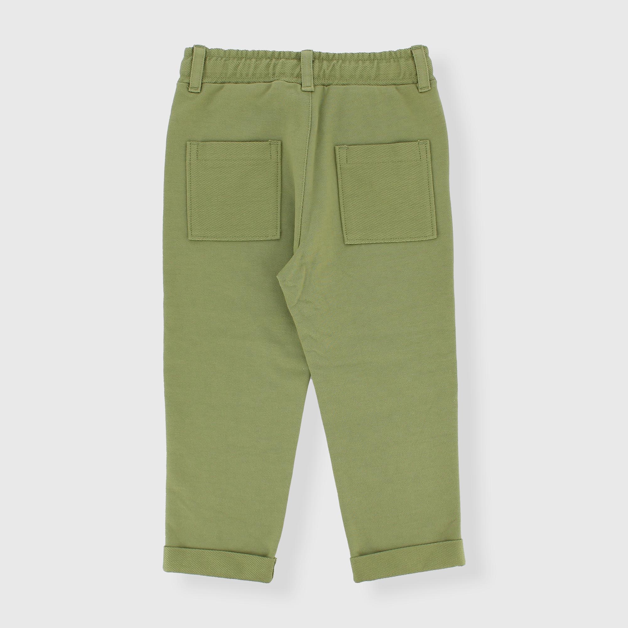 Garment-dyed fleece trousers with elasticated waistband, front laces and belt loops. Pockets on the front and patch pocket on the back. Flap bottom.