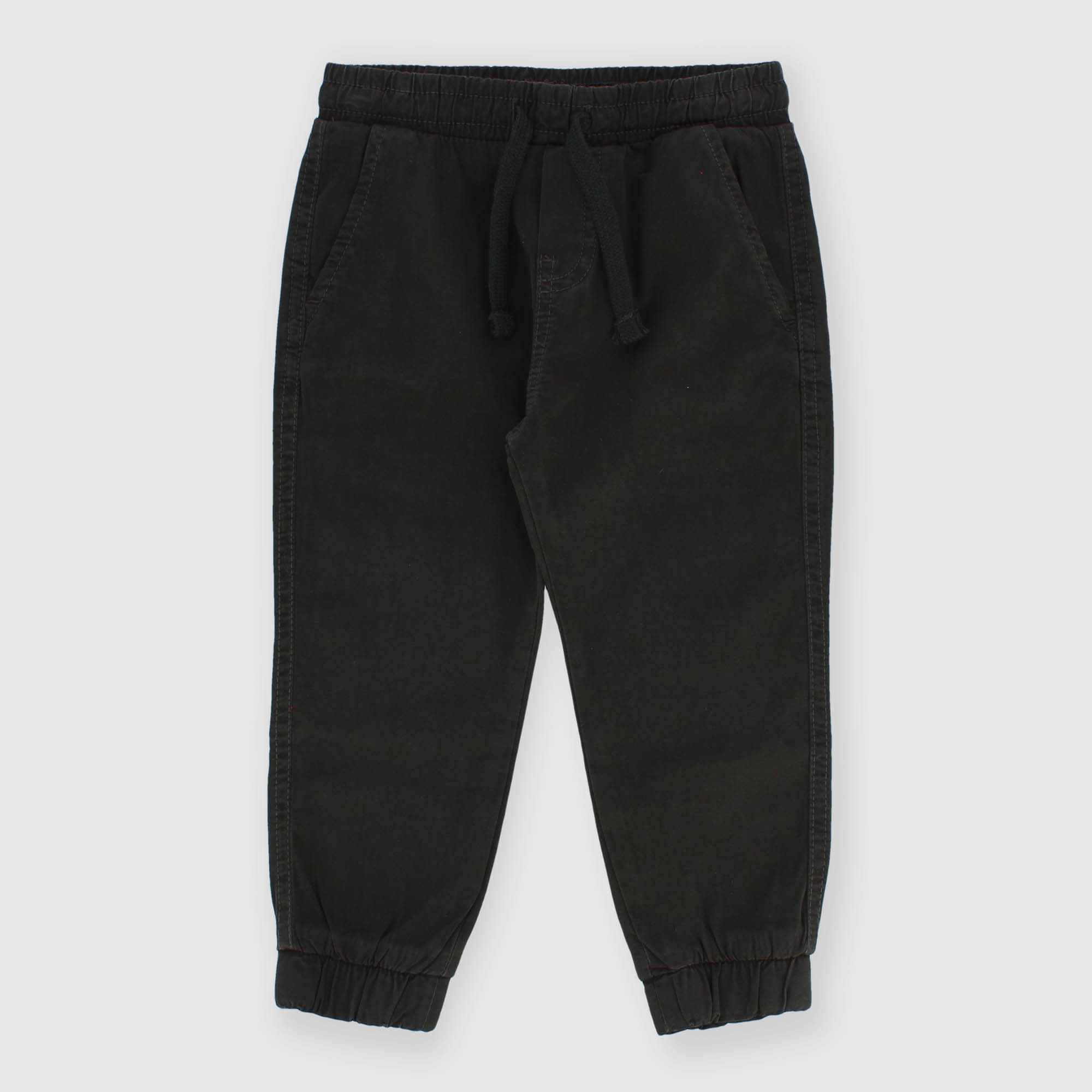 Garment-dyed gabardine trousers with elasticated waistband and front laces. French pockets on the front and patch pockets on the back. Elasticated bottom.