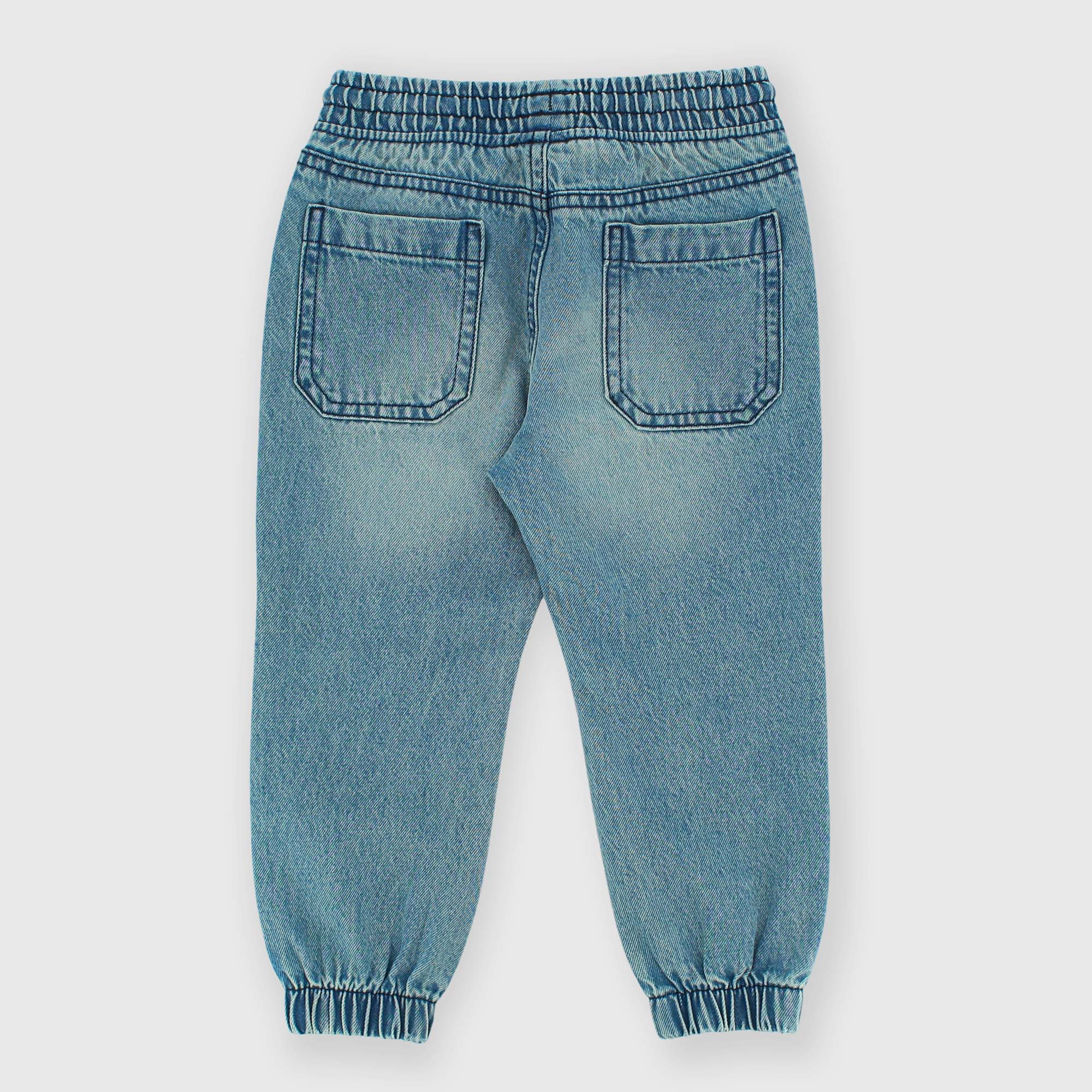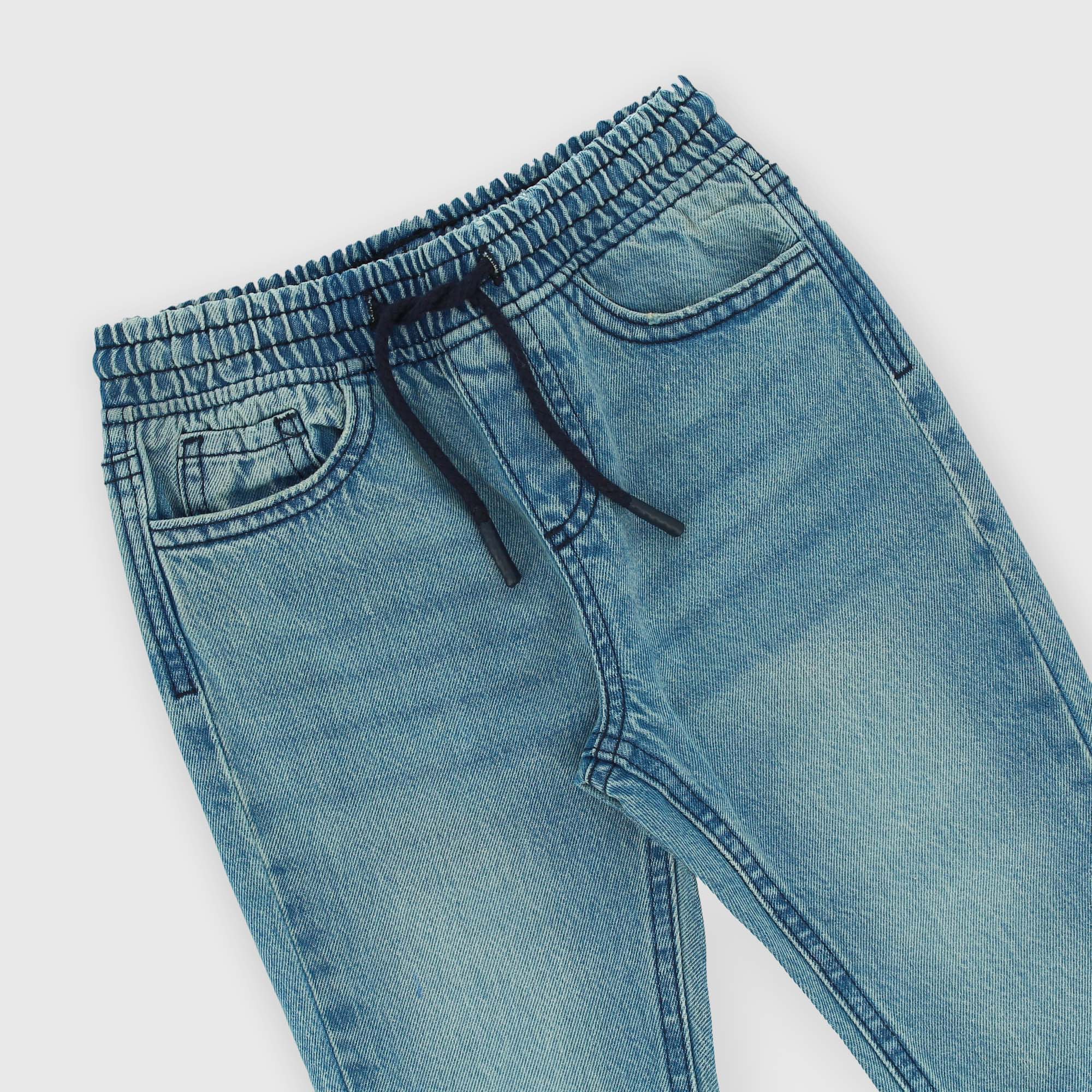 Denim trousers with elasticated waistband and front laces. Five pockets. Elasticated bottom.