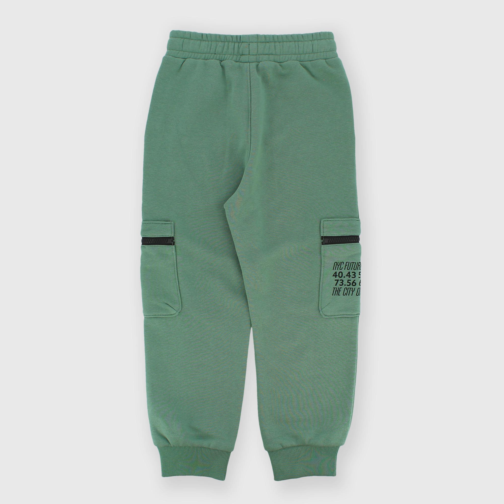 Fleece trousers with elasticated waistband and contrasting front laces. French pockets and side pockets with contrasting zip. Small print with lettering. Ribbed bottom.