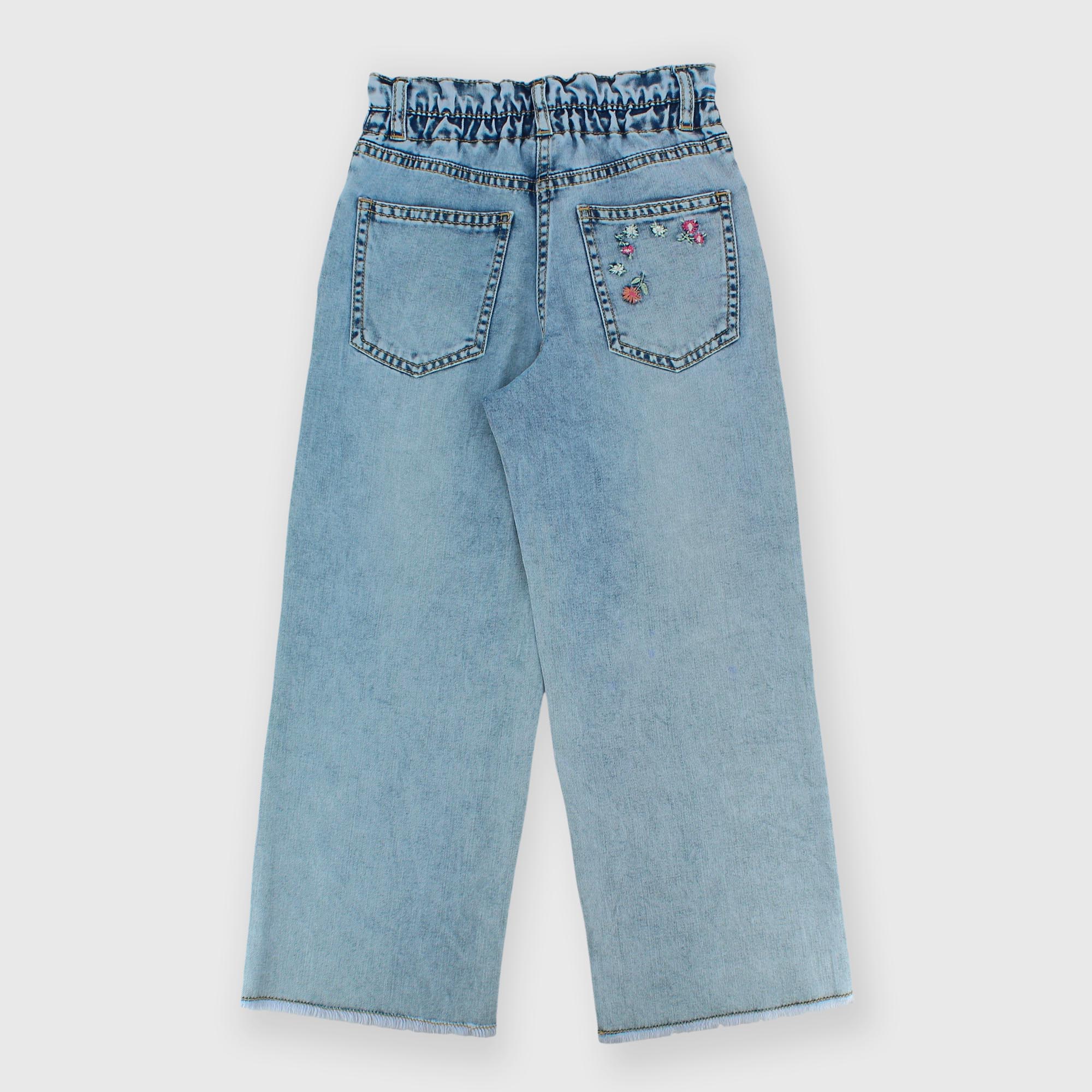 Wide leg denim trousers with elasticated waistband. Button and zip closure. Pockets on the front and patch pockets on the back. Embroidered flowers. Frayed hem.
