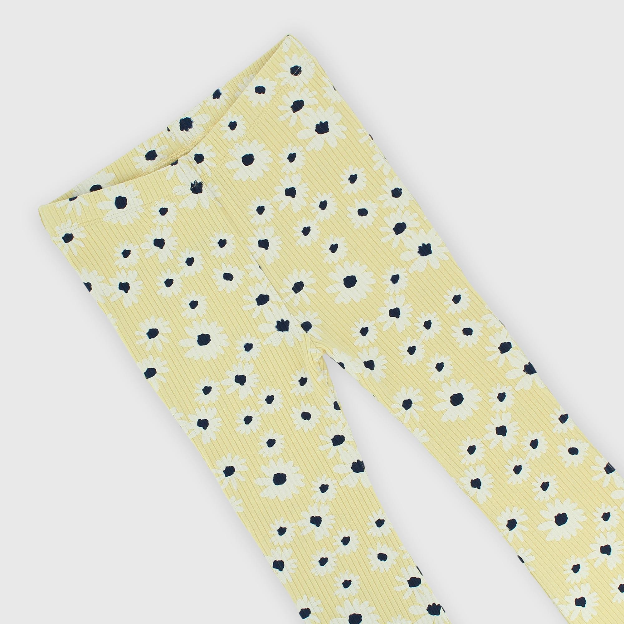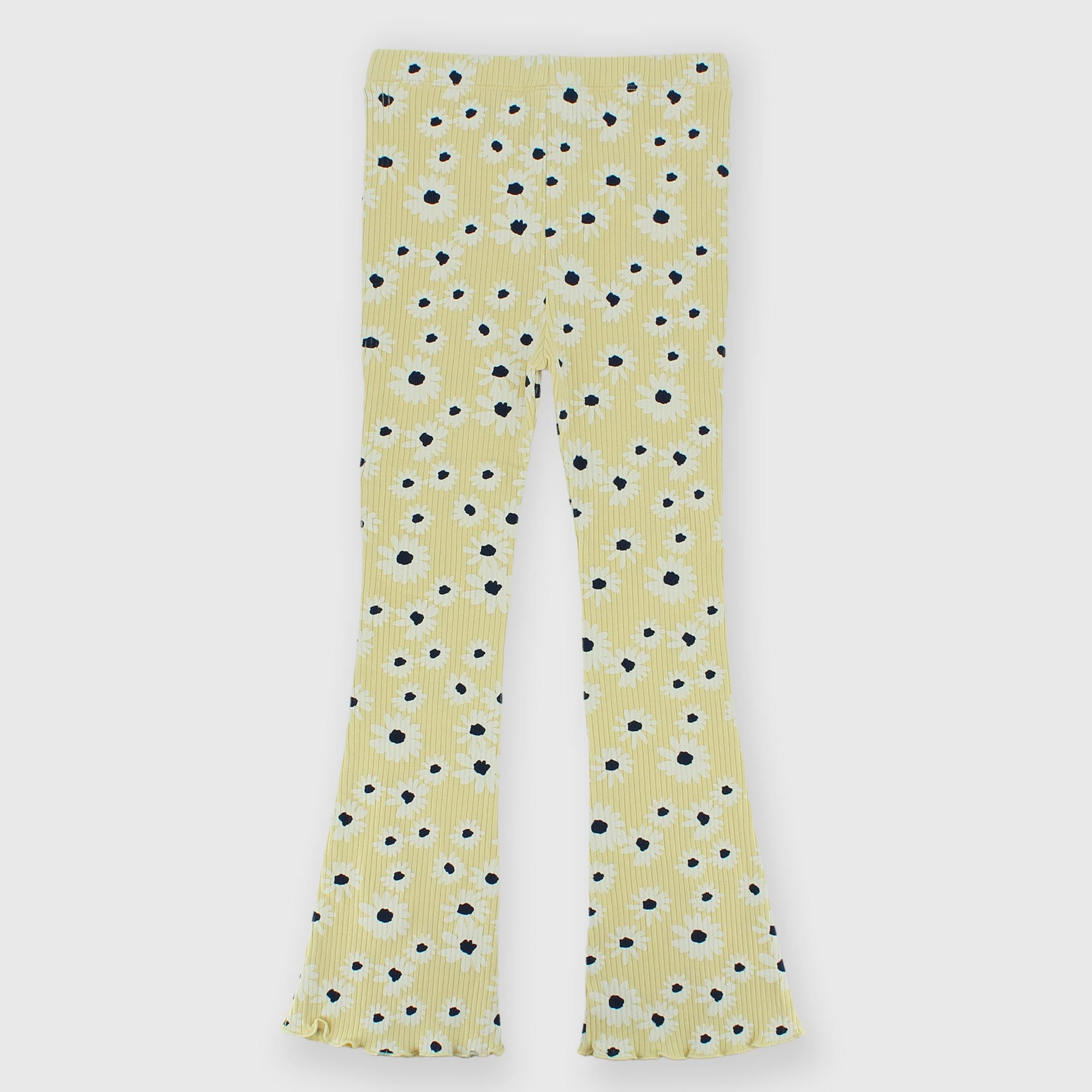 Ribbed bell leggings with elasticated waistband. All-over print with flowers. Doll stitch finishes.